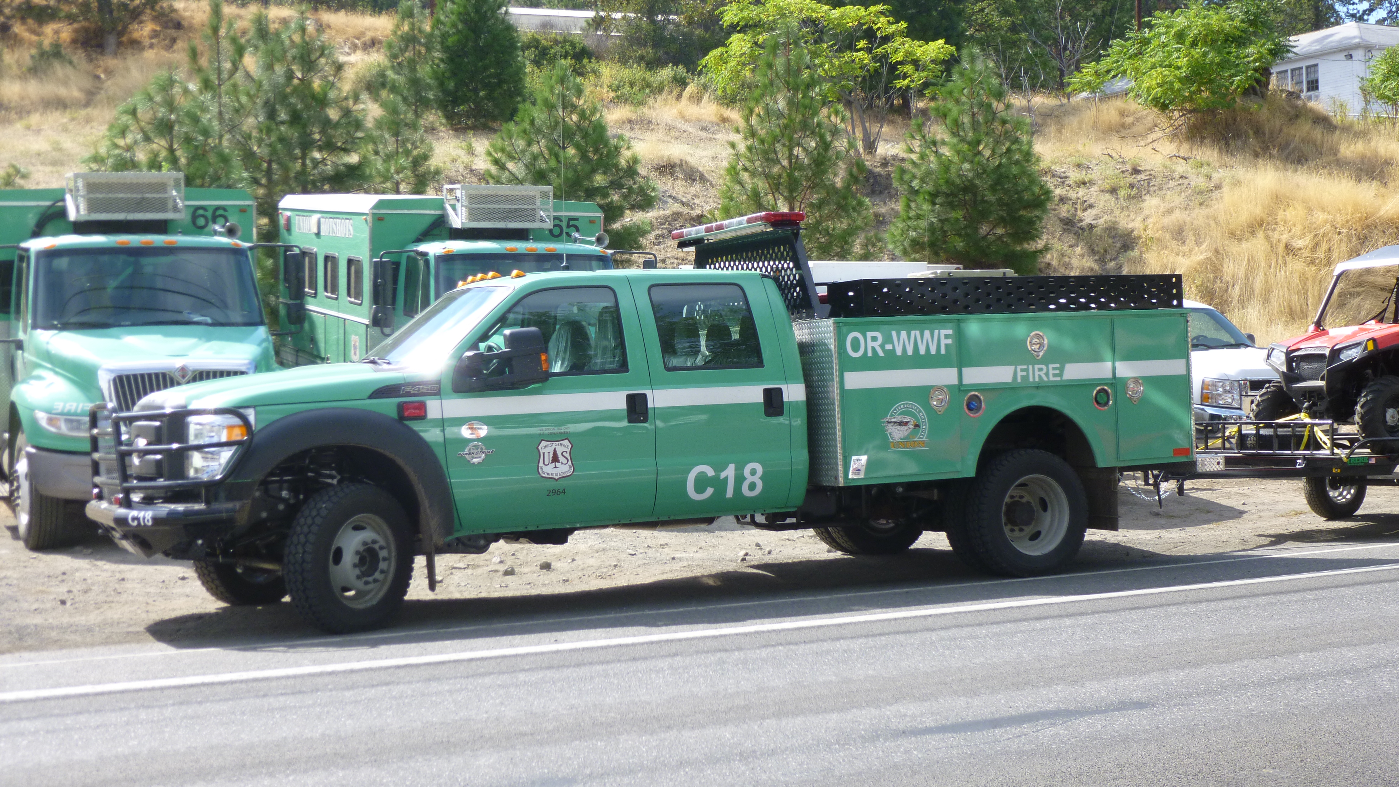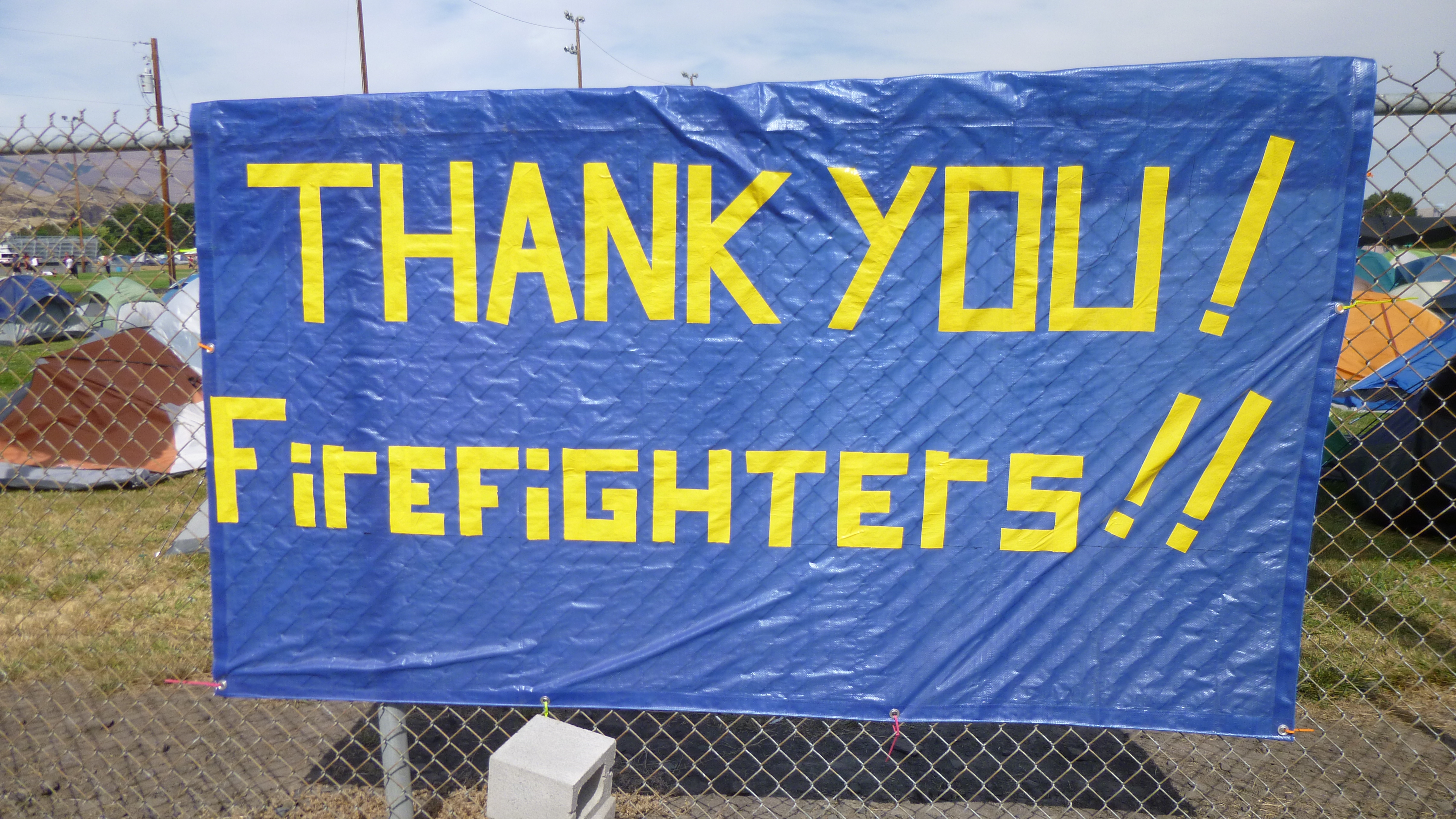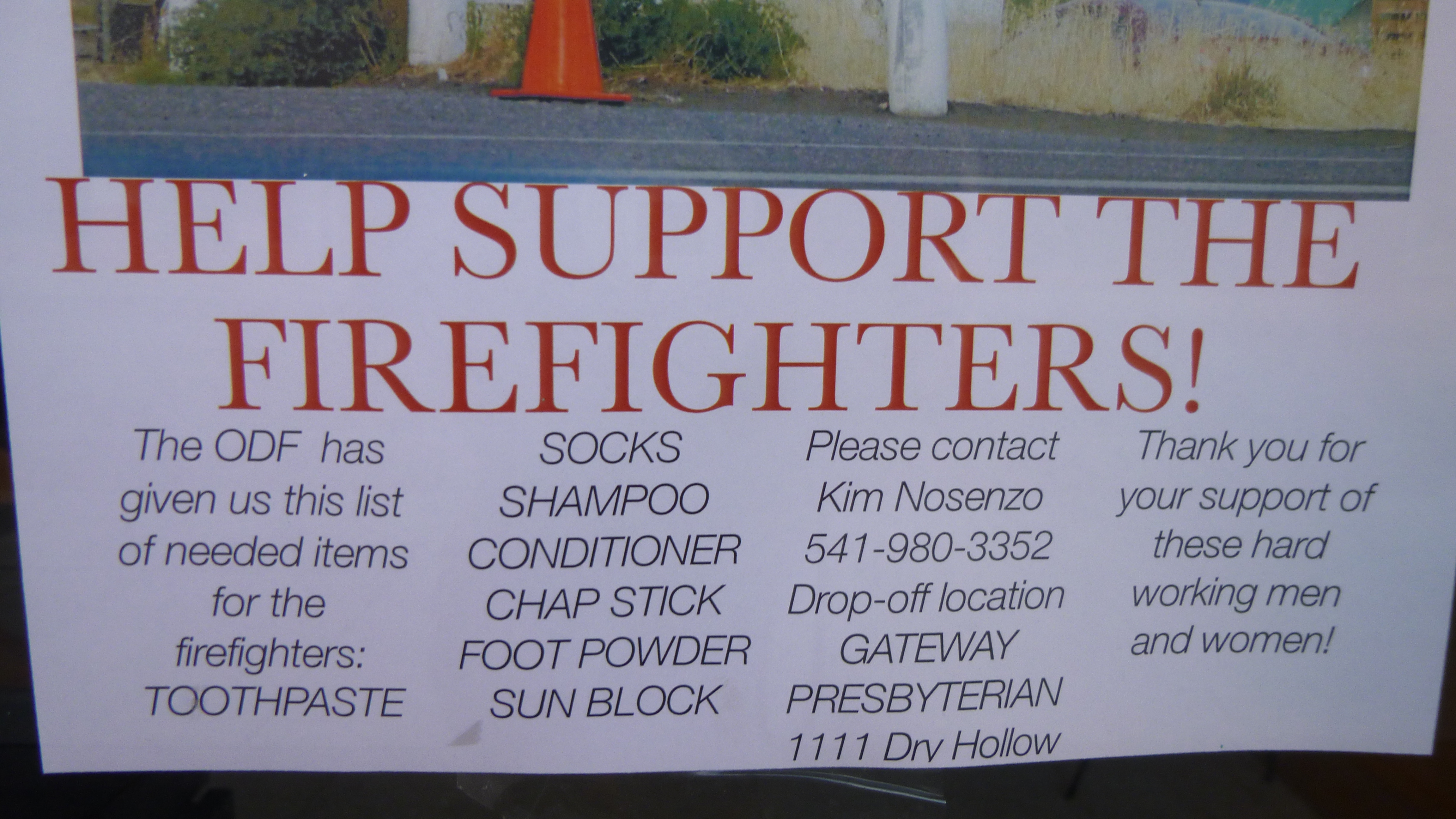 The winds were blowing away from town today, so there was no wildfire smoke like there had been yesterday (and there hadn’t been any smoke when I got to town in the late evening). I had been looking into donation opportunities, and I discovered that the Oregon Veterans Home was right here in The Dalles, so that was going to be my donation-of-the-day. As I set off to find the home on the other side of town, I passed a Red Cross sign that said “Disaster Relief”. I figured it was for the people who had to evacuate from their homes, and I stopped in to see if that could possibly be a wildfire sort of donation. The people there told me they were actually pretty well stocked and set up to help evacuees if necessary, but suggested I visit the firefighter base camp because they knew that some donations up there would be helpful. They gave me directions to the local high school, which was where the US Forestry Service had set up base camp, and it was quite a sight to see. It looked like a tent city – dozens and dozens of tents set up next to the football field, a mess tent and a kitchen trailer, other trailers, dozens of cases of water and soda stacked up, fire trucks and equipment, and people. I talked with someone by one of the big trailers in the center of the area, and asked what kinds of things were needed. There was plenty of food and water for the firefighters of course, but they seemed to be short on things like shampoo, soap, toothbrushes, toothpaste, and socks. So I decided to go to the dollar store and got lots of bottles of shampoo and bars of soap, some liquid hand soap, toothbrushes and toothpaste, and individual packages of hand wipes that I thought maybe they could stick in their pockets. I took the bags back to the base camp, and there was a table for donations from the public, which currently didn’t have anything on it. One of the firefighters helped me carry all the bags over to the table, and then he took a bar of soap and a bottle of shampoo. At first I just set the bags on the table and spread them out a bit, and was walking away, and all of a sudden quite a few other firefighters came over to the table to start looking through the bags. Most were walking away with shampoo and bar soap. I walked back to the table and took the rest of the items out of the bags so they could see what was there, and more firefighters came over. I asked them how things were going, but they didn’t know yet because they were just getting up. Since the fire is battled around the clock, the night crew has to try to sleep during the day, and it was hot, and all I could think of was trying to sleep in a stuffy hot tent under a blazing sun. I imagine they’re so exhausted when they get down from the fire that they sleep anyway. There were a few people bustling around the mess tent and kitchen getting ready for another meal. By the time I headed back to the van, the only thing left on the table was a couple bottles of liquid soap, and I wished I had just bought bar soap instead. The stuff vanished so quickly that it made me want to go back for more, but I was pretty sure other people bring things too. And during a later walk in town, I actually saw flyers on store windows asking people to help the firefighters with toiletry items. I’m glad I didn’t see those lists first, or I would have just put my donations in their collection boxes instead of visiting the base itself! It was really interesting to get a little taste of all the activity going on at a wildfire base camp. There were also several corners in town that had fire updates and maps, about who should be out of their homes now, who should be packing up and getting ready to leave, and who should be on alert.