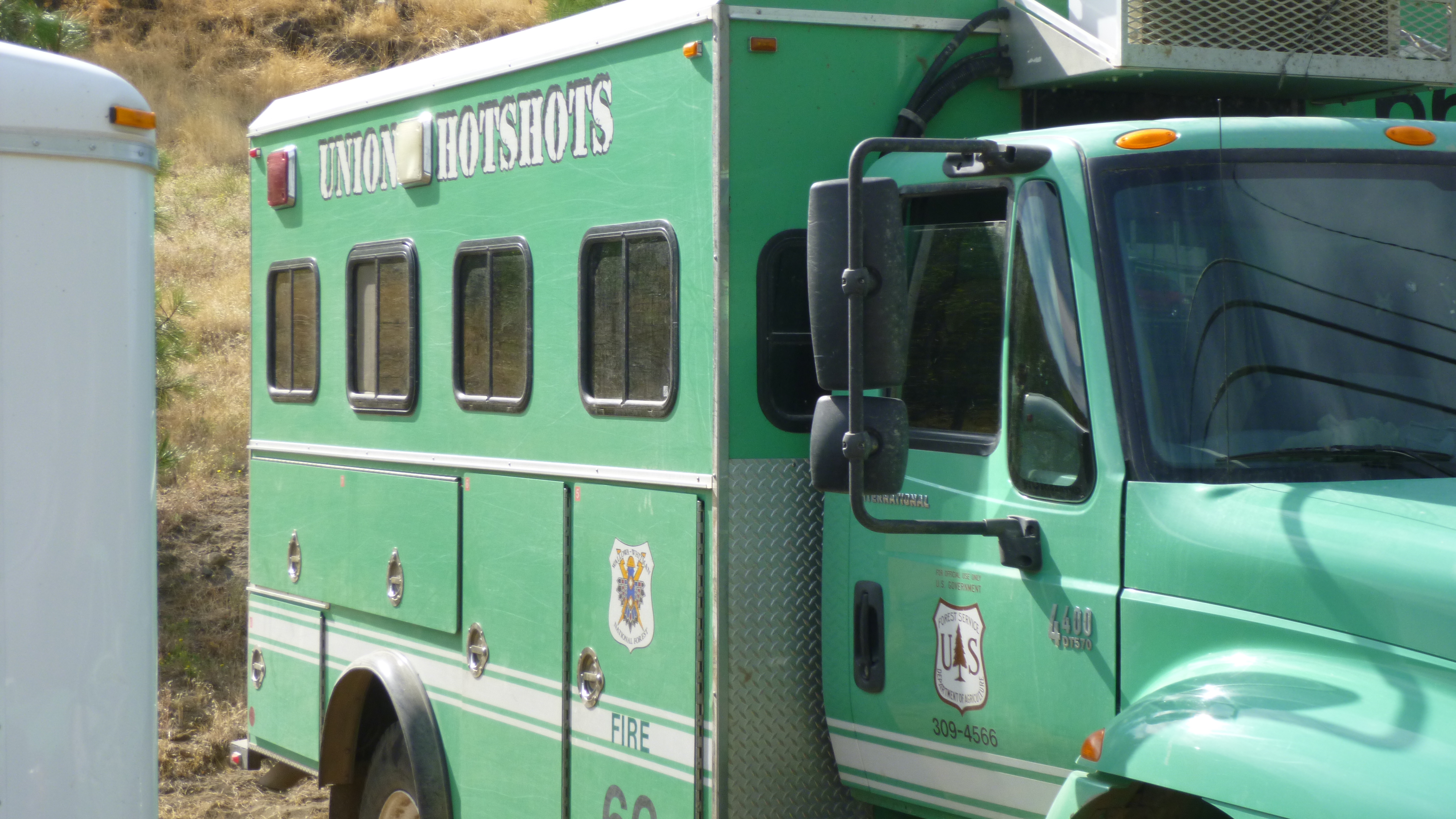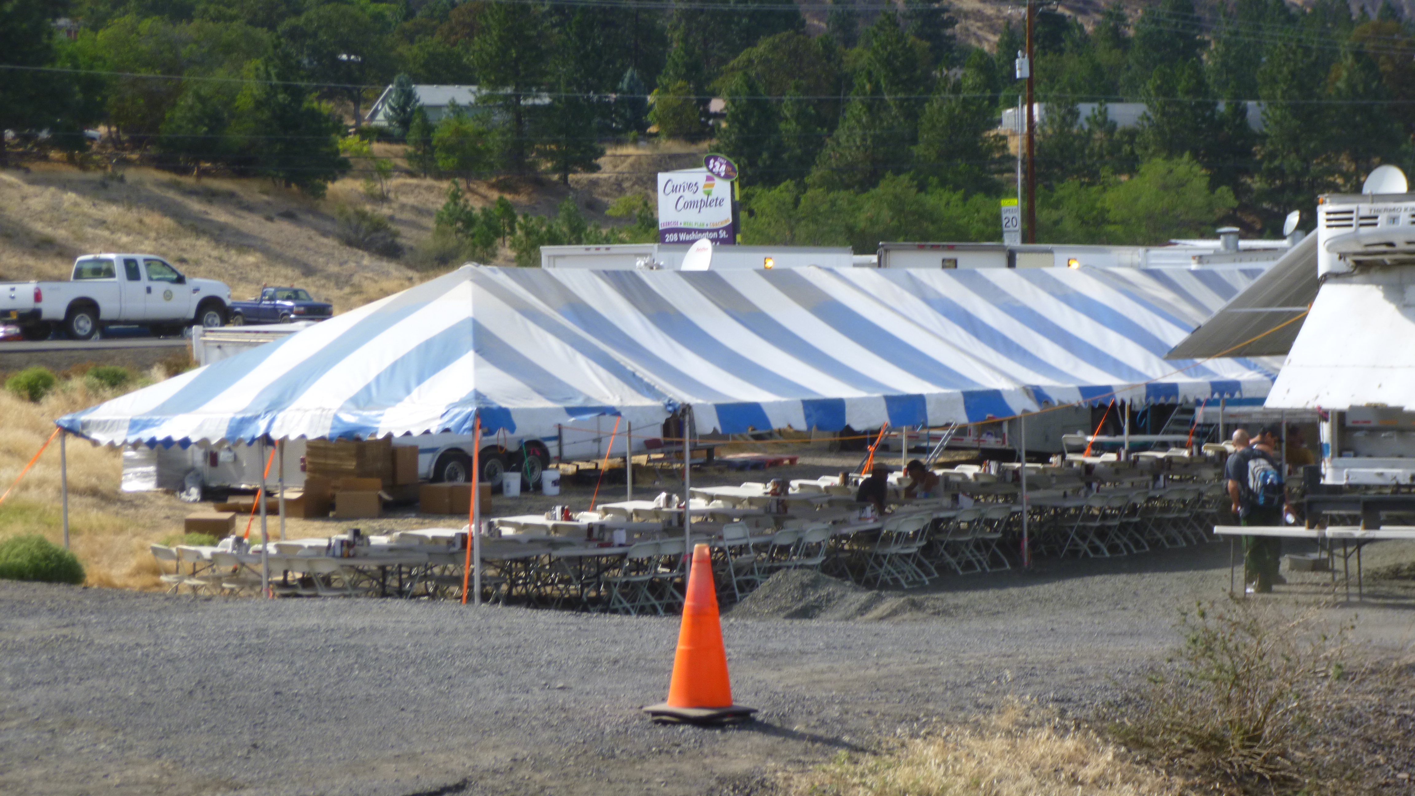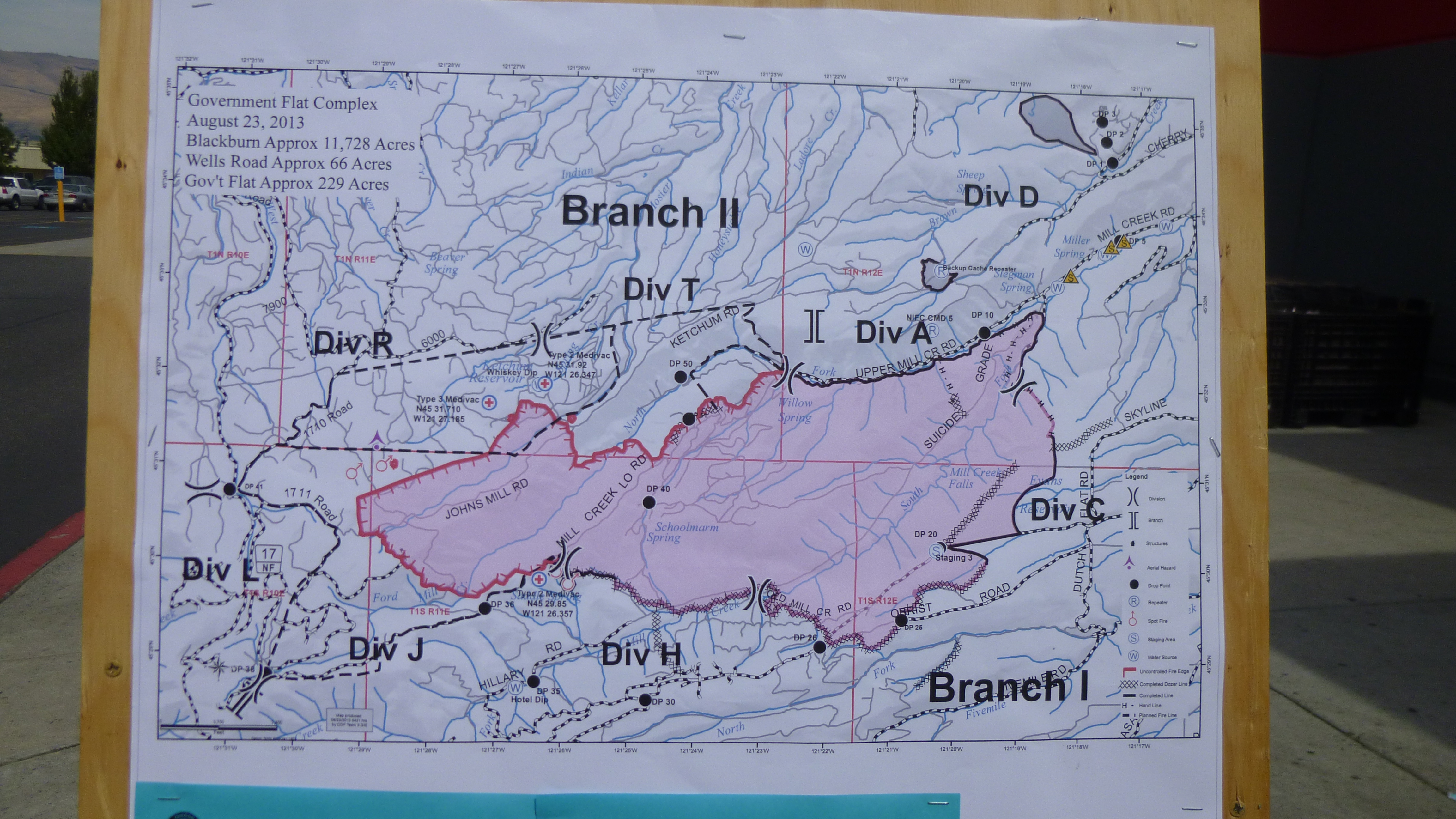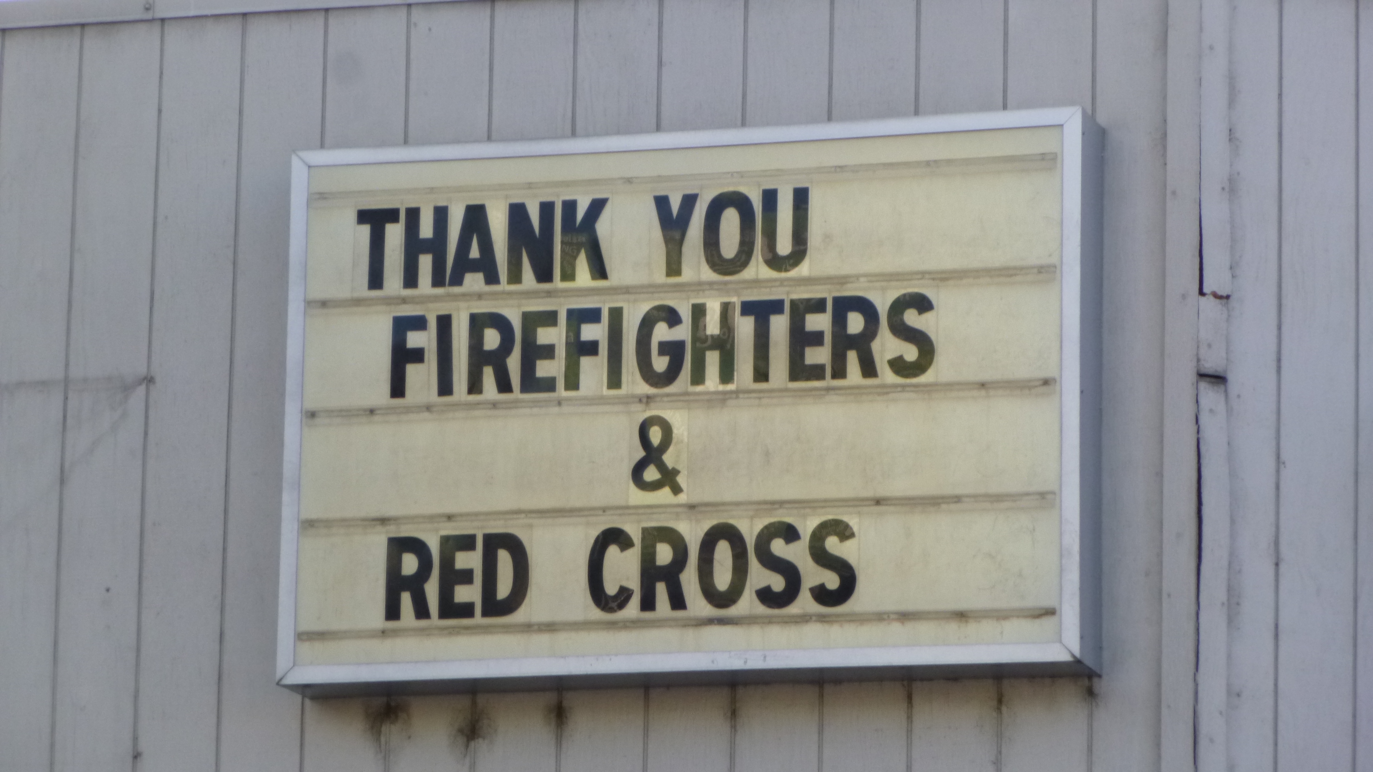 The winds were blowing away from town today, so there was no wildfire smoke like there had been yesterday (and there hadn’t been any smoke when I got to town in the late evening). I had been looking into donation opportunities, and I discovered that the Oregon Veterans Home was right here in The Dalles, so that was going to be my donation-of-the-day. As I set off to find the home on the other side of town, I passed a Red Cross sign that said “Disaster Relief”. I figured it was for the people who had to evacuate from their homes, and I stopped in to see if that could possibly be a wildfire sort of donation. The people there told me they were actually pretty well stocked and set up to help evacuees if necessary, but suggested I visit the firefighter base camp because they knew that some donations up there would be helpful. They gave me directions to the local high school, which was where the US Forestry Service had set up base camp, and it was quite a sight to see. It looked like a tent city – dozens and dozens of tents set up next to the football field, a mess tent and a kitchen trailer, other trailers, dozens of cases of water and soda stacked up, fire trucks and equipment, and people. I talked with someone by one of the big trailers in the center of the area, and asked what kinds of things were needed. There was plenty of food and water for the firefighters of course, but they seemed to be short on things like shampoo, soap, toothbrushes, toothpaste, and socks. So I decided to go to the dollar store and got lots of bottles of shampoo and bars of soap, some liquid hand soap, toothbrushes and toothpaste, and individual packages of hand wipes that I thought maybe they could stick in their pockets. I took the bags back to the base camp, and there was a table for donations from the public, which currently didn’t have anything on it. One of the firefighters helped me carry all the bags over to the table, and then he took a bar of soap and a bottle of shampoo. At first I just set the bags on the table and spread them out a bit, and was walking away, and all of a sudden quite a few other firefighters came over to the table to start looking through the bags. Most were walking away with shampoo and bar soap. I walked back to the table and took the rest of the items out of the bags so they could see what was there, and more firefighters came over. I asked them how things were going, but they didn’t know yet because they were just getting up. Since the fire is battled around the clock, the night crew has to try to sleep during the day, and it was hot, and all I could think of was trying to sleep in a stuffy hot tent under a blazing sun. I imagine they’re so exhausted when they get down from the fire that they sleep anyway. There were a few people bustling around the mess tent and kitchen getting ready for another meal. By the time I headed back to the van, the only thing left on the table was a couple bottles of liquid soap, and I wished I had just bought bar soap instead. The stuff vanished so quickly that it made me want to go back for more, but I was pretty sure other people bring things too. And during a later walk in town, I actually saw flyers on store windows asking people to help the firefighters with toiletry items. I’m glad I didn’t see those lists first, or I would have just put my donations in their collection boxes instead of visiting the base itself! It was really interesting to get a little taste of all the activity going on at a wildfire base camp. There were also several corners in town that had fire updates and maps, about who should be out of their homes now, who should be packing up and getting ready to leave, and who should be on alert.