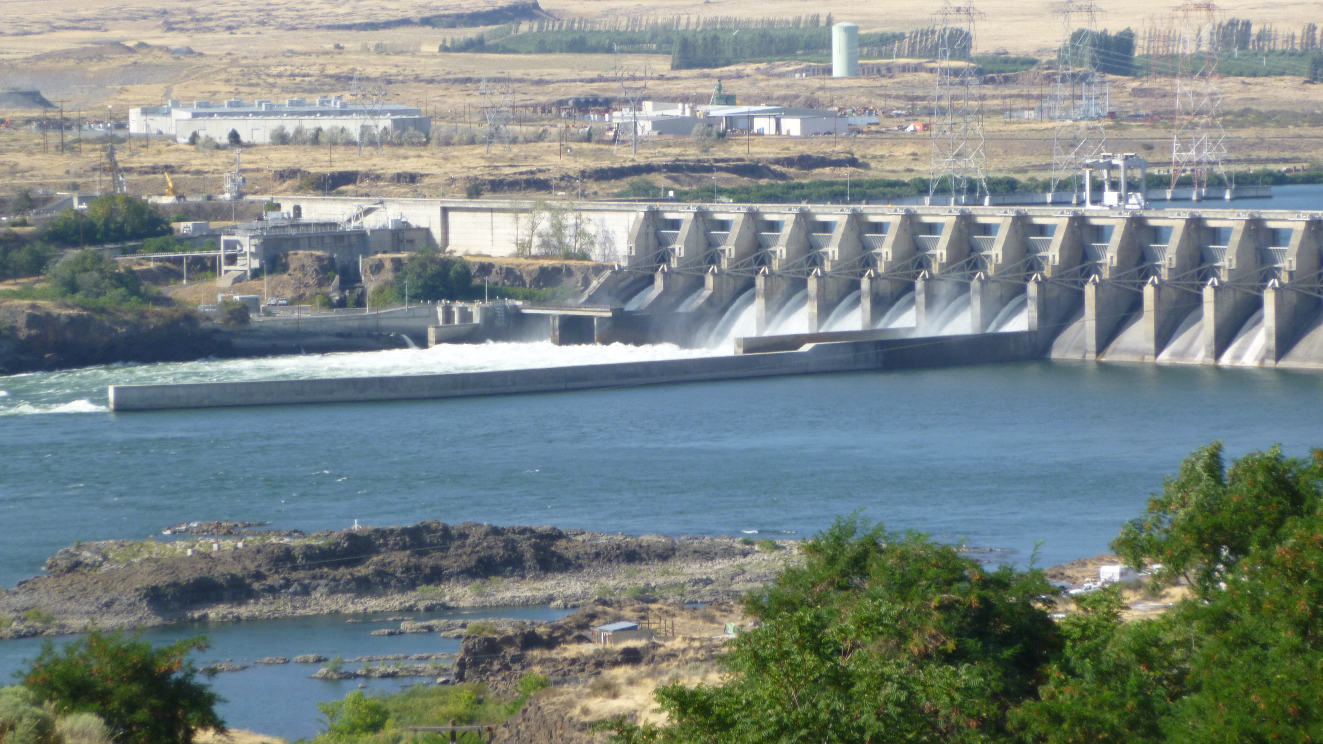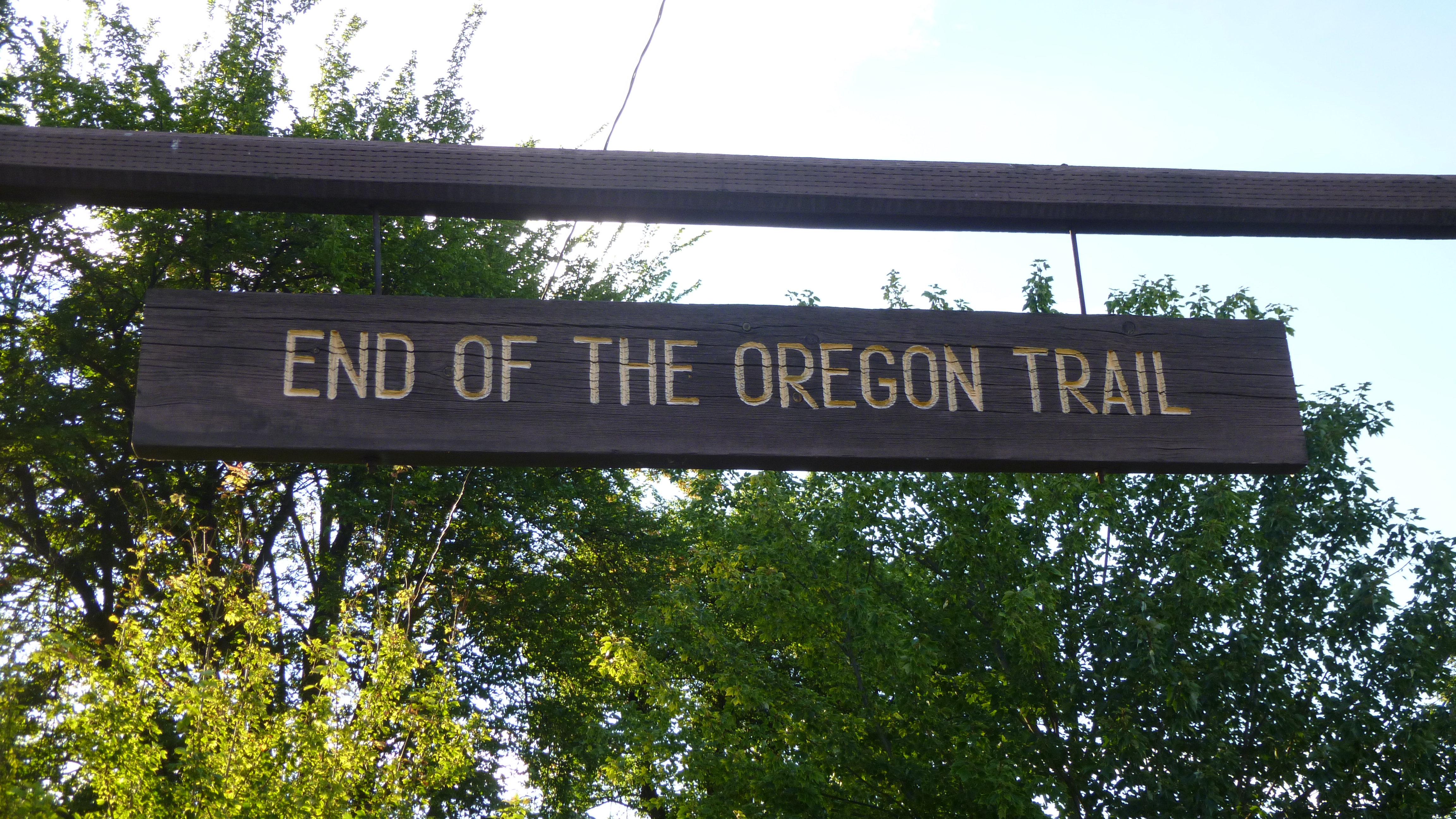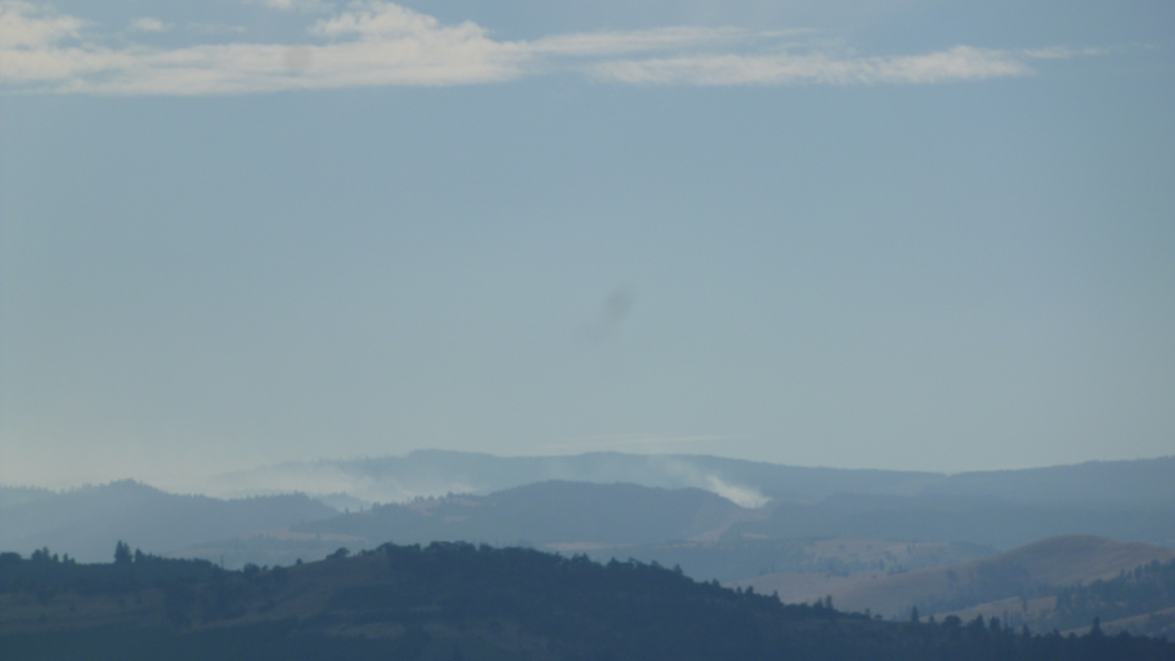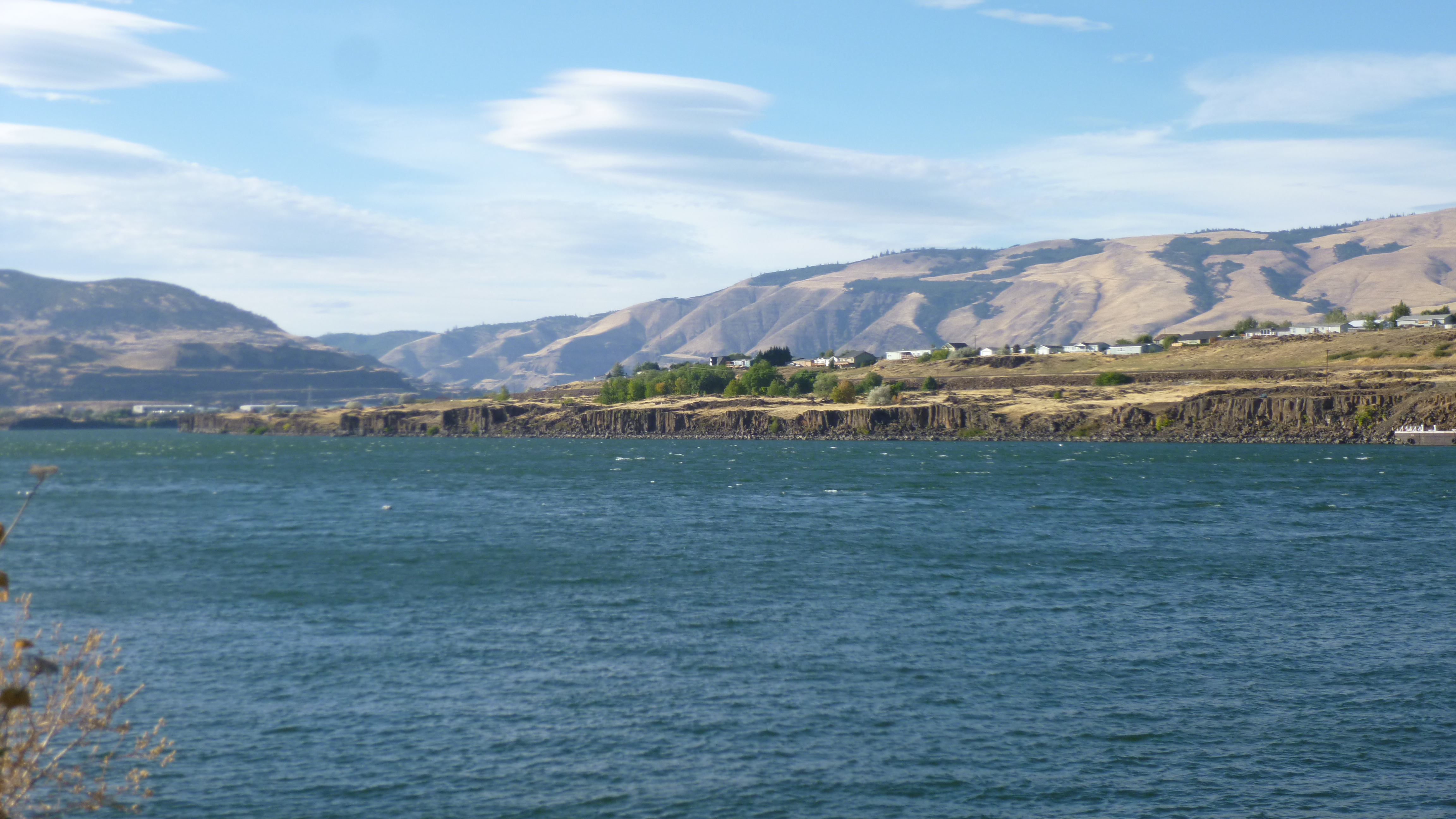 And then I finally resumed my interrupted quest to find the Veteran’s Home. It was located outside of town, up high on the side of a mountain where they had a good view of the river and the dam, and the surrounding mountains. This was the first time I could see the smoke from the wildfire a few ridges over. I went in and made my donation, and they told me I could specify where the donation went, so it will help with a recreational outing. I took Tula our for a walk to look at all the smoke in the distance. Even though the fire was only 10-12 miles away from town, people were very matter-of-fact about it – I would have thought it would be really scary to be so close to one – and although the fires consume a lot of land, it’s not like they rage along at 100 miles an hour, and maybe that’s why the people aren’t as nervous about it as I would have expected. If someone had told me at the start of my journey that I would spend time in a town that close to a major wildfire, I wouldn’t have thought that would be possible, because I imagined the whole town would have been evacuated. It makes me curious how close the fires get before people are ordered to evacuate. Then I drove back down the mountain, and we found the river walk, and covered a couple miles along that. I noticed several helicopters flying back and forth with something that looked like a big orange ball dangling from a cable, and it would hover out of sight by the river (filling the “ball” with water??) and then fly back toward the fire. I put Tula back in the van and walked a couple more miles throughout the town and a couple neighborhoods. There were numerous signs around town thanking the firefighters for their hard work. Somewhere along the ay I passed a little park that had a sign over the entrance that said “End of the Oregon Trail.” I went in the park but the only thing I saw was a large boulder commemorating the spot. I imagine at this point, settlers started peeling off in different areas of Oregon to settle into their new lives.