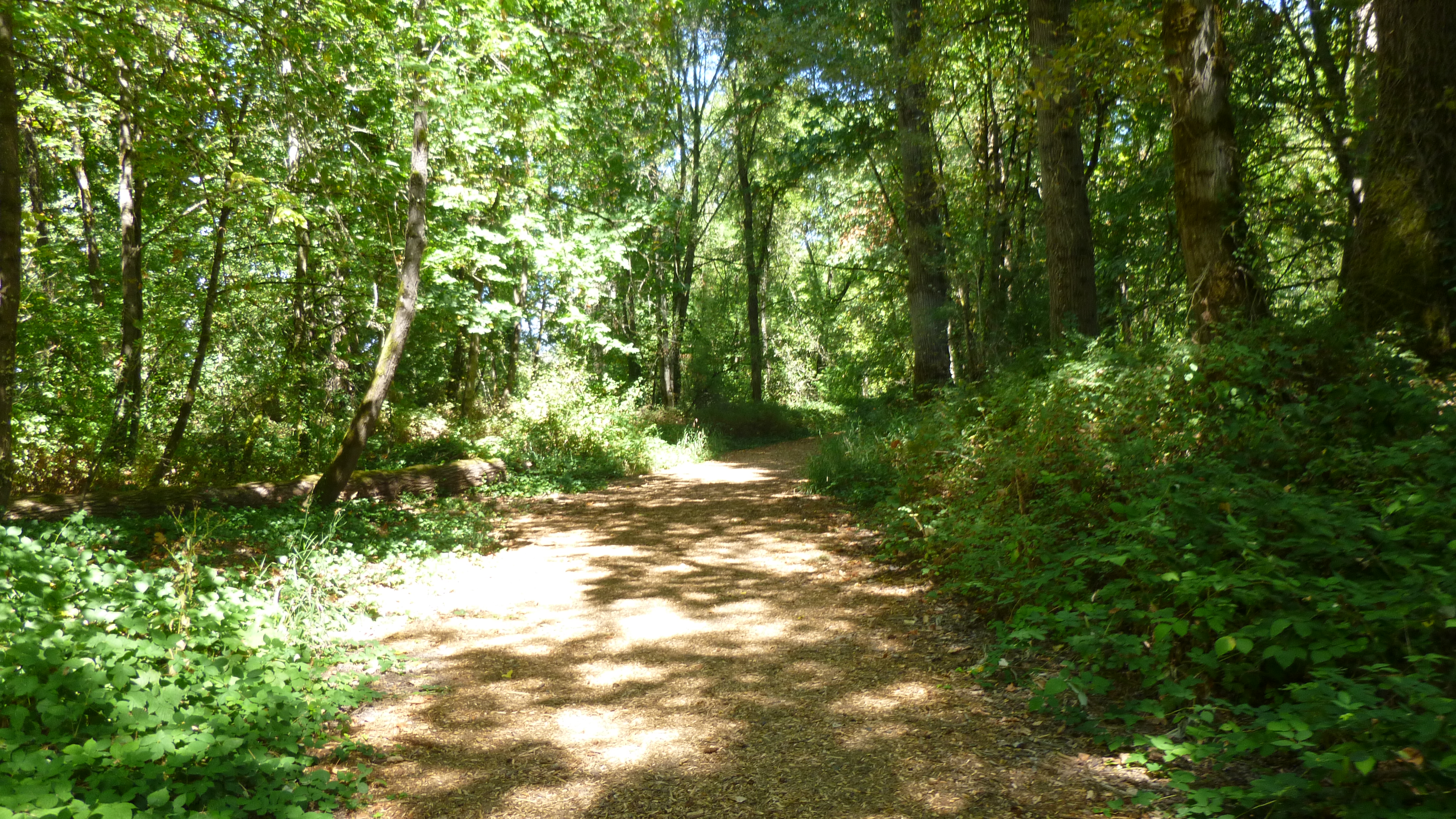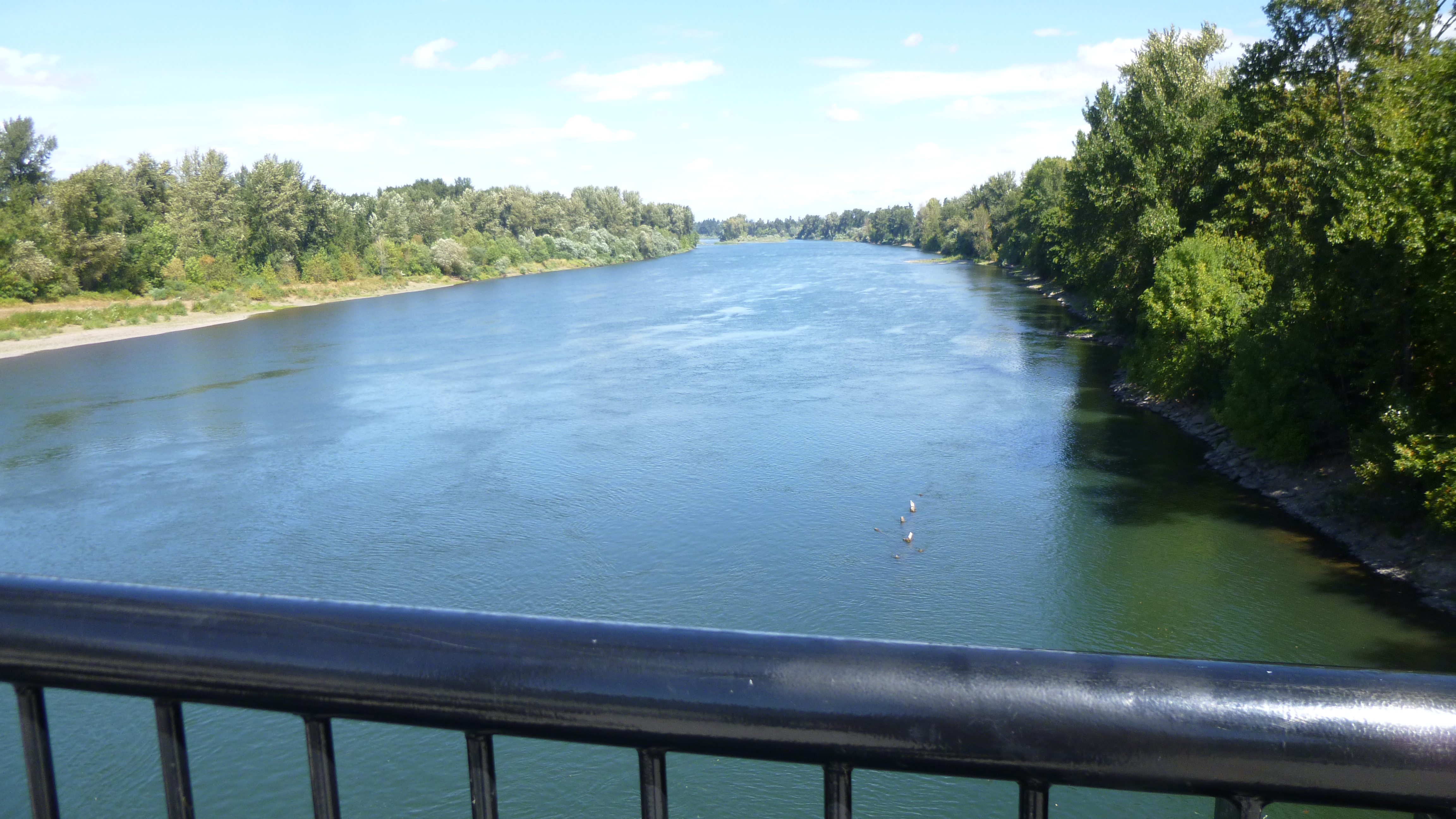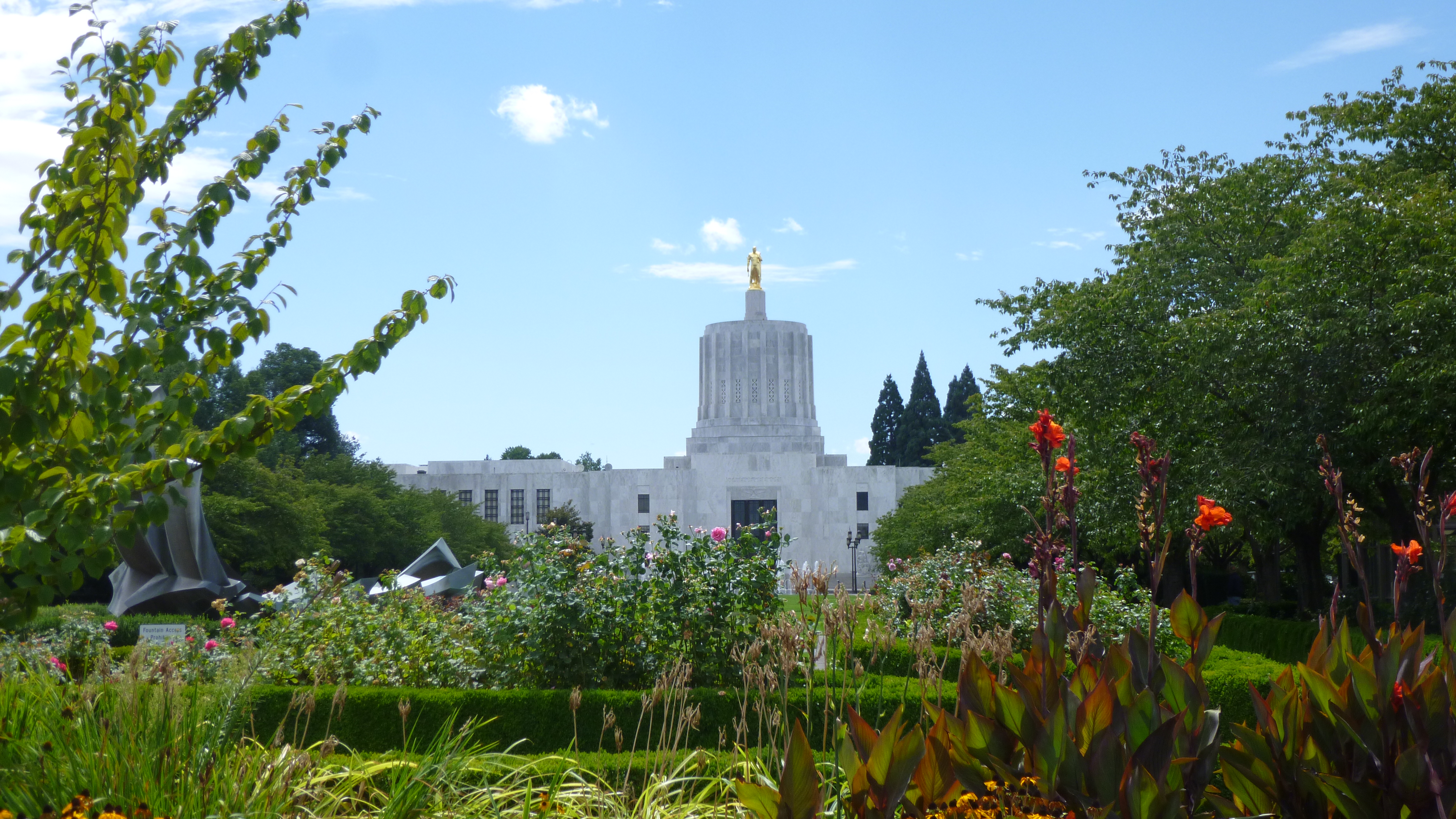 It was still a damp morning, but I got packed up and headed back to Salem to do a little walking before heading the rest of the way west to the coast. I had to stop for gas, and I finally saw one of the trucks that come to test and examine the gas to make sure it’s accurate while being pumped by the consumers. When we got to Salem, Tula and I started off with a walk on the river trail. After walking about a mile, we headed across the river on a pedestrian bridge that used to be an old train trestle. We made our way down to the water’s edge on the other side of the bridge, and Tula was happy to get in to take another swim. She also made friends with another dog that was swimming, and she was half wolf and half German shepherd, but she was really friendly. We walked along some paths in the woods, then headed back to the car. Salem is Oregon’s capital, and I drove through the city to see it. There was a beautiful state park across the street from the capital, and I walked around the capitol building and around the park. This capitol building looked kind of different from many others that I’ve seen – a bit more austere, but I didn’t see what it looked like inside.