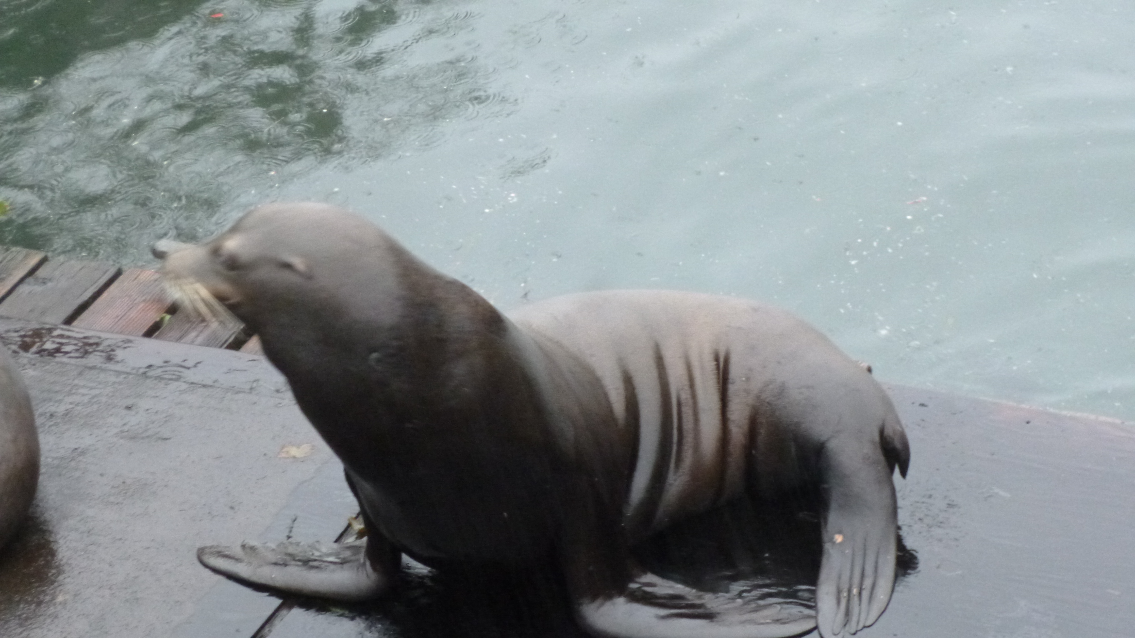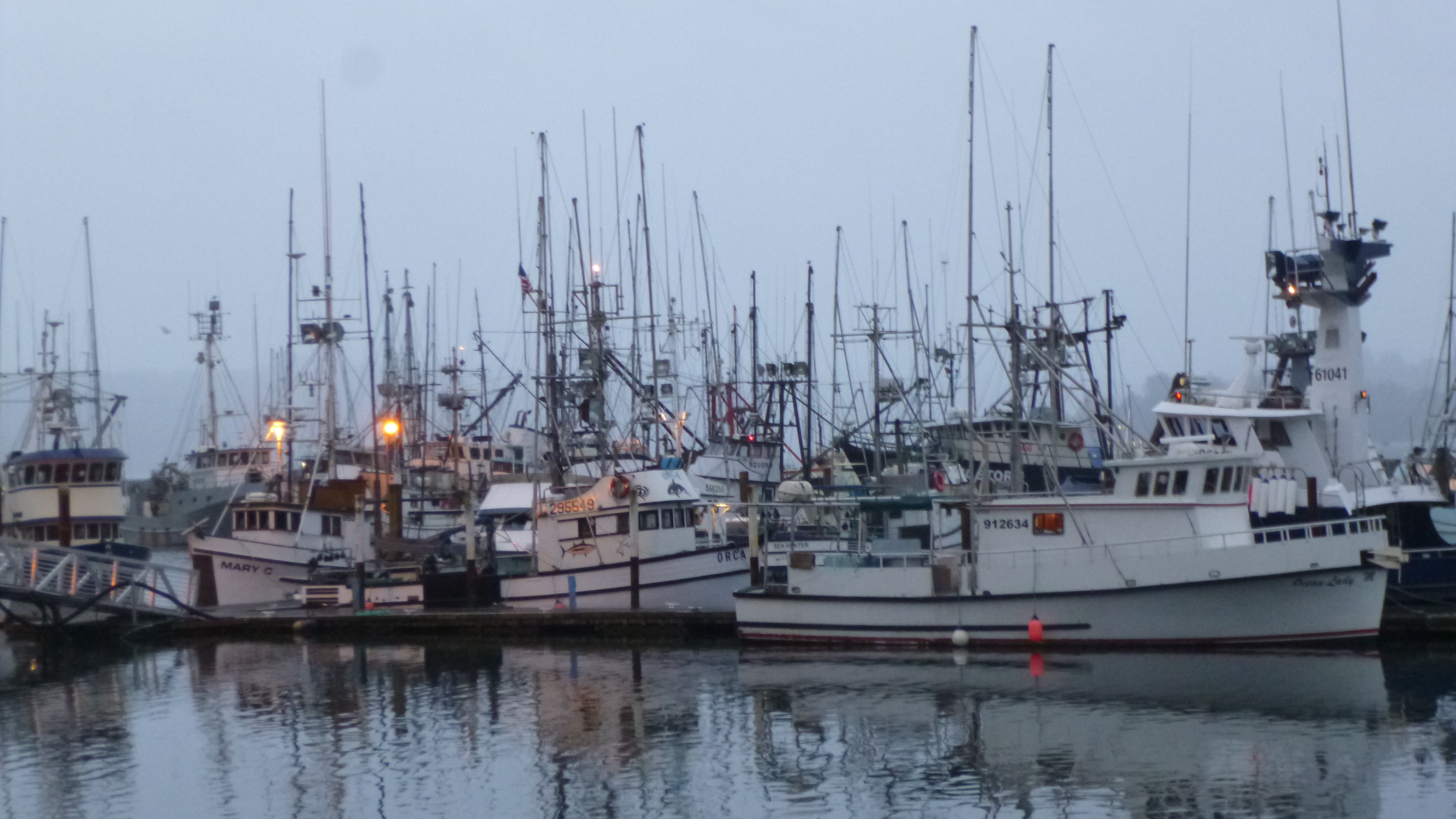 As we were driving west, I saw a sign that pointed down a different road which said something about a covered bridge. I drove down to see it and it was a very pretty bridge – I didn’t expect to see any of them in Oregon! Then we finally made it to the coast, where it became drizzly and foggy again. The rocky coastline was still beautiful though, even with the gray clouds and sprinkles. We tried to walk a little in the town of Lincoln Beach, but it was just too wet. So we made our slow way south to Newport, and got out to walk in the historic old fishing town. There were a couple fish processing plants by the water, and it smelled pretty bad! Tula and I walked all through town in the drizzle, and when it started raining a little harder I put her back in the van, and continued on with my umbrella. I found a boardwalk, and really enjoyed walking along that while admiring the boats in the harbor. I could hear a bunch of sea lions, and found a pier where people could look over the edge and watch them. These sea lions were all male, and they return to this area late every August after a trip down to southern California to visit the female sea lions. I walked nearly 4 miles in Newport to finish off the walking for the day, and it was nice to get to the motel I’d made reservations at to get dried off!