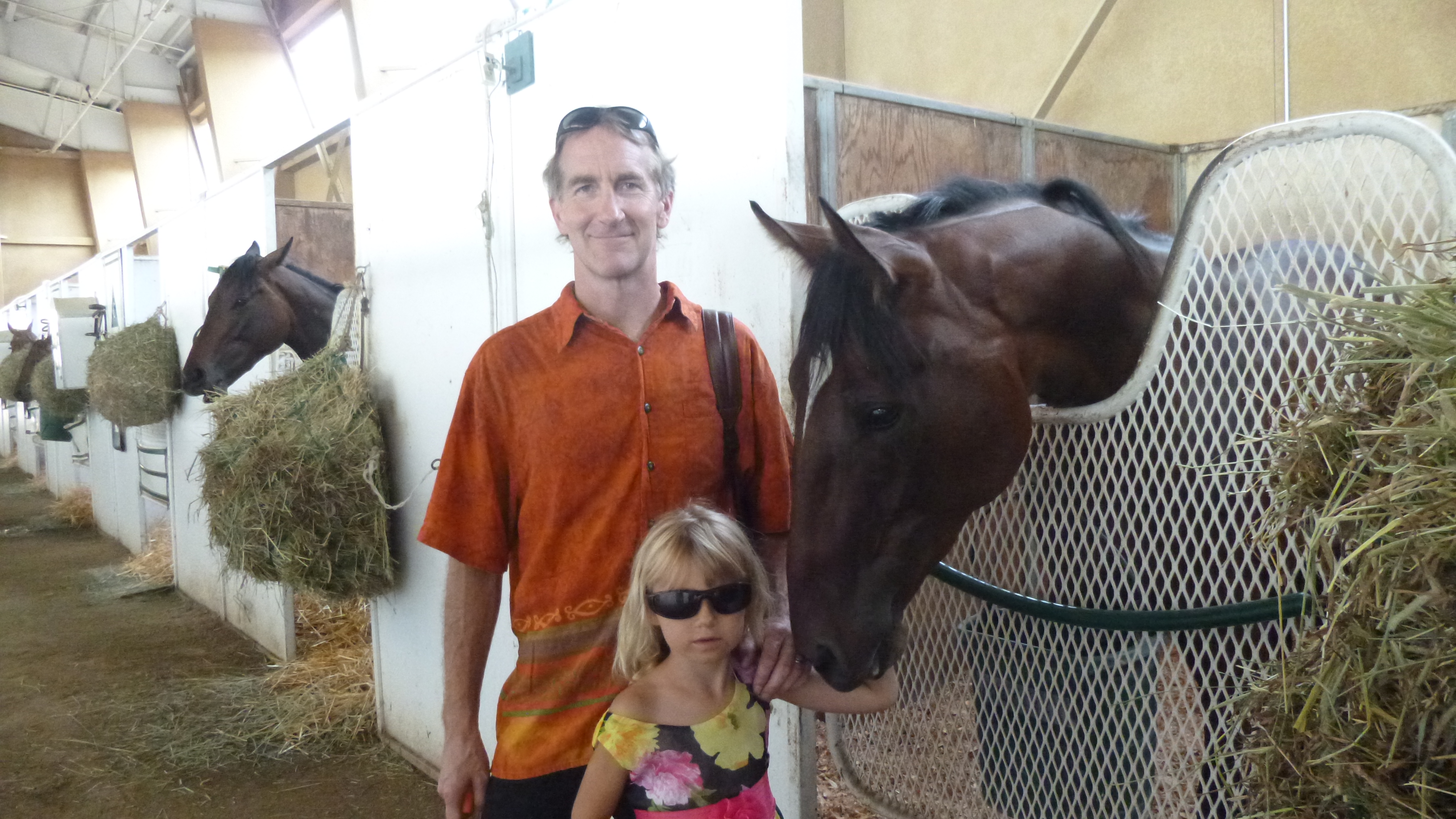 We did go back to the barns to see their other horses – they all train every day, and my 6-yr-old niece likes to go feed all of them carrots. They keep a huge (50 pounds?) sack of carrots at the barn, and enjoy having their horses close to home during the 6 week season. I watched one of the grooms walk the filly around to cool her off – she still looked like she was full of herself! Hopefully in the future this sass and energy will translate into successful racing! It’s kind of fun to walk around the backside area – only owners and their guests can be back there besides all the race people, and it’s a busy place with grooms getting horses ready for races, and cooling them down afterwards. There’s dorm-like buildings for the exercise riders who move from track to track, and horse laundry (blankets, towels, leg wraps, etc) is sometimes hanging out to dry. There’s owners and trainers and grooms and exercise riders and jockeys and vets and farriers and horse van drivers back there – it takes a lot of people to run a racing barn! On our way back to the parking lot, Erik and I watched the end of the race after theirs, and since there’s only a couple days of racing left, the grandstands were full of cheering people. One thing they don’t usually show on TV during the races is the ambulance that takes off right after the horses and follows them all around the track – to be on hand instantly should the need arise. It sometimes looks as though the ambulance is chasing the horses, but it’s far enough behind them that they’re not really aware of it.