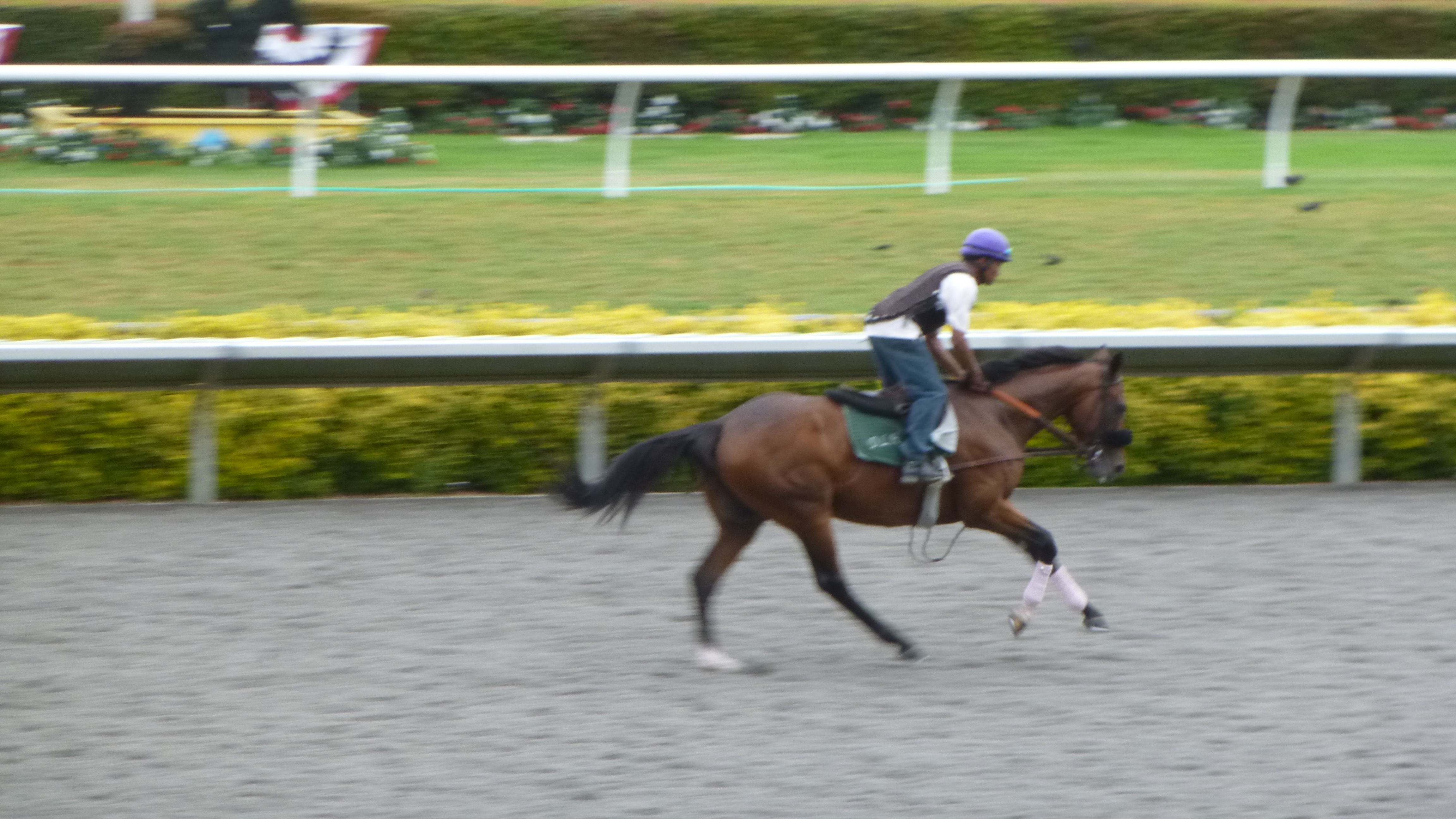 We all left the house early this morning to go over to the track to watch some morning workouts. Christy won’t have the chance to see a race (they have another horse racing tonight after her flight leaves) but this way she can see some of the horses out on the track. It was a pretty foggy morning, but the racetrack was still a busy place – most horses have workouts every morning to stay in shape between races. So the trainers and grooms and exercise riders all keep early hours. We watched the horses on the track for a while, and most were just galloping through their workouts, but a few looked like they were doing “breezes” – full-out running as though they were in a race. Their speed and fluidity of movement is fun to watch. Then we headed for the track kitchen where we were going to get breakfast, and just after we’d all ordered big breakfast burritos, Erik and Pavla got the news that their one horse in New York at the Saratoga track was going to race in about 20 minutes since the race had moved from the turf to the dirt because of wet weather. And there happened to be a TV in the track kitchen tuned to the correct racing channel, so we’d be able to watch the race while eating. And it was an exciting race – their horse, Sea to Sky, started on the outside, but sailed right over to the rail and was in front for a good part of the race. Even the announcer was enjoying the race – “And Sea to Sky sails through a sea of slop….” Eventually another horse snuck by to come in first, but Sea to Sky hung onto 2nd and everyone was very happy. After breakfast, we visited a couple horses, then headed back. Christy and I had 9 miles to walk before her flight this evening, and if we accomplished that, she will have walked 100 miles with me on my journey – some in each corner of the country, and that would be very special for both of us.