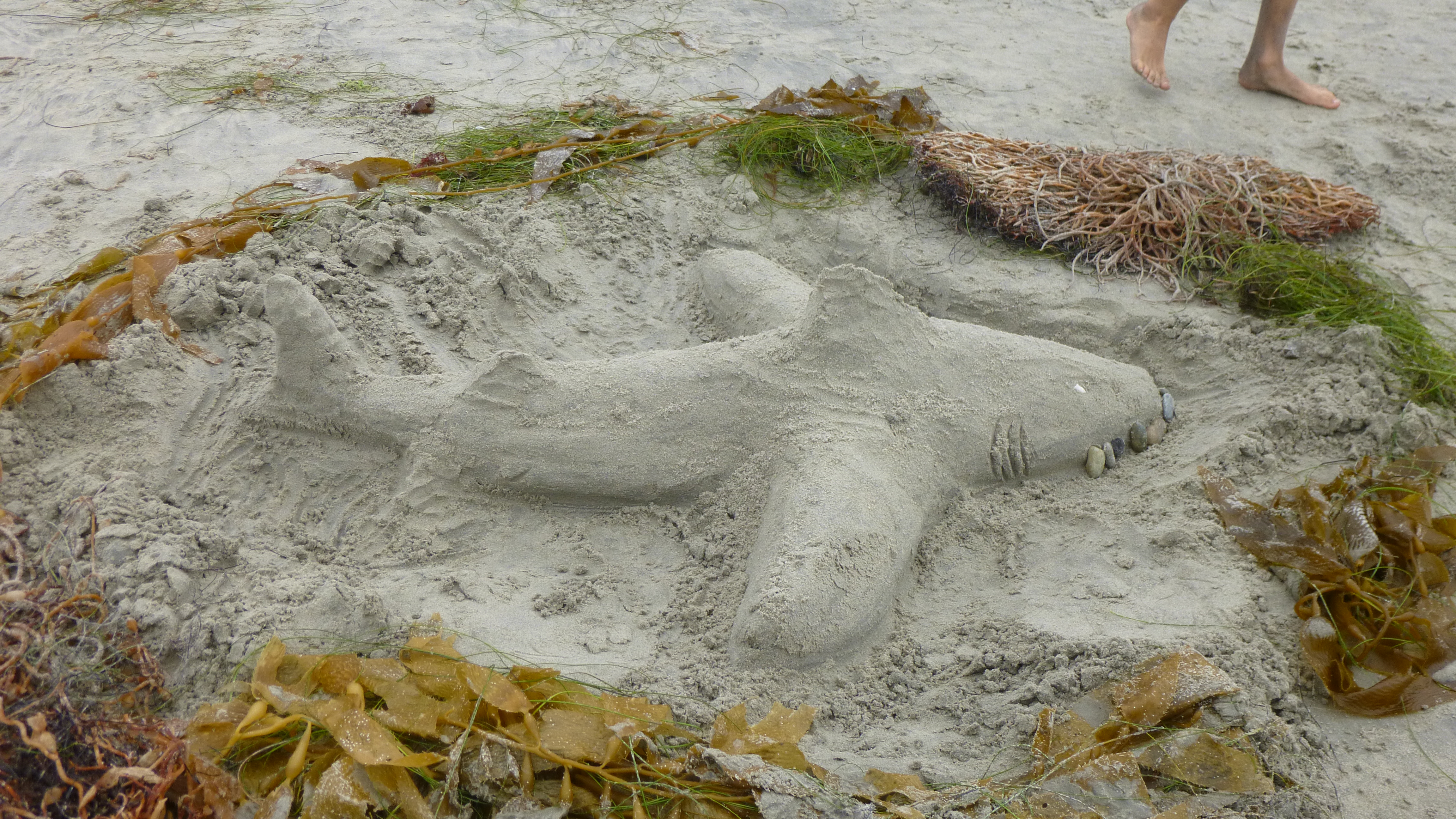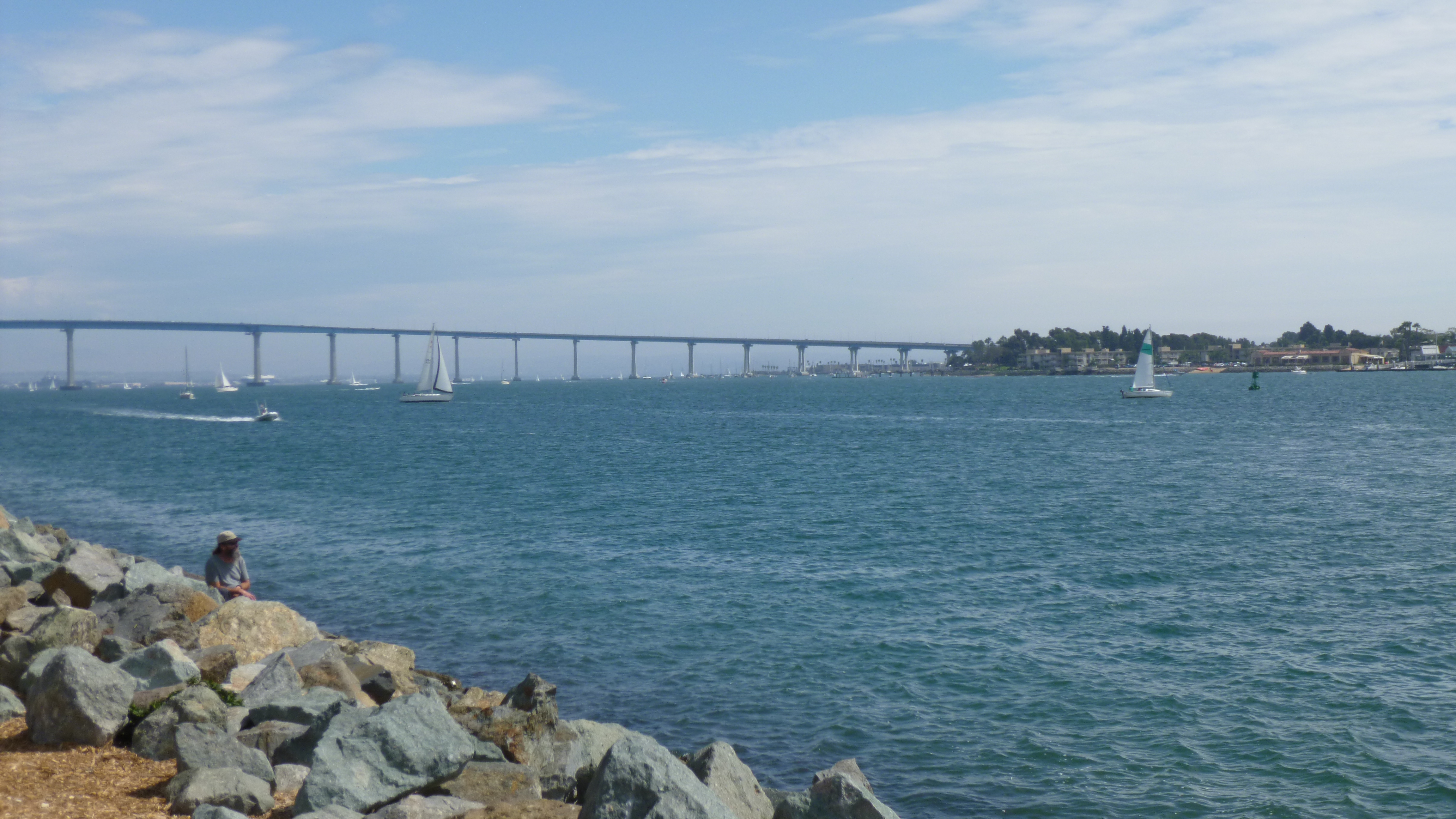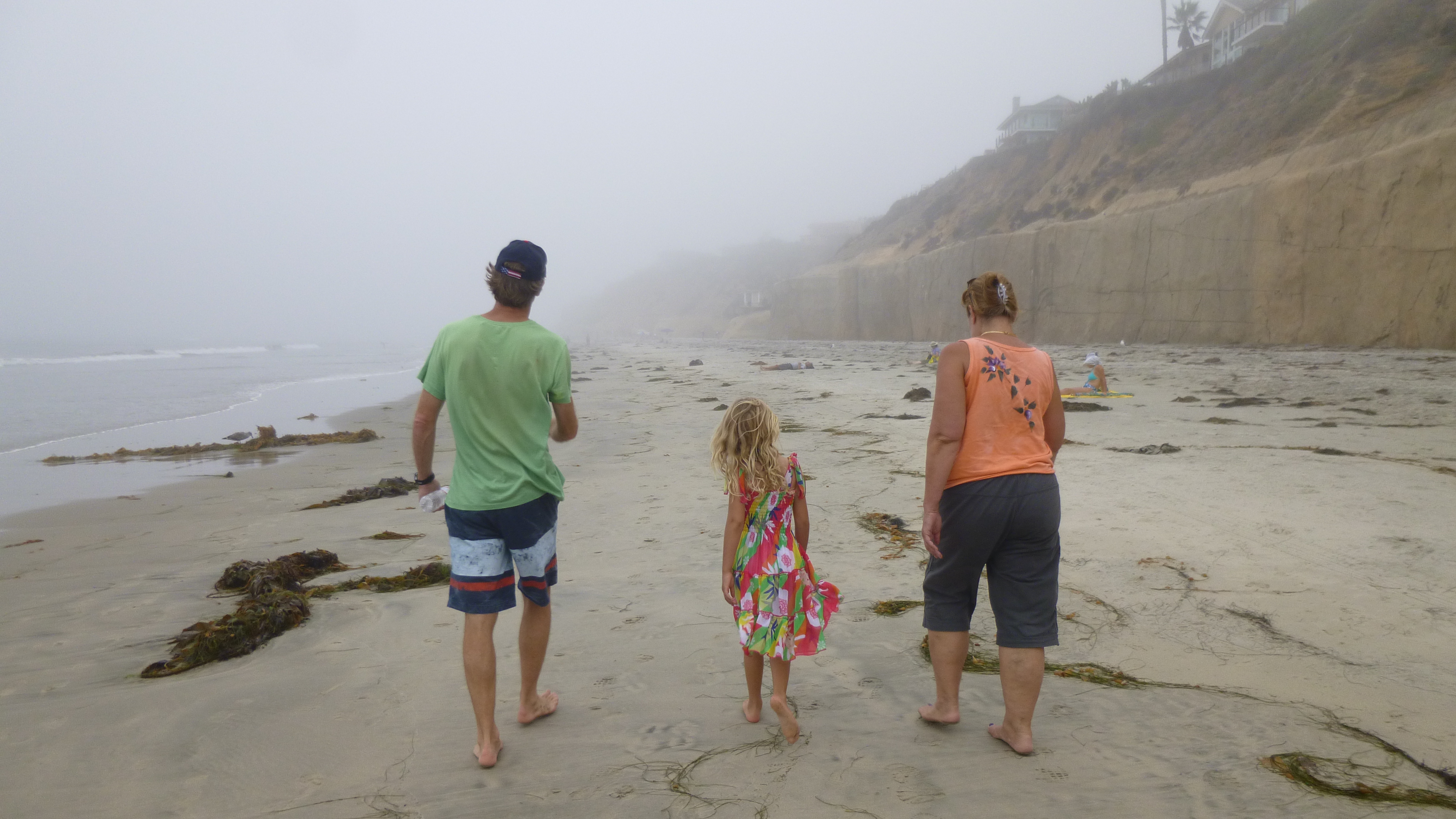 Then Erik, Keira, Christy and I headed back to the beach in the fog, while Pavla went to the other barn. Despite the cloudy, foggy weather, a lot of families were still on the beach, enjoying the last official day of summer, and we passed some pretty creative sand sculptures. Keira walked a whole mile with us, and wanted to keep going until Erik reminded her they still had to walk back! Chris and I kept going, and when we walked as far as we could in one direction, we turned around and went off in the other direction for a ways, and Pavla joined us for a couple miles too. Altogether we walked 6 miles on the beach, which only left 3. We went back to their house, and Christy got packed up, then we headed for Seaport Village for the final 3 miles of walking. By this time the fog had lifted and it actually turned into a pretty warm day. We walked all around Seaport Village and the adjoining marina, looking at all the huge yachts. We easily finished off the 3 remaining miles we needed, and then found someone to take our picture so we’d have a record of 100 miles that we walked together! After a little shopping and a snack, it was time to head to the airport, and I dropped Christy off, knowing I’d see her again in about 3 weeks for her oldest daughter’s wedding.