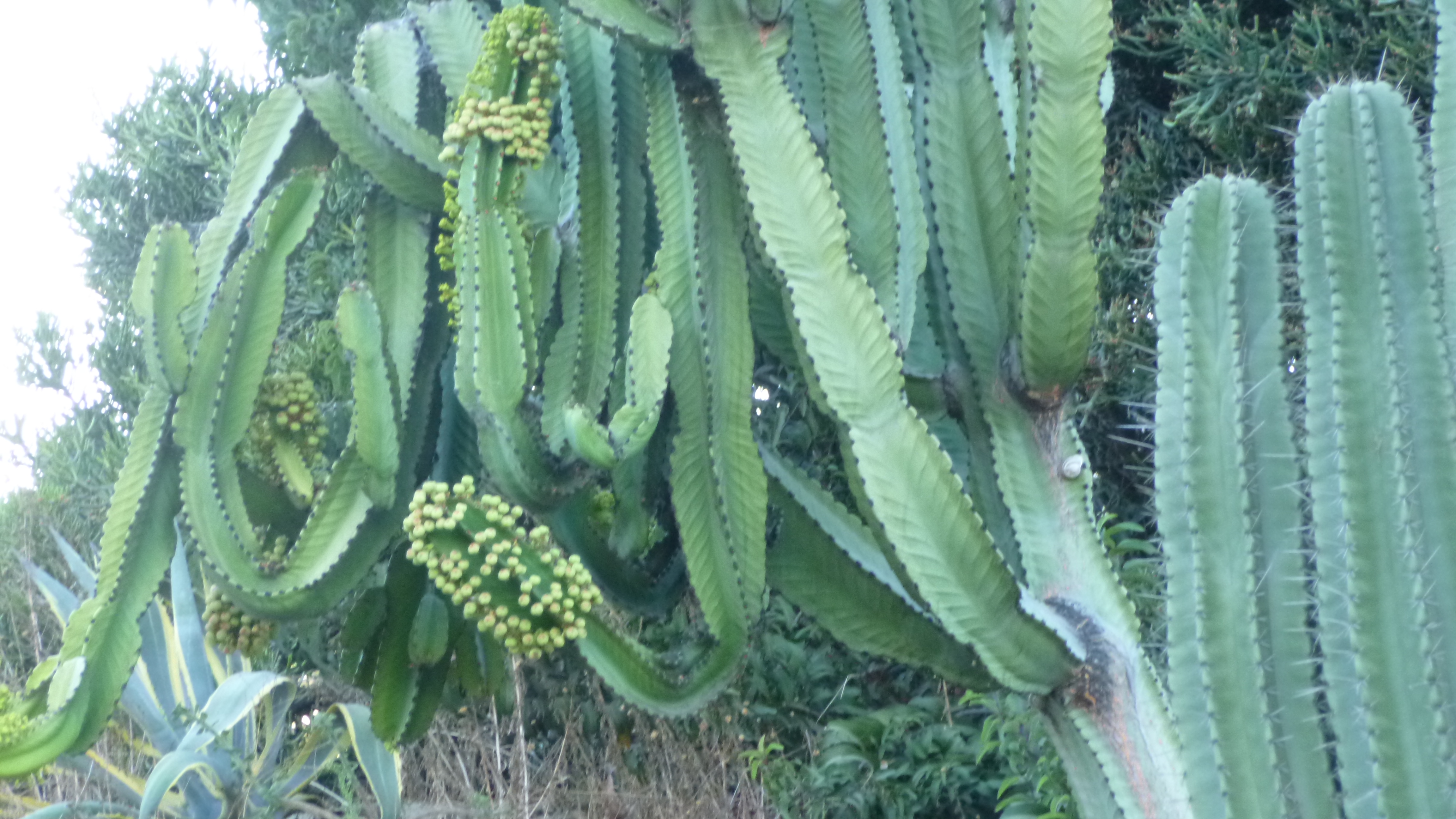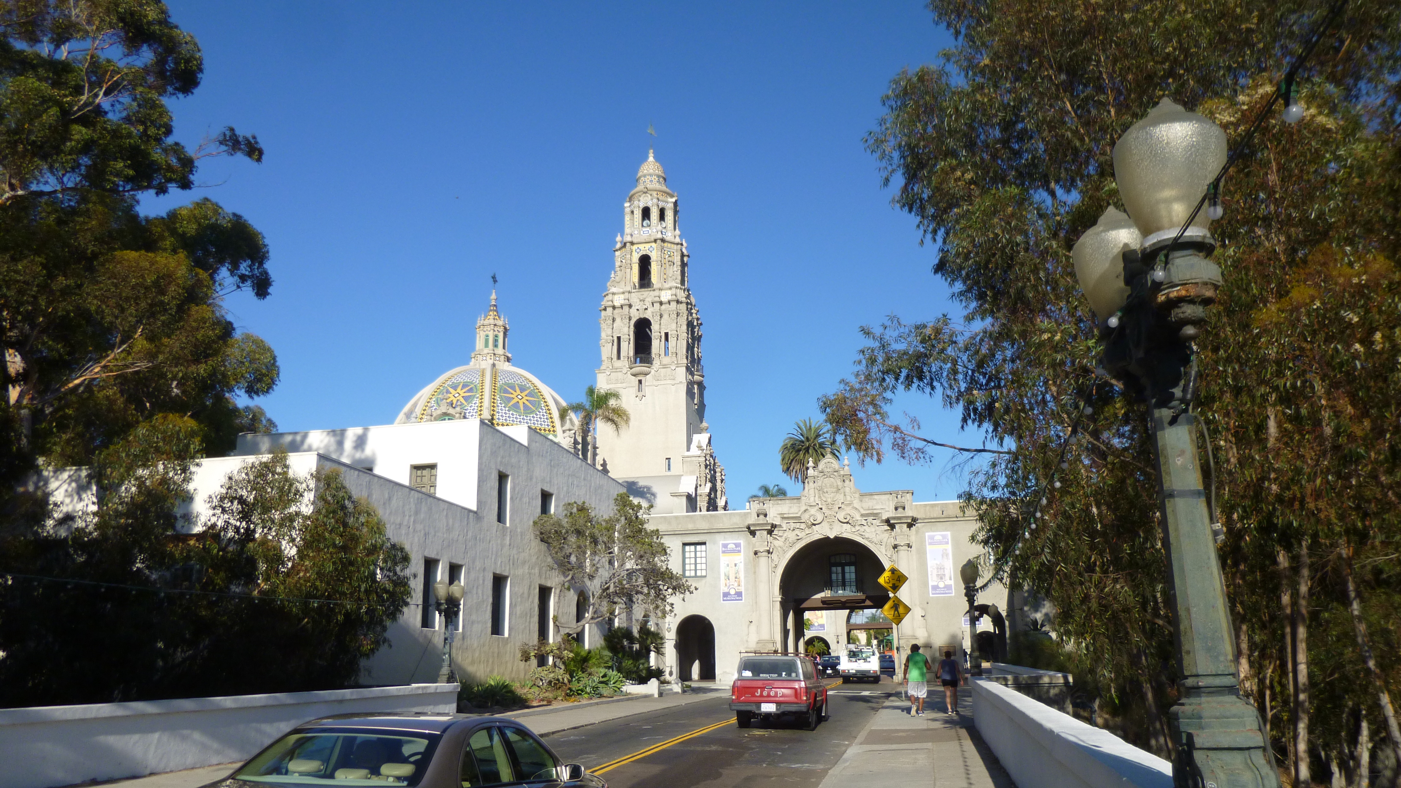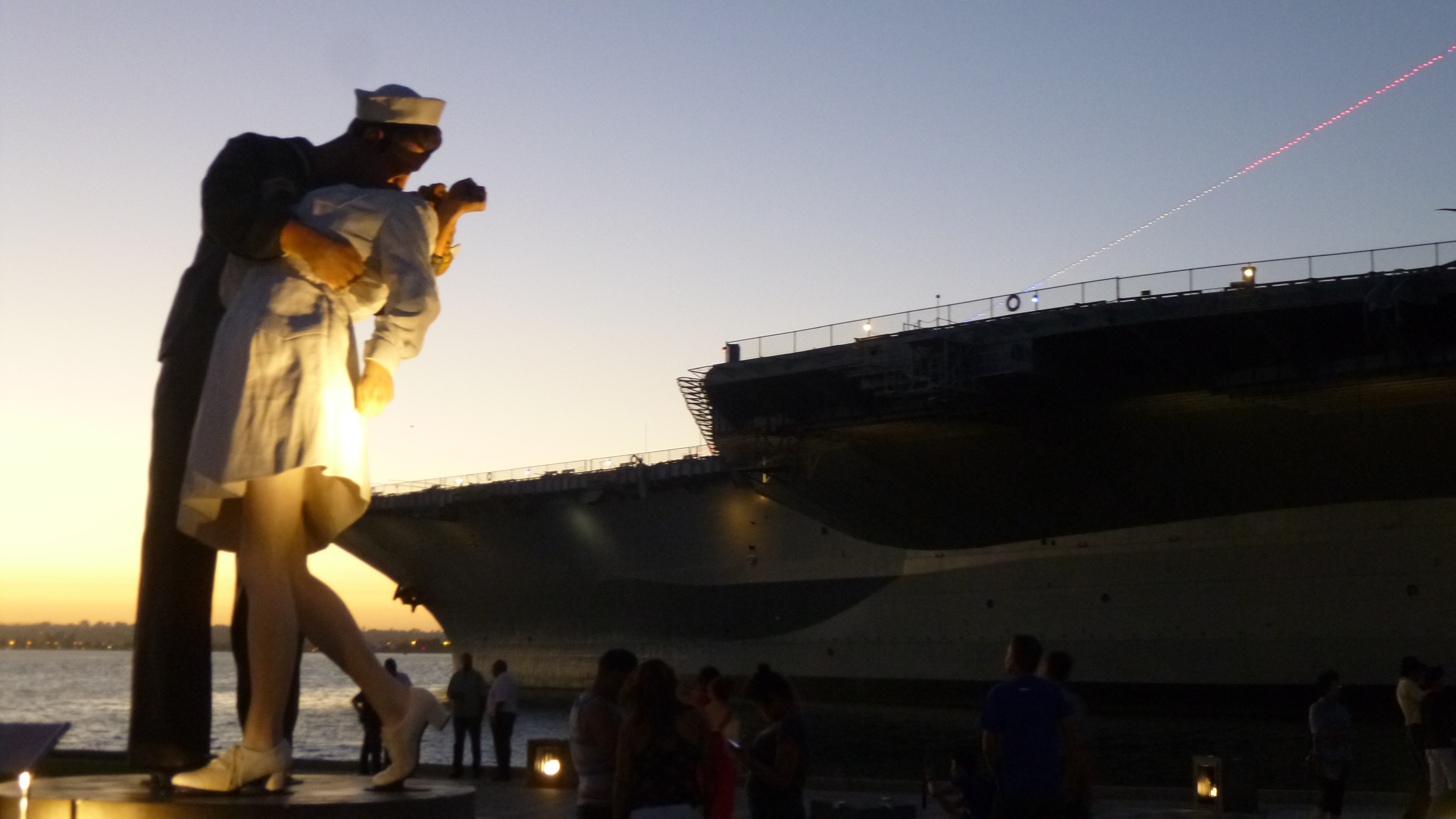 Then it was time for some more walking. I headed to Balboa Park, which was a wonderfully interesting place to walk for miles. I walked in an actual park setting, and passed a couple lawn bowling courts, although I don’t really know what lawn bowling is! Then I walked through an area which made me think of an old Spanish town, with ornate buildings and tiled domes and fountains, and then I found myself in a fascinating cactus garden – I don’t think I’ve ever seen such a variety of cactus plants before – from small little plants to bushes to trees! I also passed a nice outdoor auditorium area, and from the signs that were around, it looks like the San Diego Symphony performs there. After walking a little over 4 miles in all the different parts of Balboa Park, I headed back to the Seaport Village area, where Chris and I had noticed some tall ships yesterday. Tula and I got out for an evening walk along the waterfront pier, which has numerous old ships moored within an arm’s reach that are open to the public – kind of a marine museum. There were 2 submarines, some 3-masted schooners, and even the USS Midway aircraft carrier. The sun was going down, and it was really pretty to be walking by all the old ships in the rosy sunset colors. Past the aircraft carrier was a little park with a bigger-than-life sculpture of the famous end-of-WWII picture of the sailor kissing a nurse. And beyond that was a tribute to Bob Hope – with a sculpture of him entertaining a variety of troops. And there was a recording, in his voice, of one of his shows, and in the fading light the sculptures almost looked real, and it didn’t take much imagination to think it was all happening live. As we headed back to the van, I passed some people who were fishing, and I watched one of them reel in something that looked like a stingray, but they said it was some kind of shark. They simply took the hook out and tossed it back in. Tula was pretty curious about it!