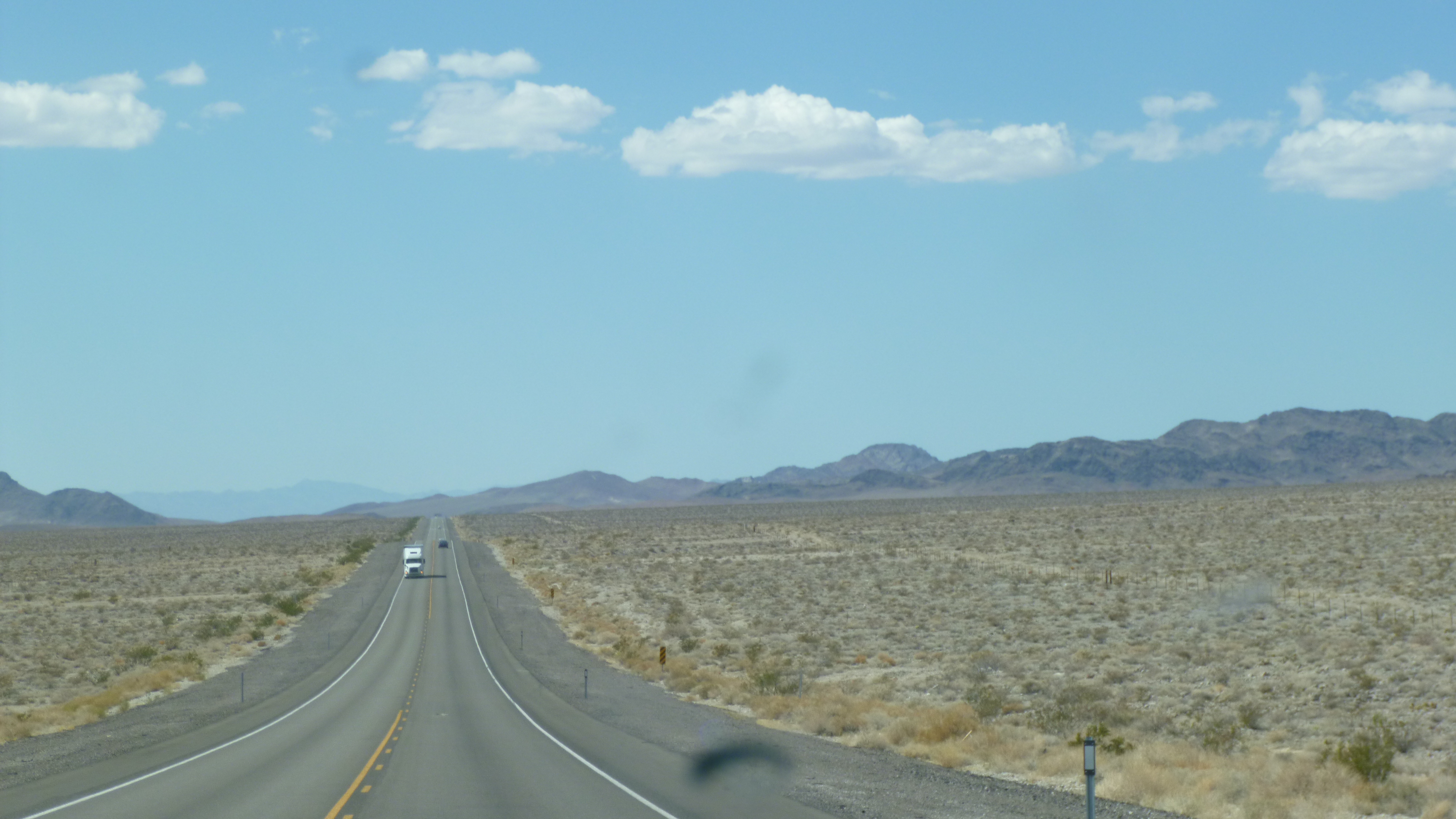 After driving through the valley for a ways, I started climbing back up the 3000′ I had descended earlier in the day, and then I crossed back into Nevada. I went through the ghost town of Rhyolite – at one time a mining town. About the only building that is still intact is a “bottle house” that someone built out of empty glass bottles, which was apparently built well enough to be standing long after the other buildings in town. Tula and I did a little walking in the town of Beatty, but I’m coming up short with my walking today – I wasn’t going to be out in the 120+ degree heat to do that, so I will get it made up in the days to come. I also didn’t make a donation today – partly because I had doubled up yesterday, and partly I was in a very unpopulated part of the state and there weren’t any places to make donations to!