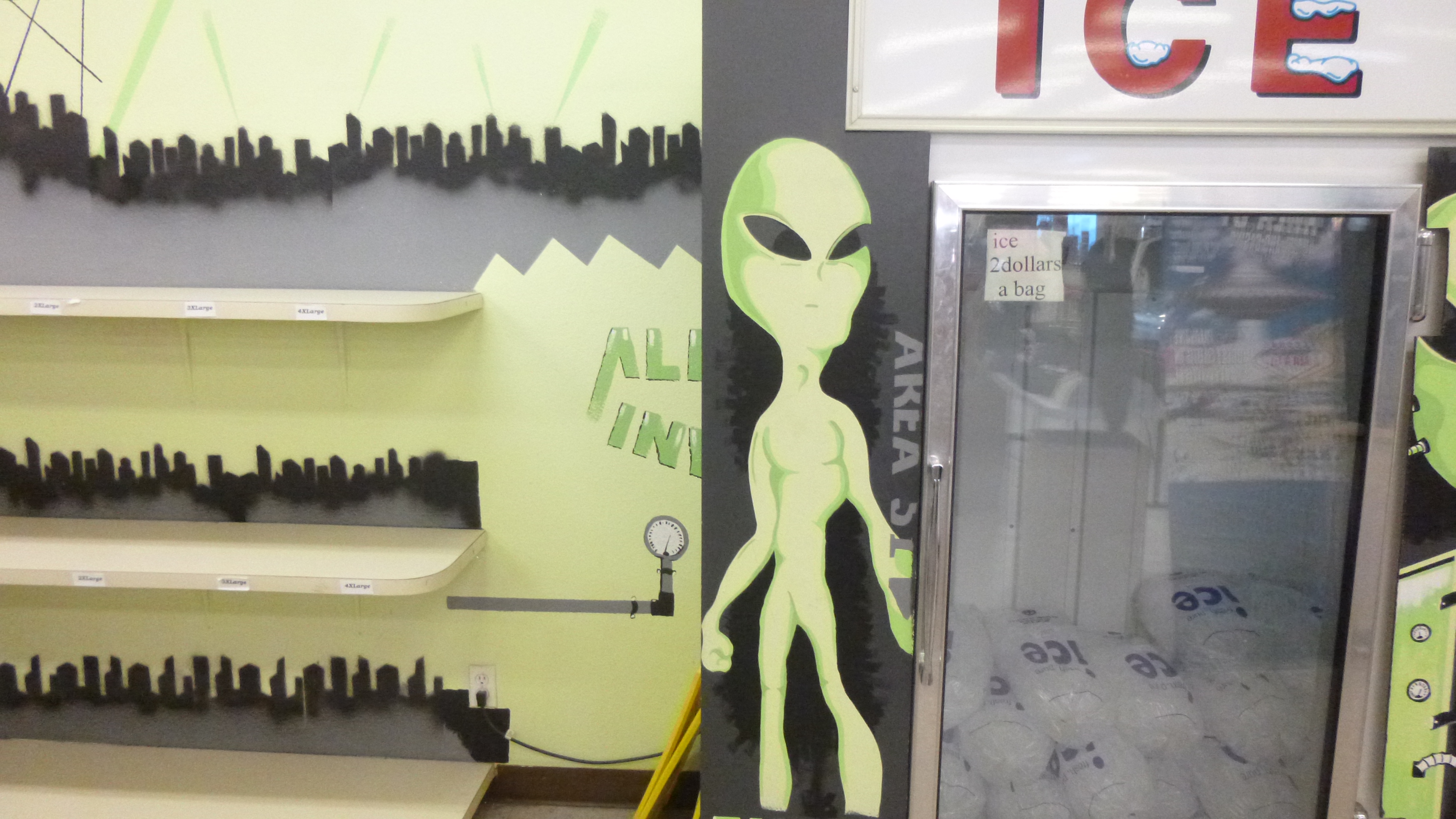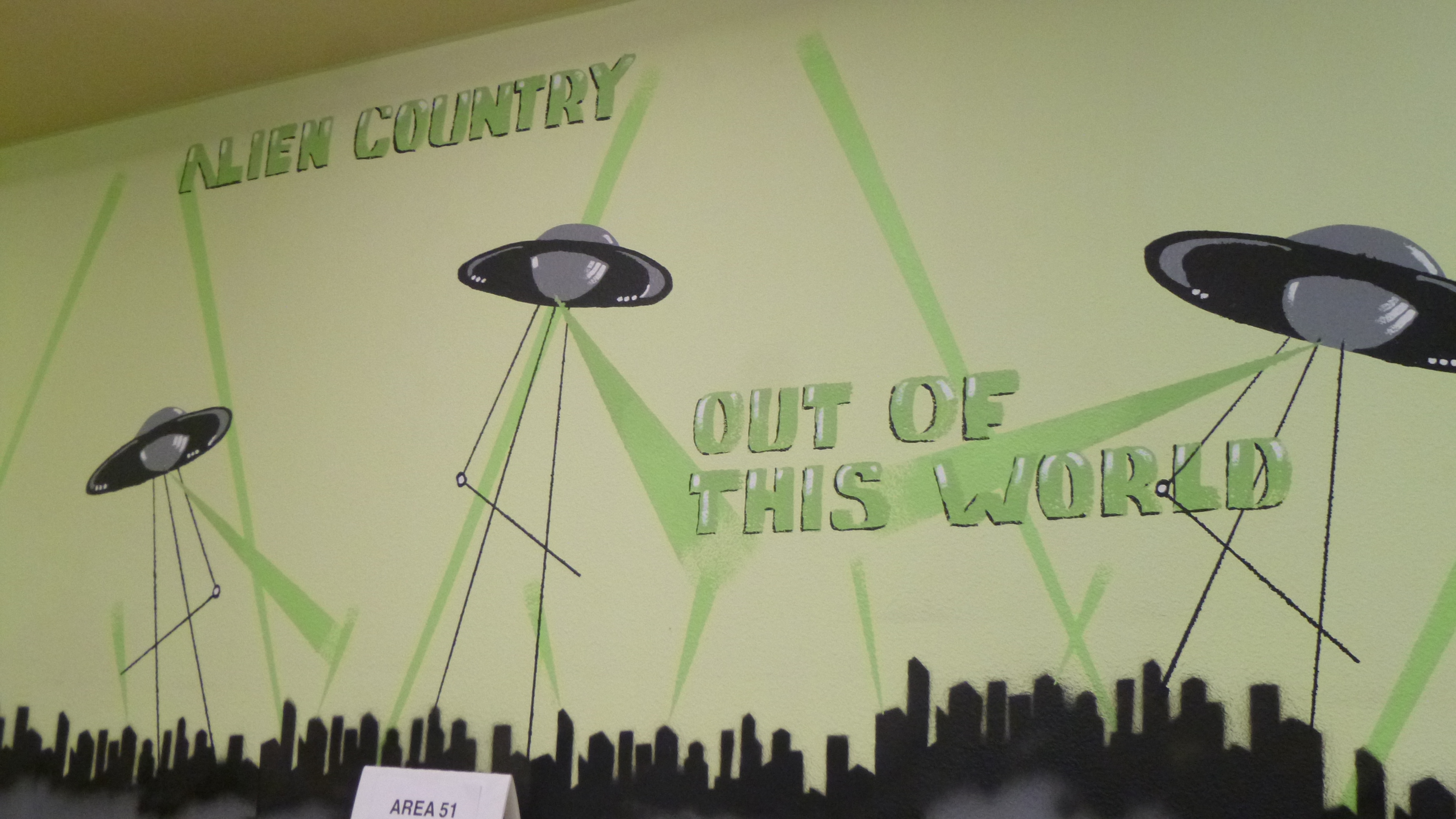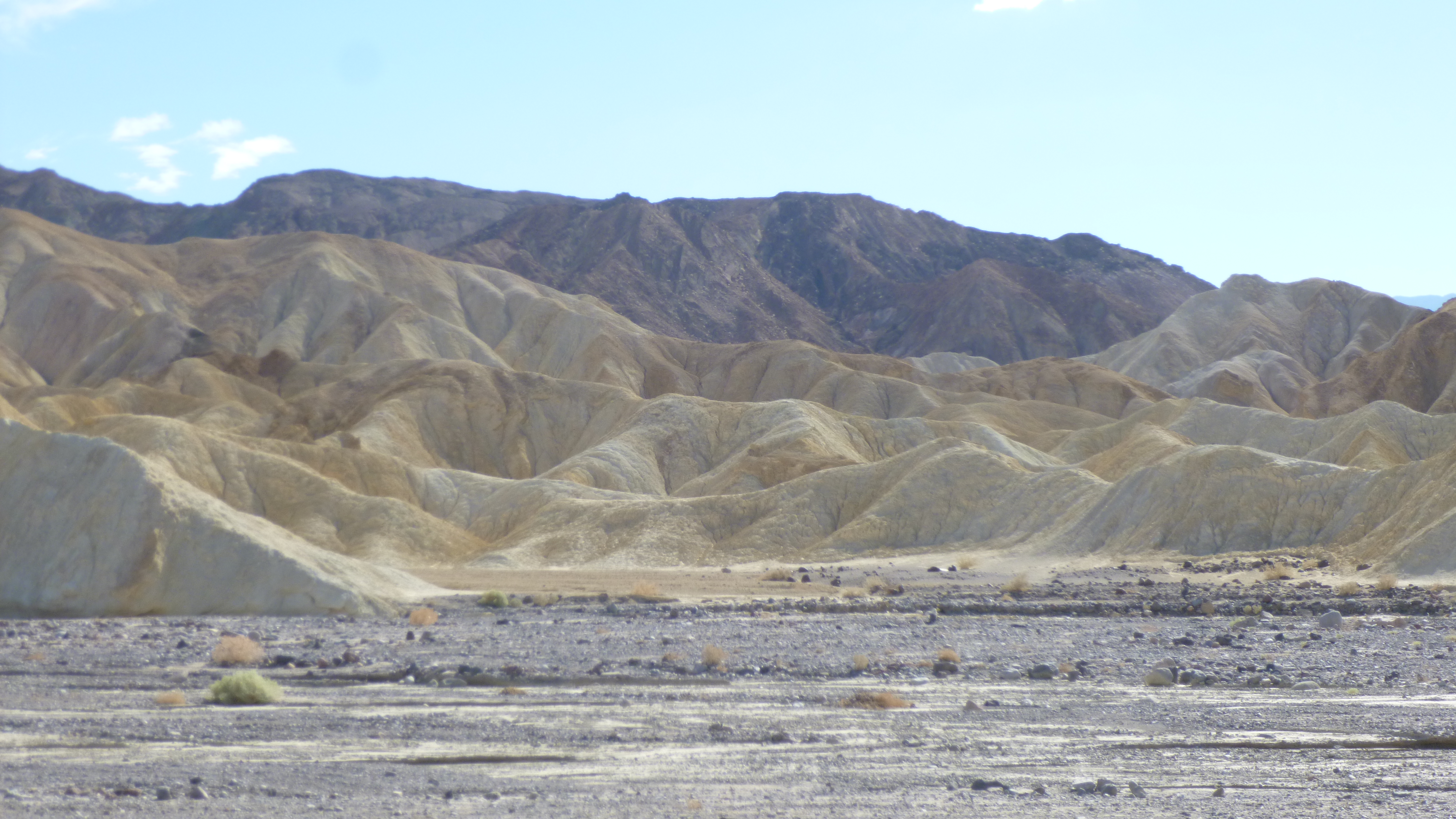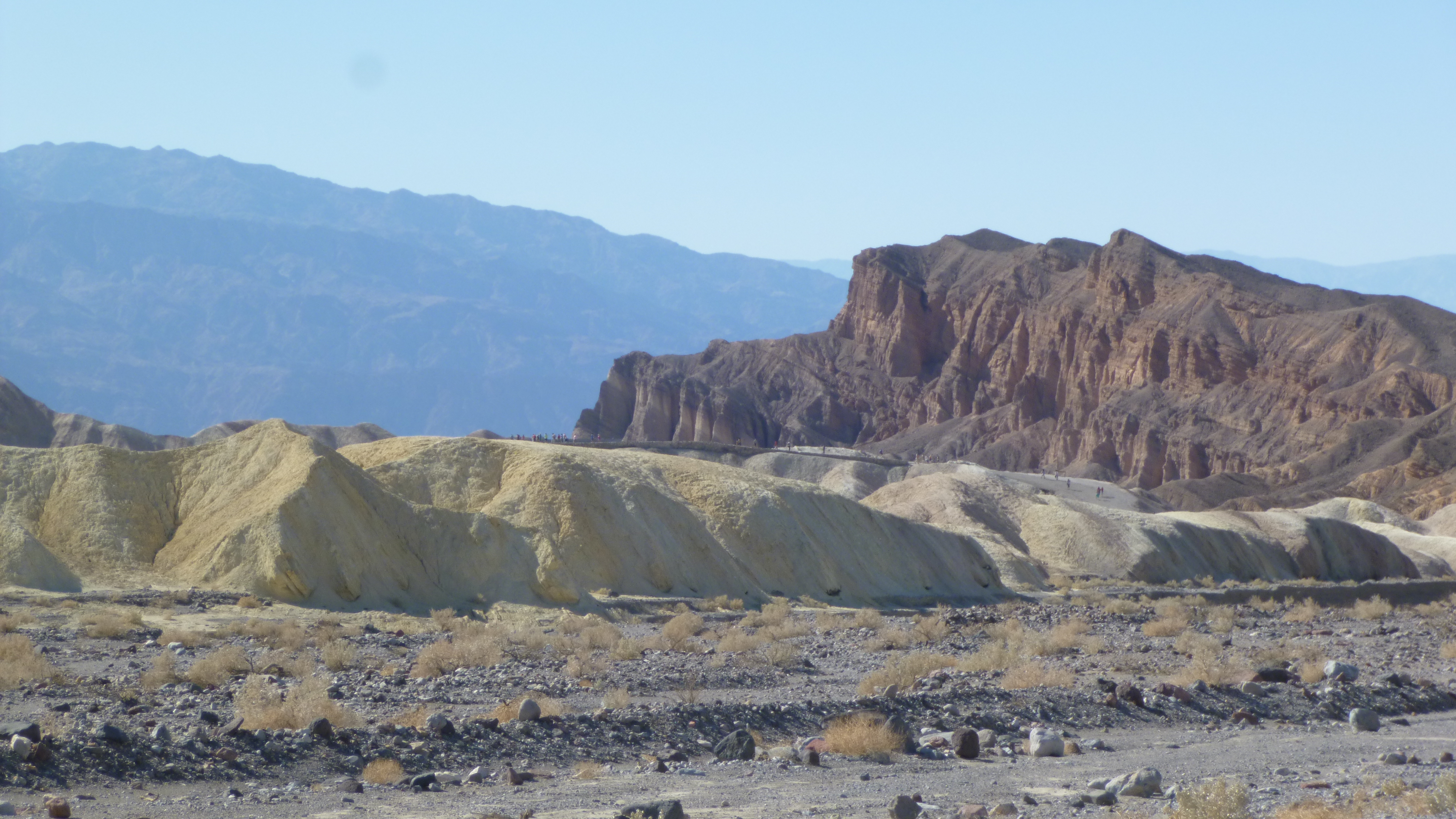 It was Friday, and a big Amway convention was getting underway in Vegas, along with some other big groups, so it was time to leave town and head northwest up toward Carson City. It was still hot out, so I found a park to walk Tula for a bit before getting into the car. We started driving across the desert, and eventually we were driving along the south side of “area 51” – an air force test site, and also one of the places that the military is rumored to have aliens – haha! The lone gas station/store/brothel along that part of the highway had an alien theme, and I just think it’s all really weird – I’ve never liked aliens. And I had the misfortune to stop by when a big tour bus stopped – I think everyone driving down the road stopped there! As I continued on, I saw signs pointing to Death Valley – the vast majority of Death Valley is in California, but there is a tiny bit of it in Nevada. I decided to duck down into California to drive through a short stretch of Death Valley. It was very hot, but I had plenty of gas in the car, and plenty of water for me and Tula, and most importantly, there was a fair amount of traffic so people were around in case of any car problems. I began the 3000′ descent down to the floor of Death Valley and I watched the temperature steadily rise from 104 degrees all the way up to 122 degrees, and even up to 123 for a few minutes. I stopped by an observation point (along with the same tour bus) and walked about 1/4 mile uphill to the vantage point – I’ve never felt that kind of heat before. I wouldn’t even let Tula out of the car in that heat. Death Valley is called the hottest place on earth, and on July 13 of this year, they set a record with 135 degree heat. Whew! The lowest part of the valley is a couple hundred feet below sea level. Down on the valley floor, there’s a resort called Furnace Creek Resort, and an RV campground, and a national park visitor center. I stopped by the visitor center and found enough shade to get Tula out for a few minutes. I can’t imagine who would want to come stay at a resort in that heat! There were some old train cars there and a sculpture of a mule train – back in the 1800s borax was mined in Death Valley and had to be hauled 165 miles to Mojave and they used mule trains to do that.
