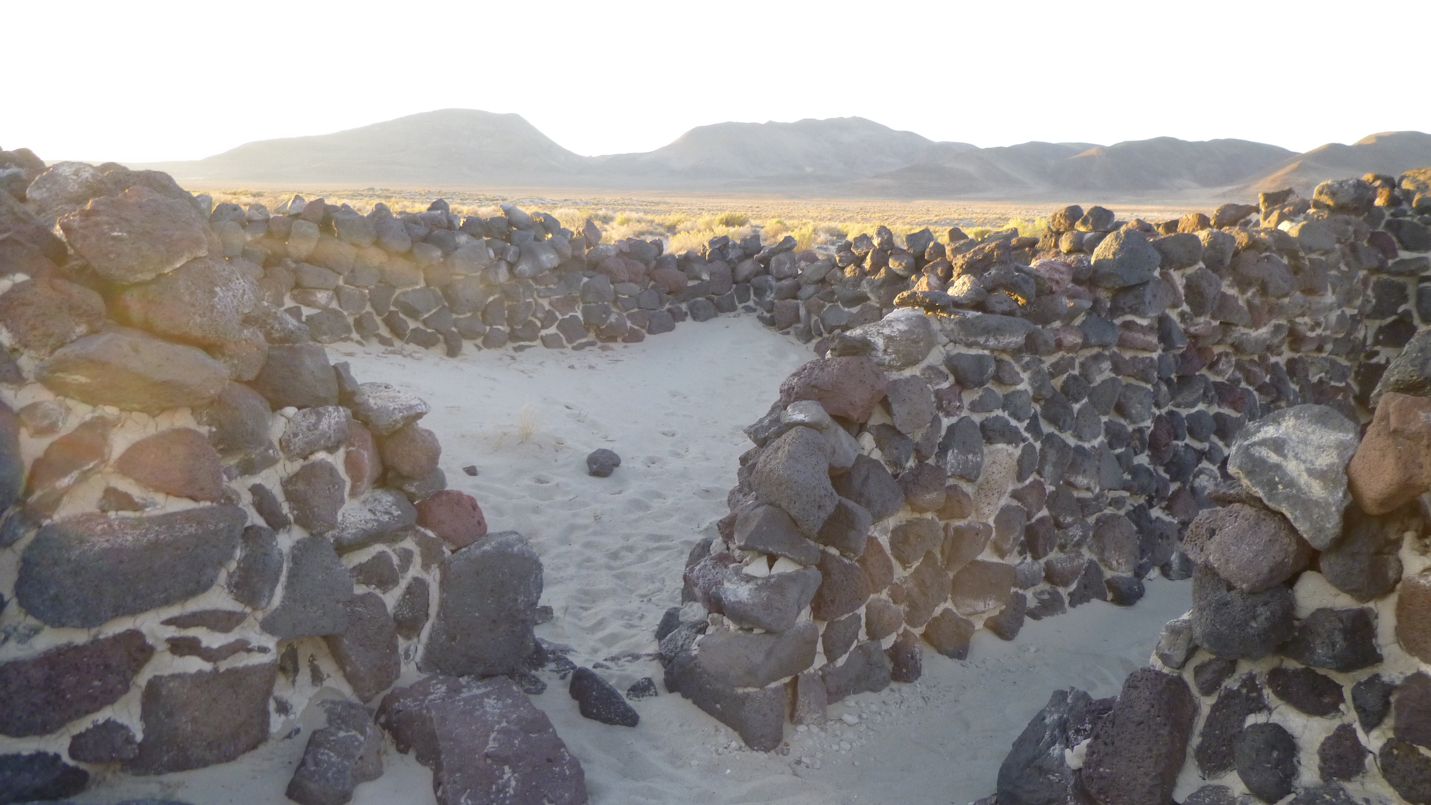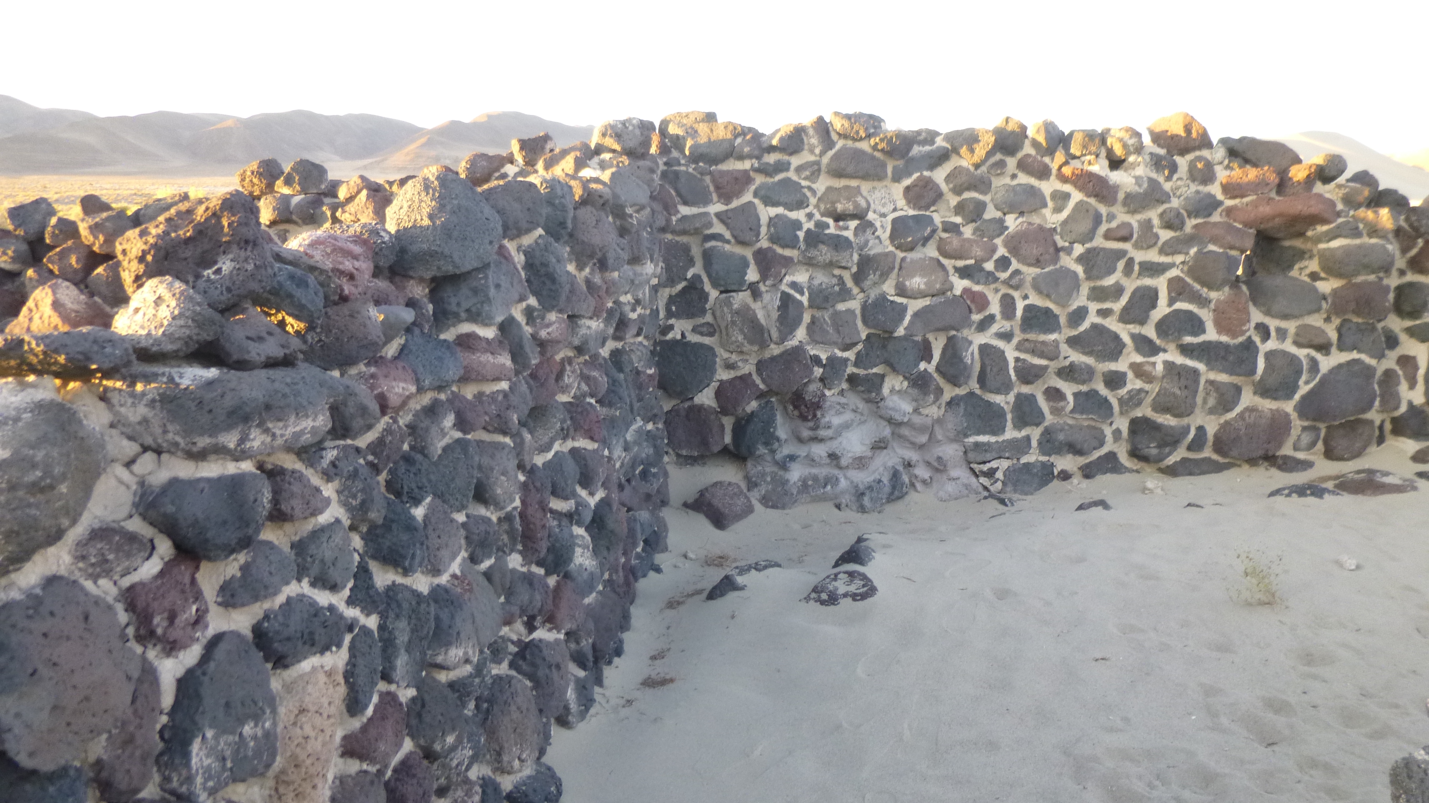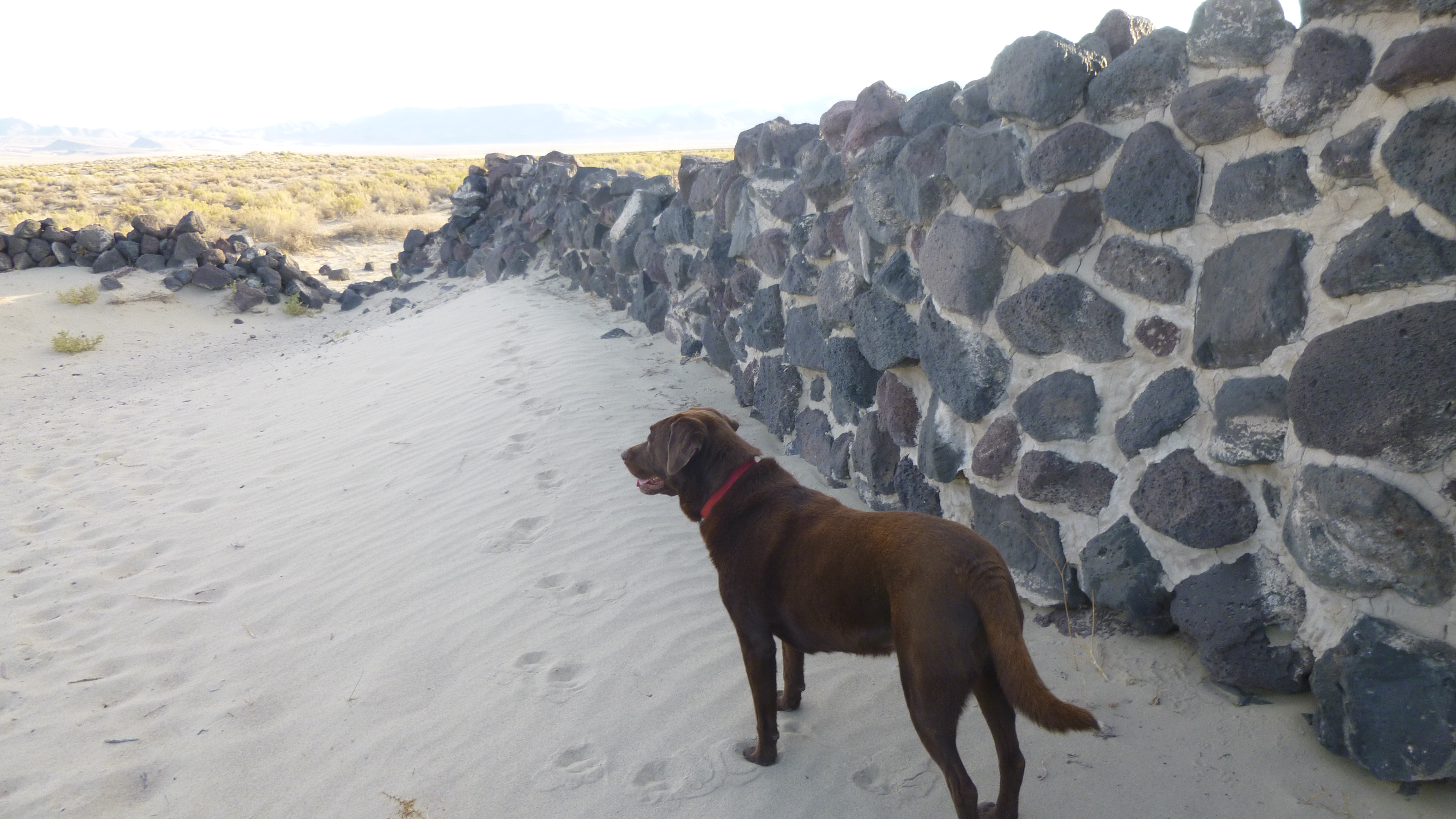 And a little farther on I came to Sand Mountain, which is a huge, constantly changing sand dune and the last time we were here, Taryn and I climbed all the way up to the top. It gets really steep at the top and requires crawling up on hands and knees, and even with that, we kept slipping backwards. I didn’t plan to climb all the way up again today, partly because of the heat, although the sand didn’t feel as hot as I expected it to. I climbed up to the point I had to start using hands and knees, and then settled on a smaller sand dune instead. The wind is constantly blowing the sand around, and the tops of the dunes have a knife-edge crease to them, which is kind of fun to walk across. These dunes are known as the “singing dunes” because if the conditions are right, one can sometimes hear a humming sort of sound while running down the dunes – Taryn and I heard it last time; I may not have been high enough this time because I didn’t hear anything. When I was finished on the sand dune and heading back out to the highway, I passed a turnoff to see the remains of an old pony express station. Tula and I followed a roundabout path to the crumbling brick structure, and the different rooms of the old station were still visible. It wasn’t a very comfortable place for the pony express riders to relax, but it served its purpose with a couple corrals for the horses attached to stone building, which also had a blacksmith room, a kitchen and small living quarters. This station was used for the pony express riders, and then later it was used to store batteries for the telegraph lines up until 1900. After the telegraph people stopped using the station, it was abandoned and the sands covered up the whole station, and it was forgotten until 1976, when it was uncovered once again.