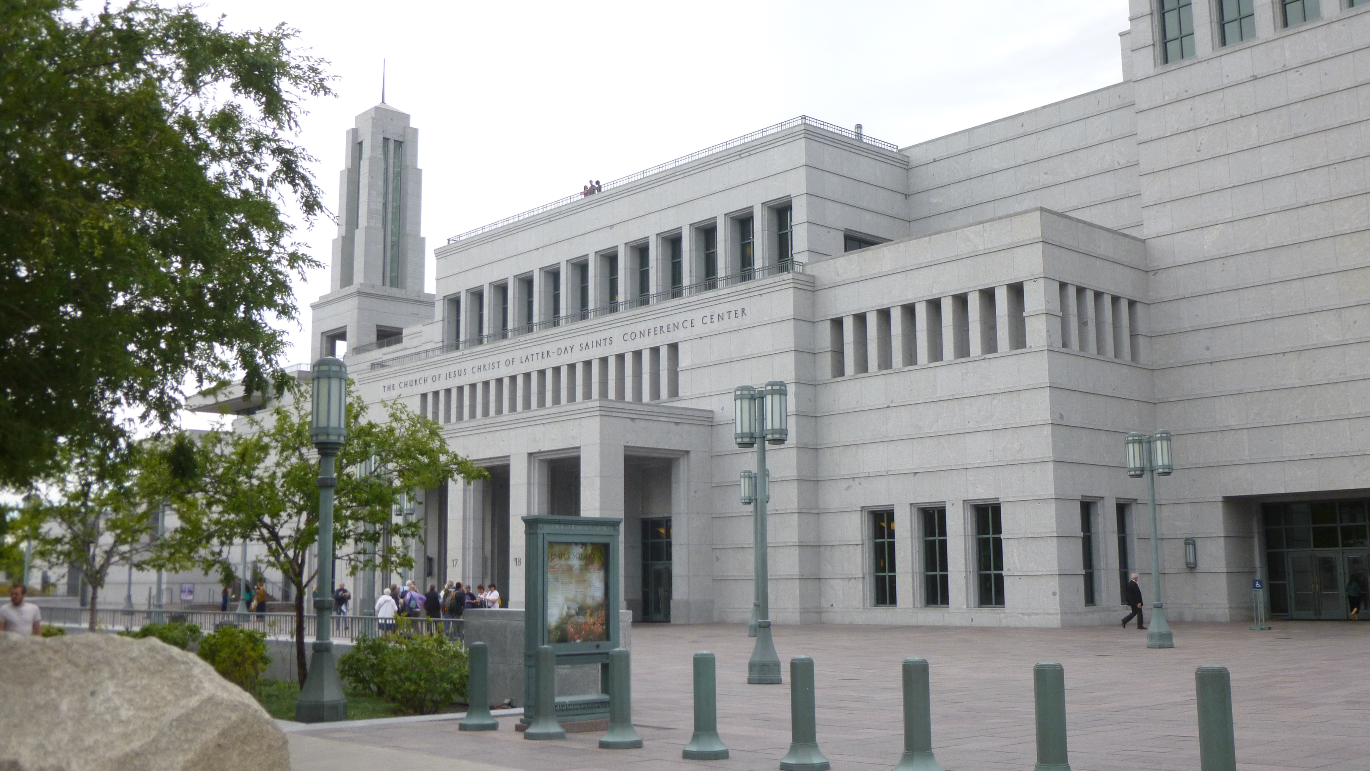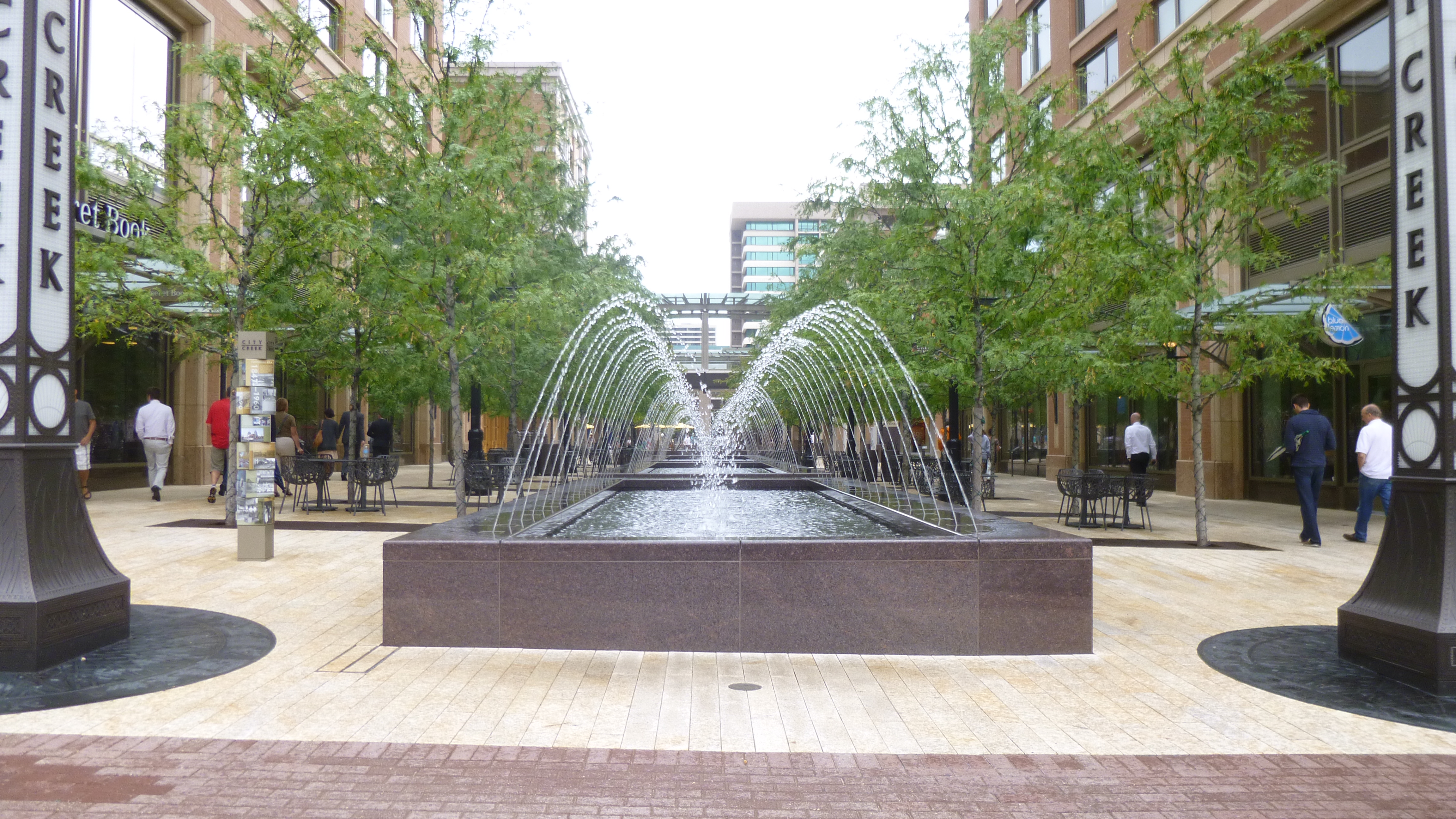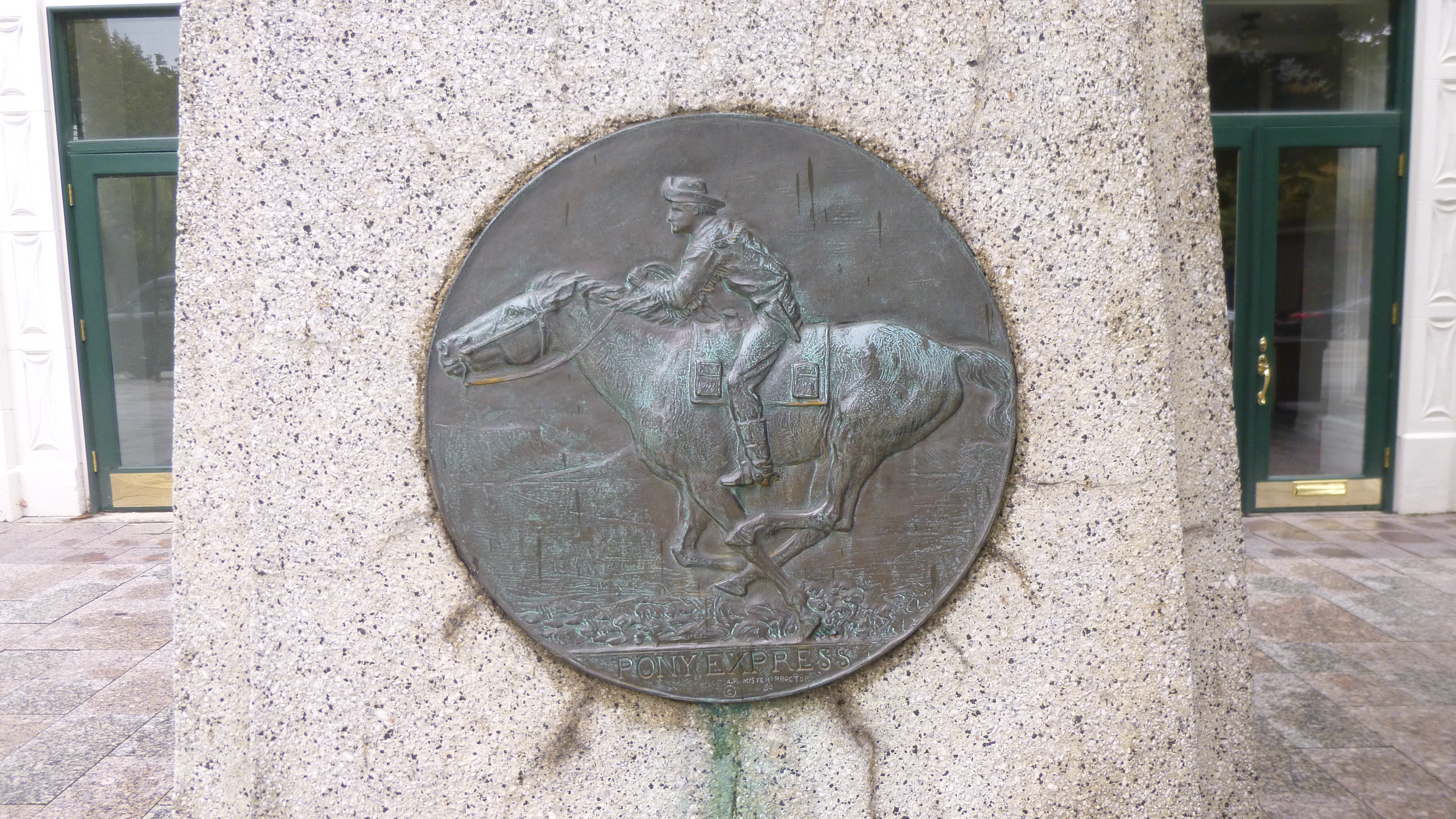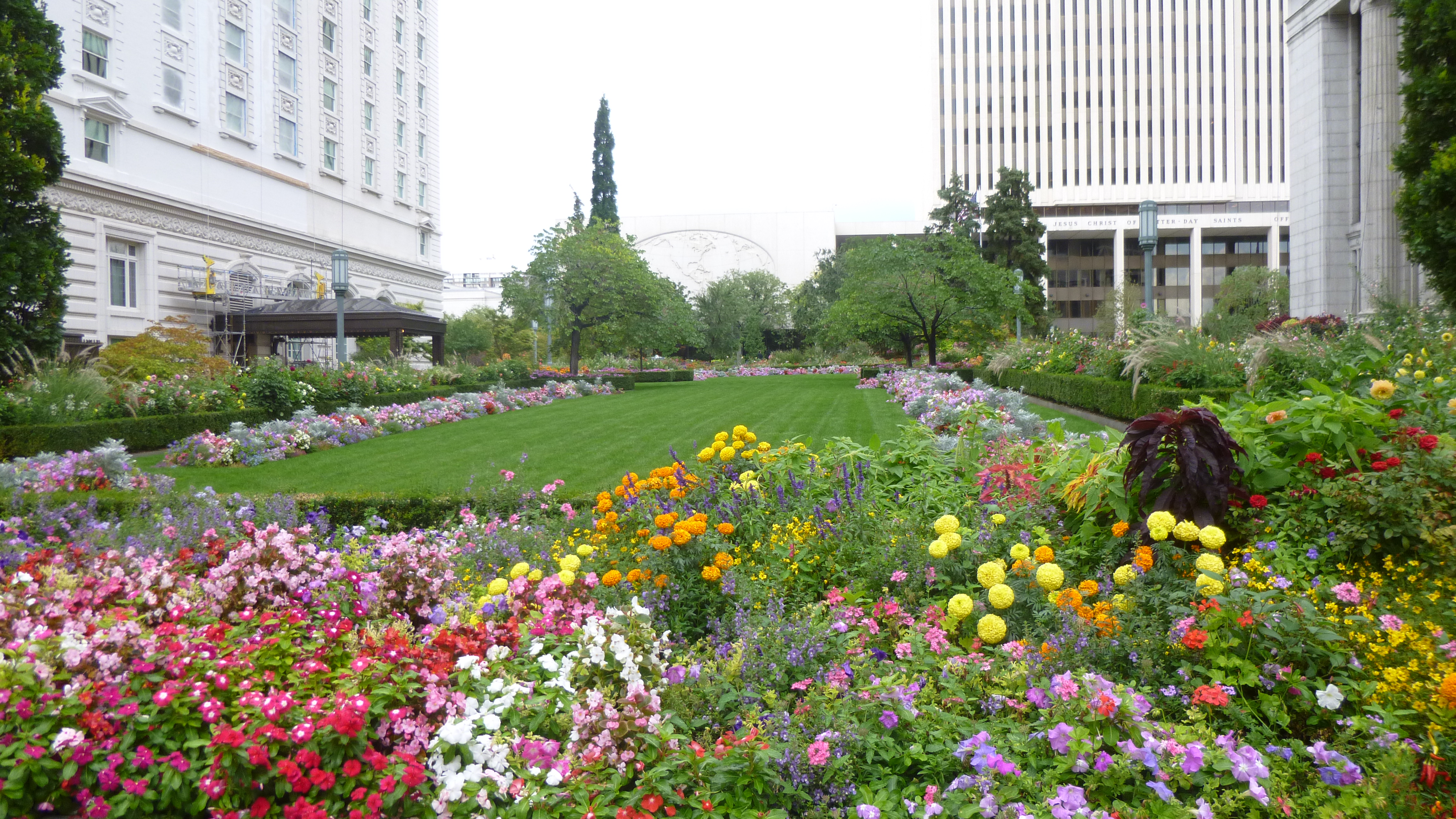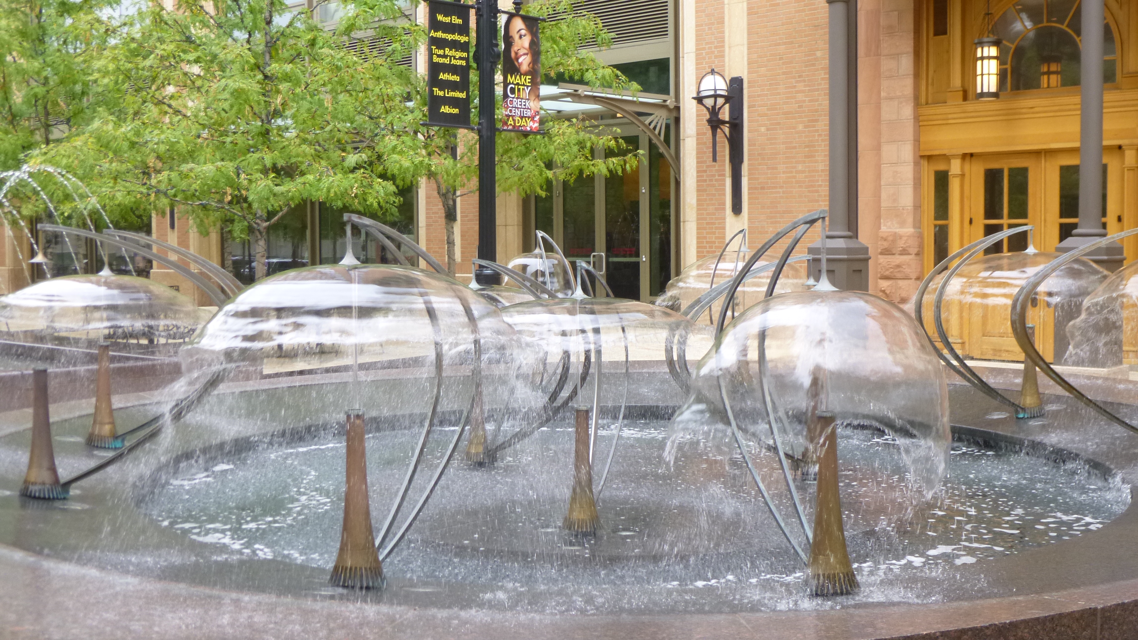 Then I drove down to the Temple Square area, and Tula and I walked all through that. It’s more than just the temple – it’s a whole complex encompassing many acres. The temple itself is huge, and there are lots of big Mormon buildings in the complex. There’s a many-storied office/building building, a large conference center, statues and monuments, and 2 elegant visitor centers, with large paintings depicting their religious story that one walks by even to get to the restrooms. The grounds are all landscaped and there were lots of pretty flower gardens. This is the world headquarters of the Church of Jesus Christ of Latter Day Saints (the long name for the Mormons!). The Mormon library and museum are also nearby. There seemed to be a lot of young men and women around, in addition to the few older ones – the guys were all in white dress shirts and dark dress slacks and the young ladies were all in demure below-the-knee skirts and blouses with tidy hair. They all seem eager to share the story of their religion, and I heard many different languages being spoken. There was at least one wedding going on, and I saw another bridal couple taking photos out on the beautiful grounds. After walking all around the whole area, Tula and I crossed the streets and walked through quite a bit of the rest of downtown Salt Lake City, including an outdoor shopping center with a creek and fountains and all. We covered a good 3 miles there. Salt Lake City was on the Pony Express route and there was a statue commemorating that era too.