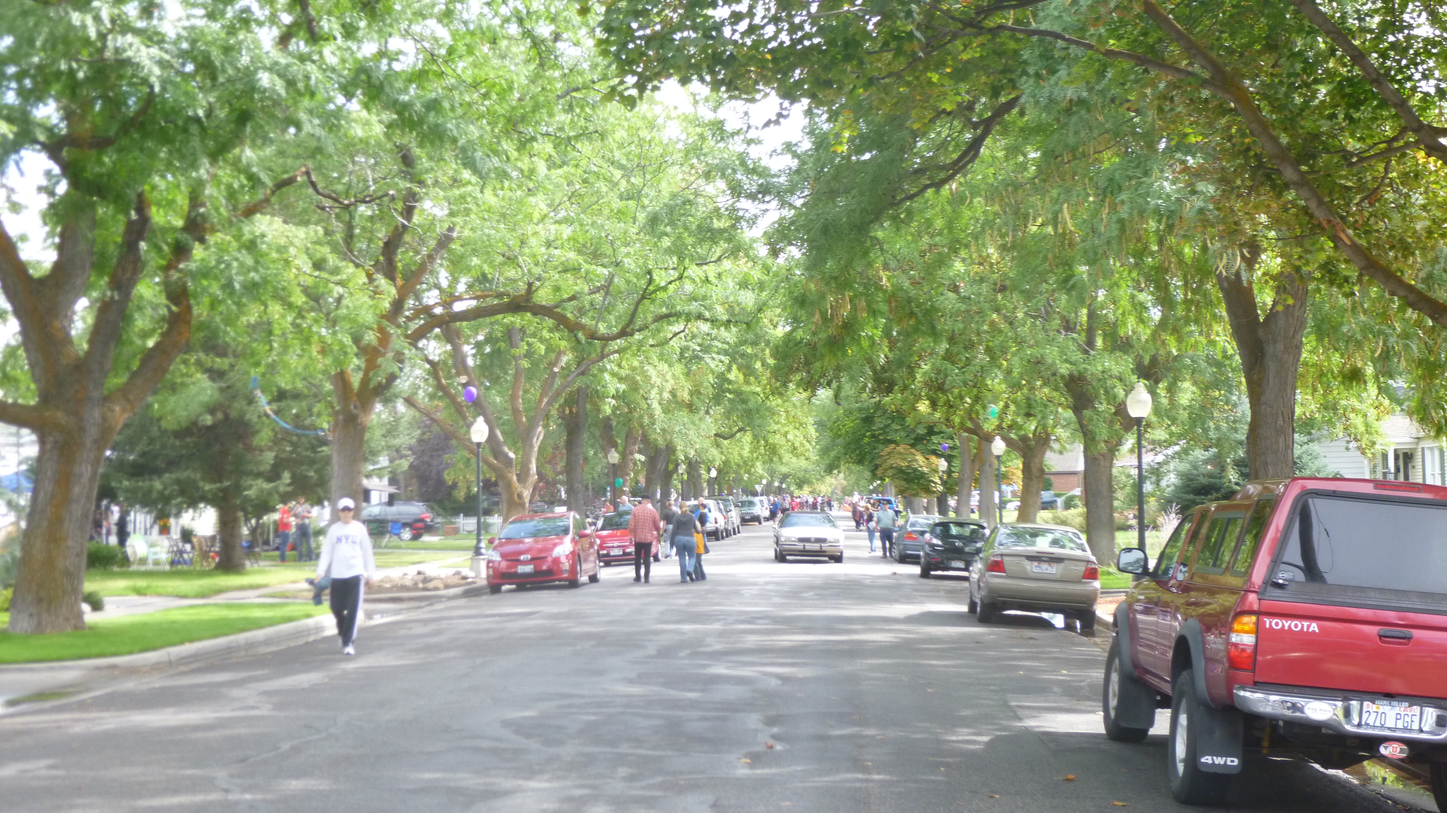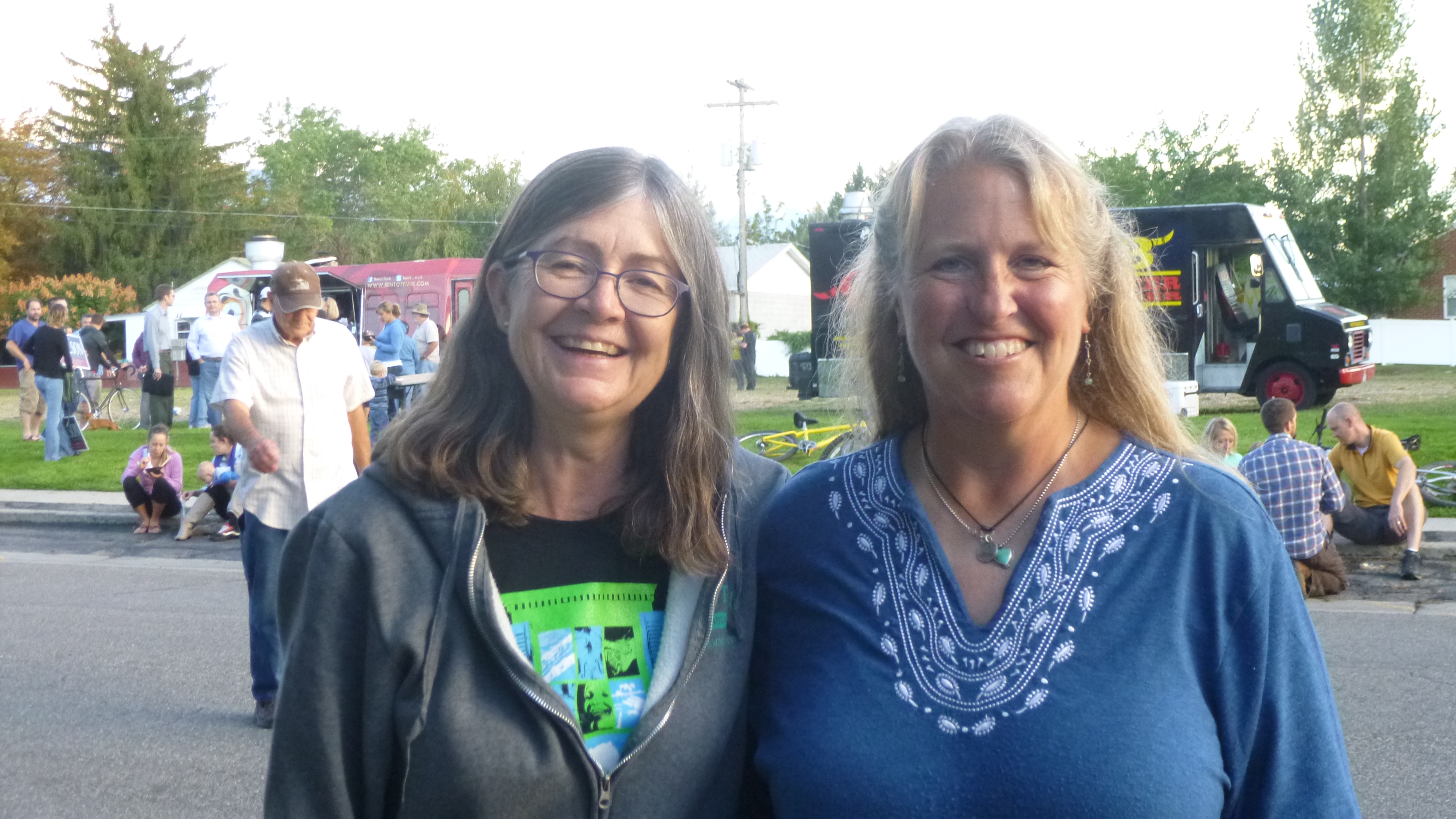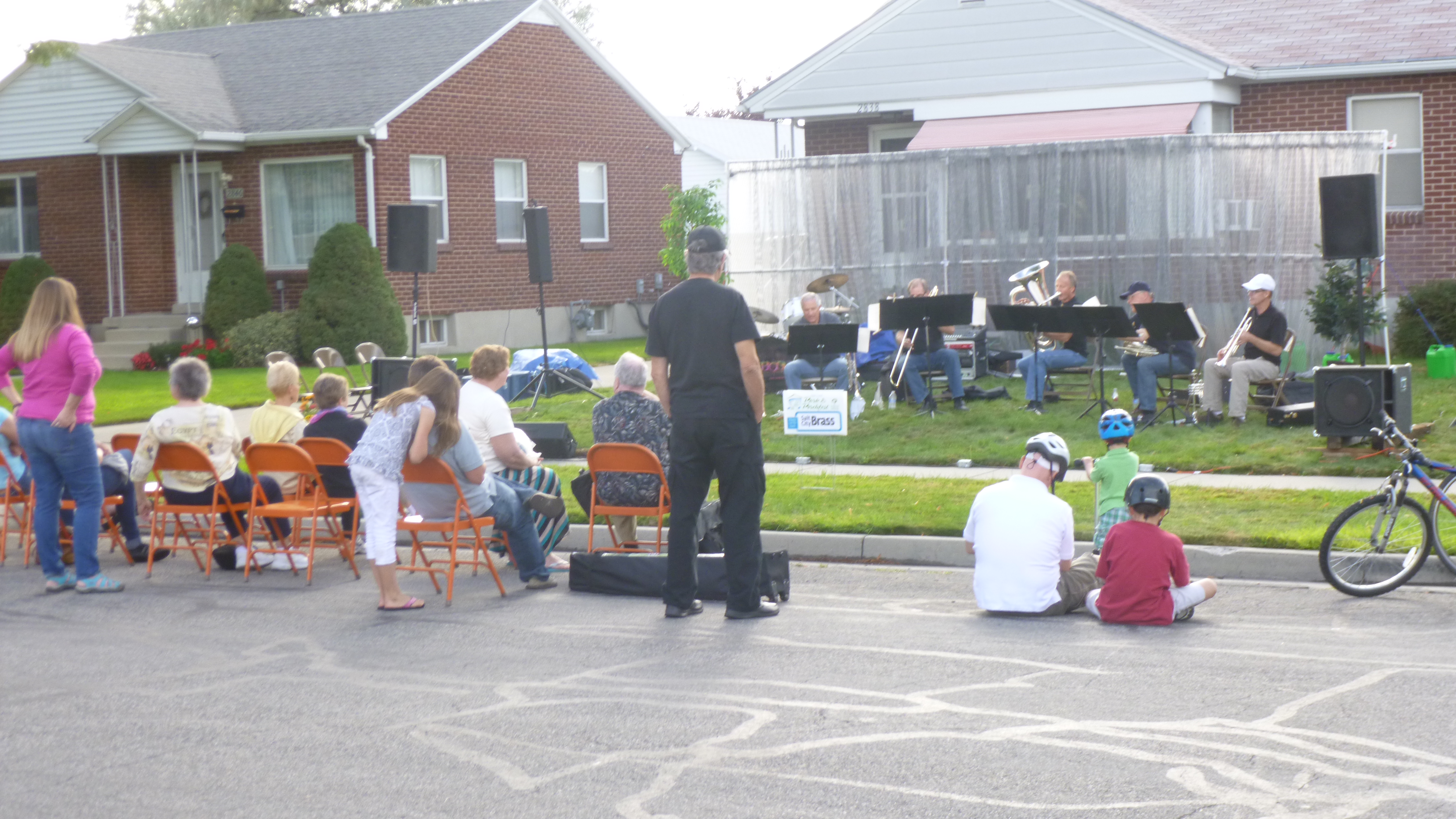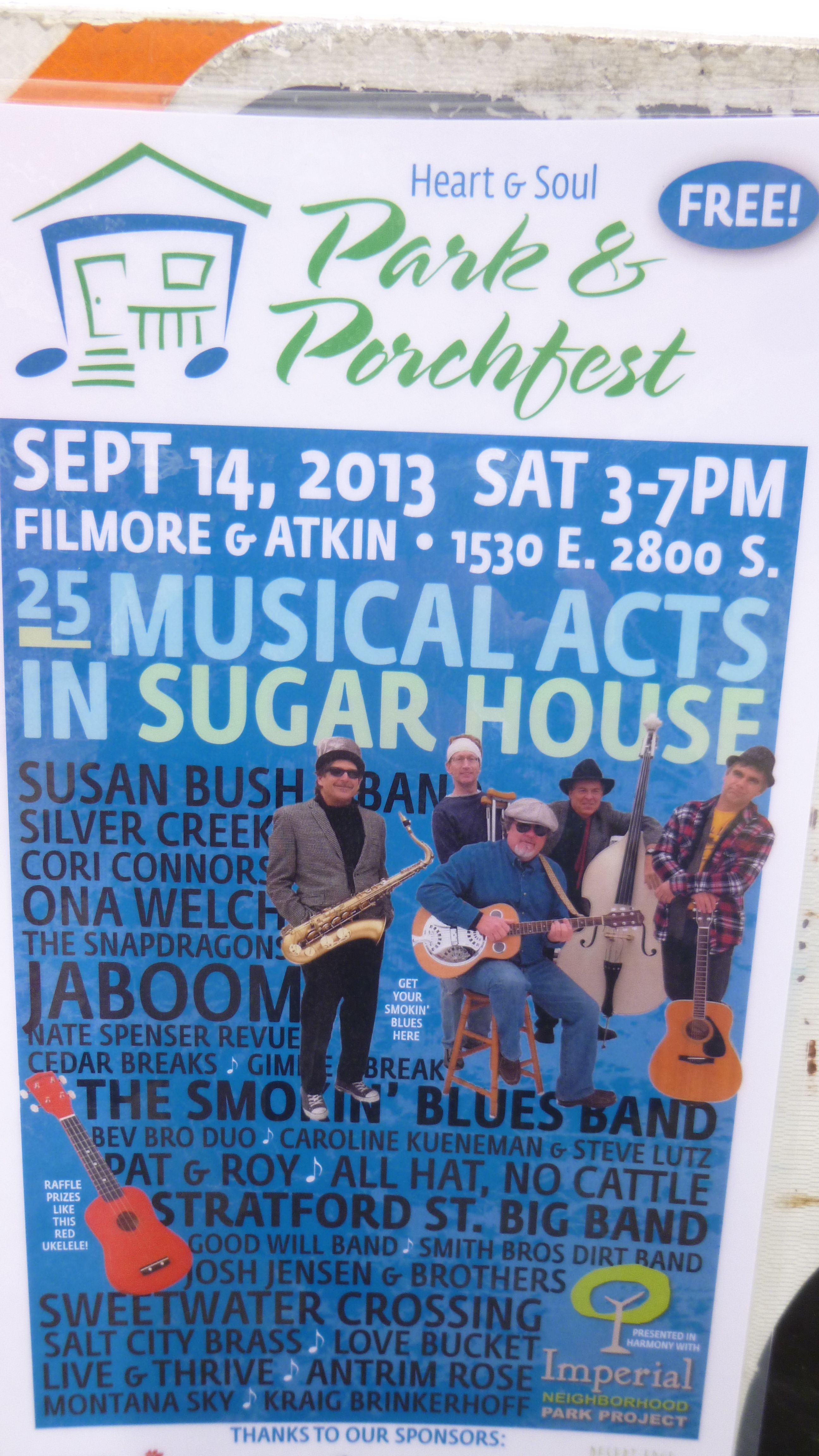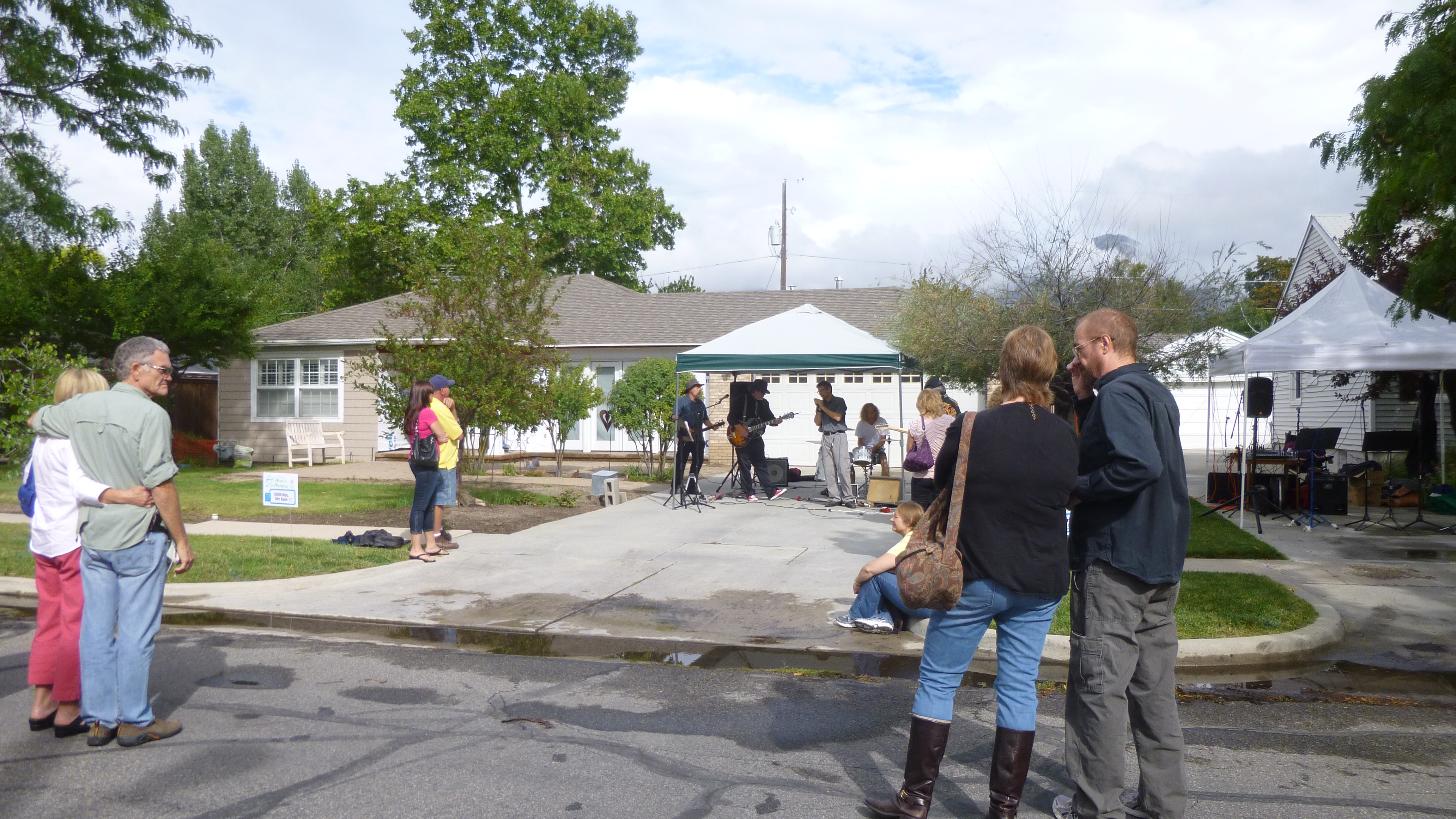 Then I set off to a southside neighborhood to go to a fundraising event called Porchfest. A couple days ago I had talked with an old high school friend, Perrine, who has lived in Salt Lake City ever since we graduated almost 40 years ago. She had a couple good donation suggestions and had told me about Porchfest, which is an annual gathering of 25 bands, and they all set up on the porches (or in driveways if the musicians don’t all fit on the porch) of numerous houses in one of the neighborhoods. The event goes on for several hours, and people can wander from porch to porch to listen to the music – the bands were spaced far enough apart so they didn’t try to play over each other. There was a whole variety of music – country, blue grass, big band, contemporary etc. The visitors could buy raffle tickets for a lot of prizes, and I think there was a silent auction as well. All the proceeds go to Heart and Soul, which is an organization which sends music groups (including the bands who were performing this afternoon) into long-term care facilities, hospitals, nursing homes, etc. to provide uplifting music free of charge to all the residents. I loved the idea – music can really help to raise the spirits! So I was happy to come to the event to both listen to the music and support the cause. I met up with my friend Perrine – we had only seen each other once in the last 40 years, and it was fun to meet up again and get a little caught up – we enjoyed our time together! She introduced me to some of her friends who were there, and we finally tracked down her friend who is the organizing force behind Heart and Soul, and I gave her my donation. I haven’t made a donation like this on my journey, and I just thought the whole idea was a lot of fun – fun for musicians, the neighbors and visitors wandering around, and good for the residents who ultimately benefit from the free mini-concerts that they get.