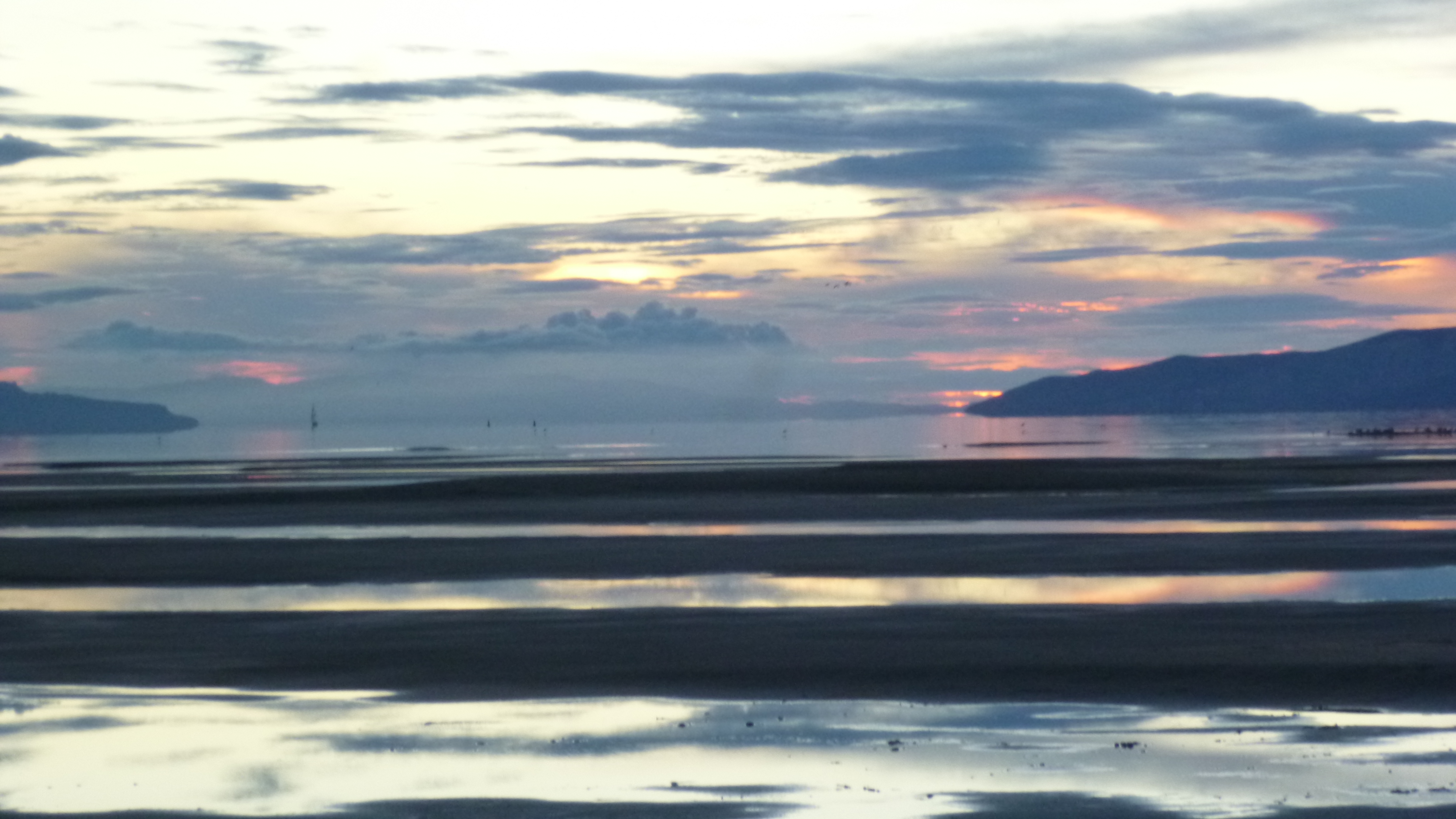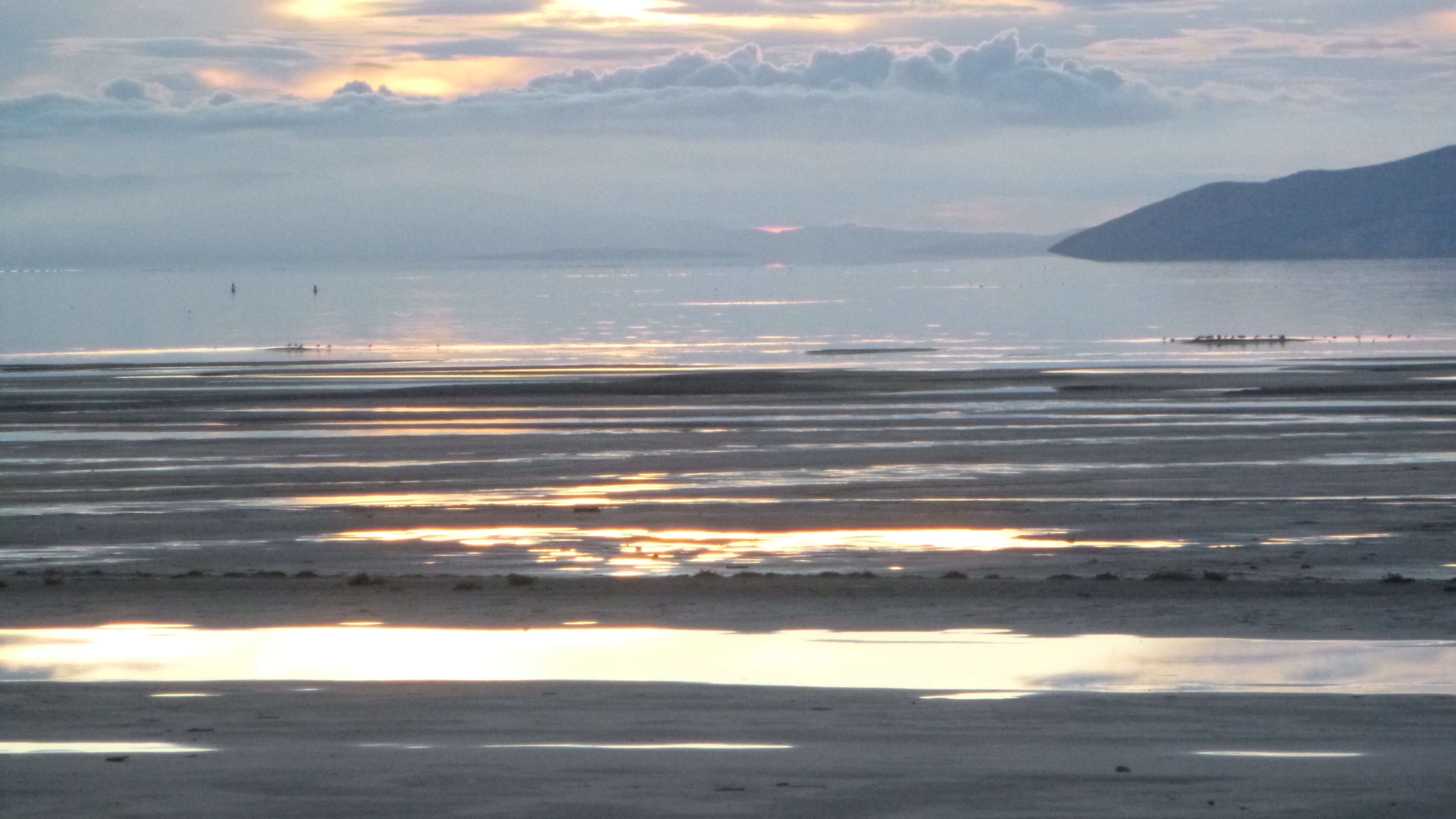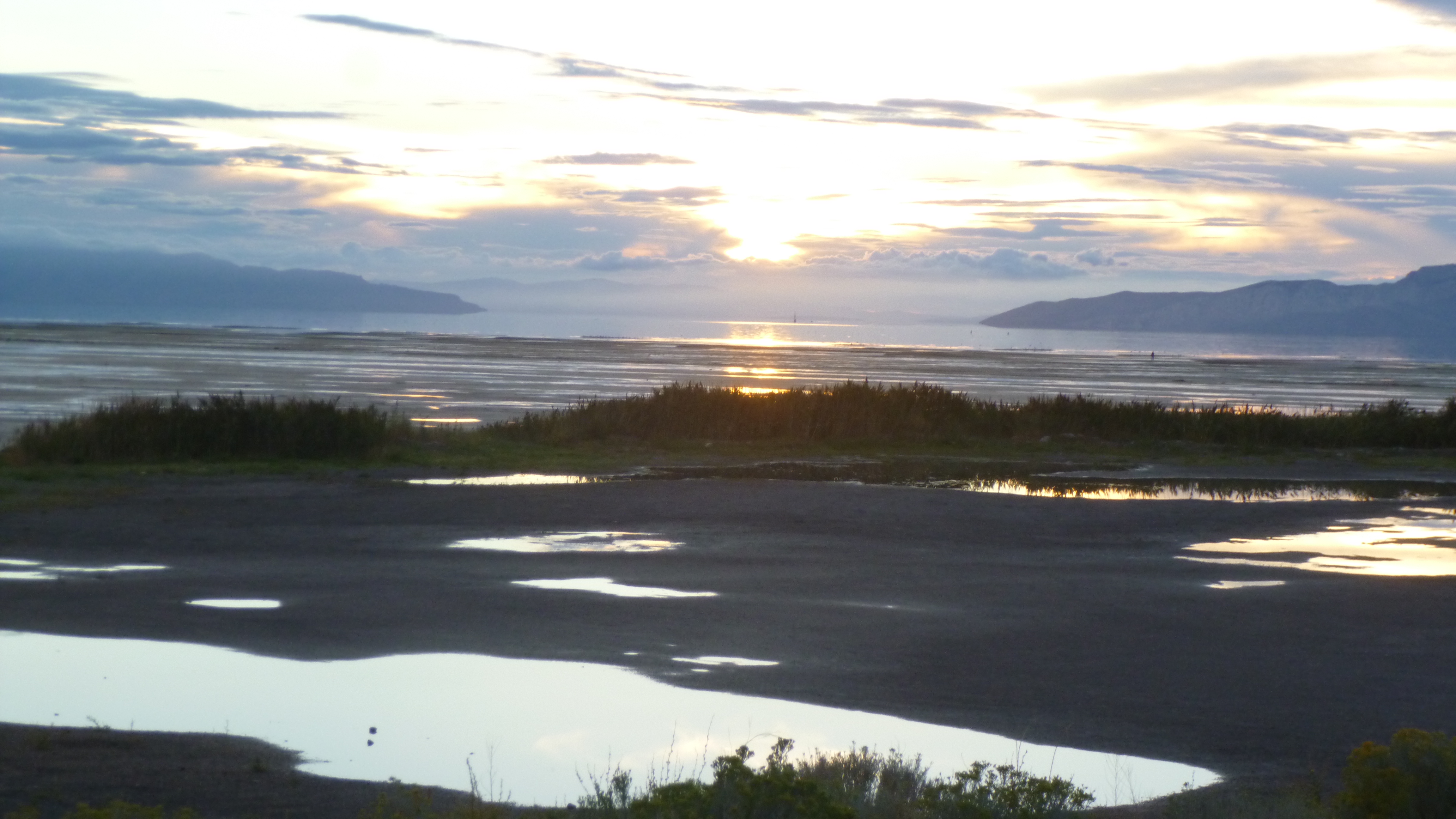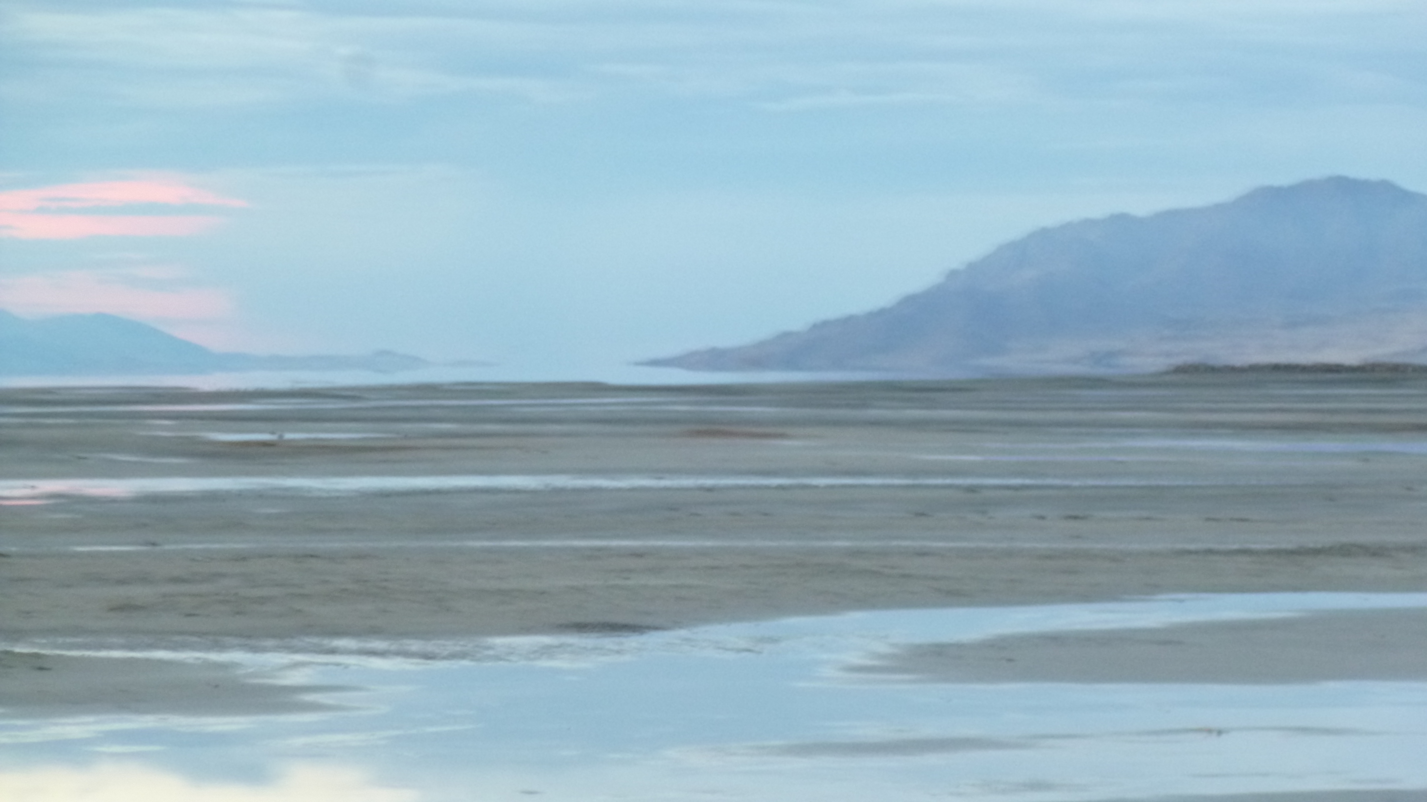 I left in time to try to get out to the Great Salt Lake – I couldn’t leave town without seeing that. The lake is huge, but Perrine gave me good directions how to get out to part of it. She cautioned me that the lake is very low, and the the water has receded way out from the normal shoreline. I got out there, and the sun had just set, but it was still light out. And it did seem kind of strange – all I could see at first was mud flats extending way out. It just looked like a dried-up lake. But I could indeed see water way out in the distance, and there were a couple people walking out on the sands, so I headed down there too. I had to walk a long ways out there, and in the fading light the whole place began to have kind of an eerie feel to it. I was walking on the sand, and there were small puddles of water in places, and dried up weeds, and even clumps of bird feathers like the birds had all died. There was a bad sulfur-like smell in the air, and these mud flats just kind of stretched out as far as I could see. There was no sign of life, and it was almost like I was the sole survivor of some catastrophic event – I think it was the clumps of bird feathers that did it. And to add to the unreal sense, the way the lighting was in the west almost made it appear like there were 2 suns setting simultaneously, which I sort of caught in my last photo that I attached. I did finally reach the edge of the water, but everything was so still and calm it was hard to see where the water ended and the sky began, especially in the evening light. It was hard to believe this was the Great Salt Lake. I hurried back in – I didn’t want to be out there in the total dark! I headed back to Midvale at the end of another full, busy day.