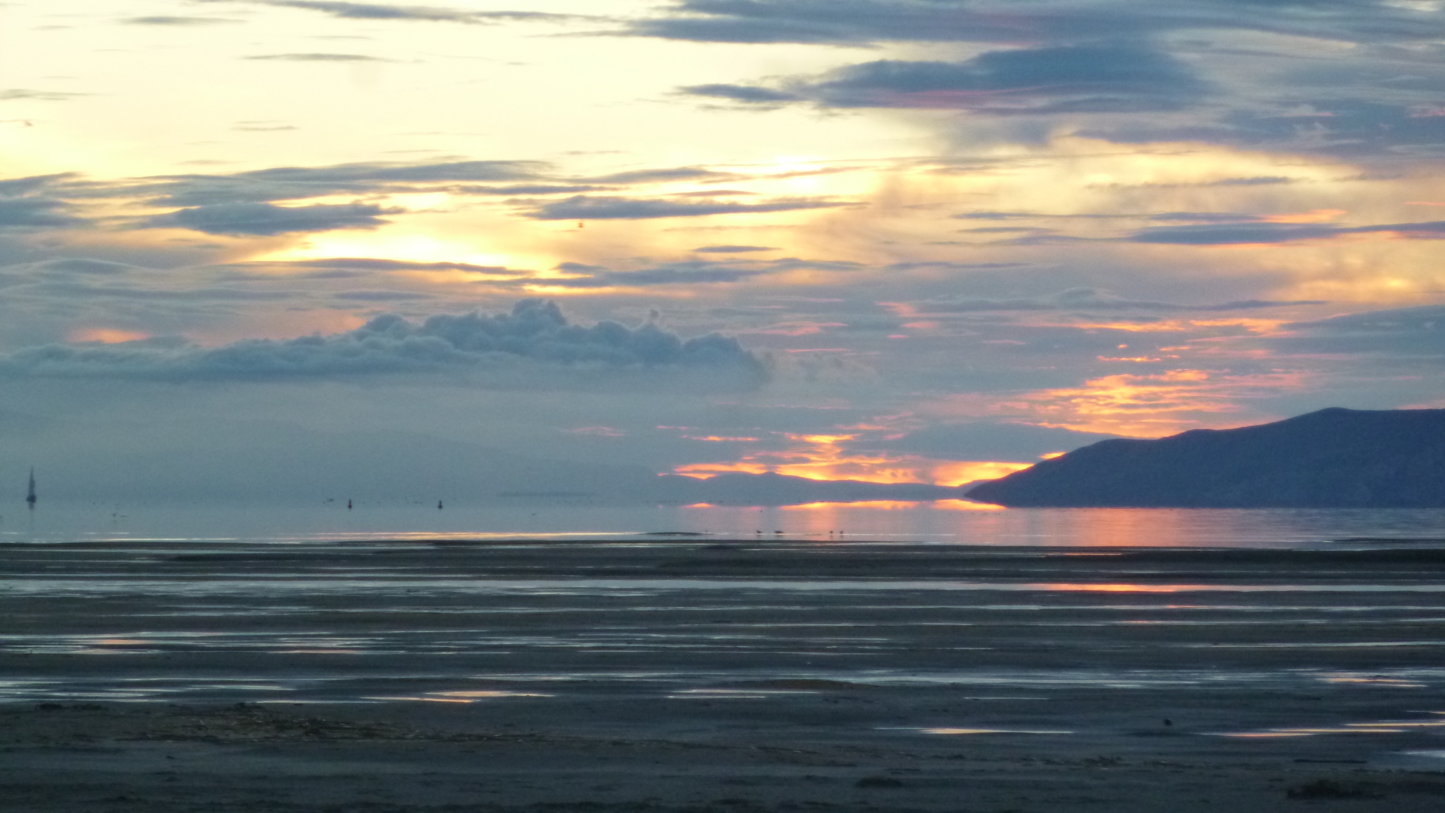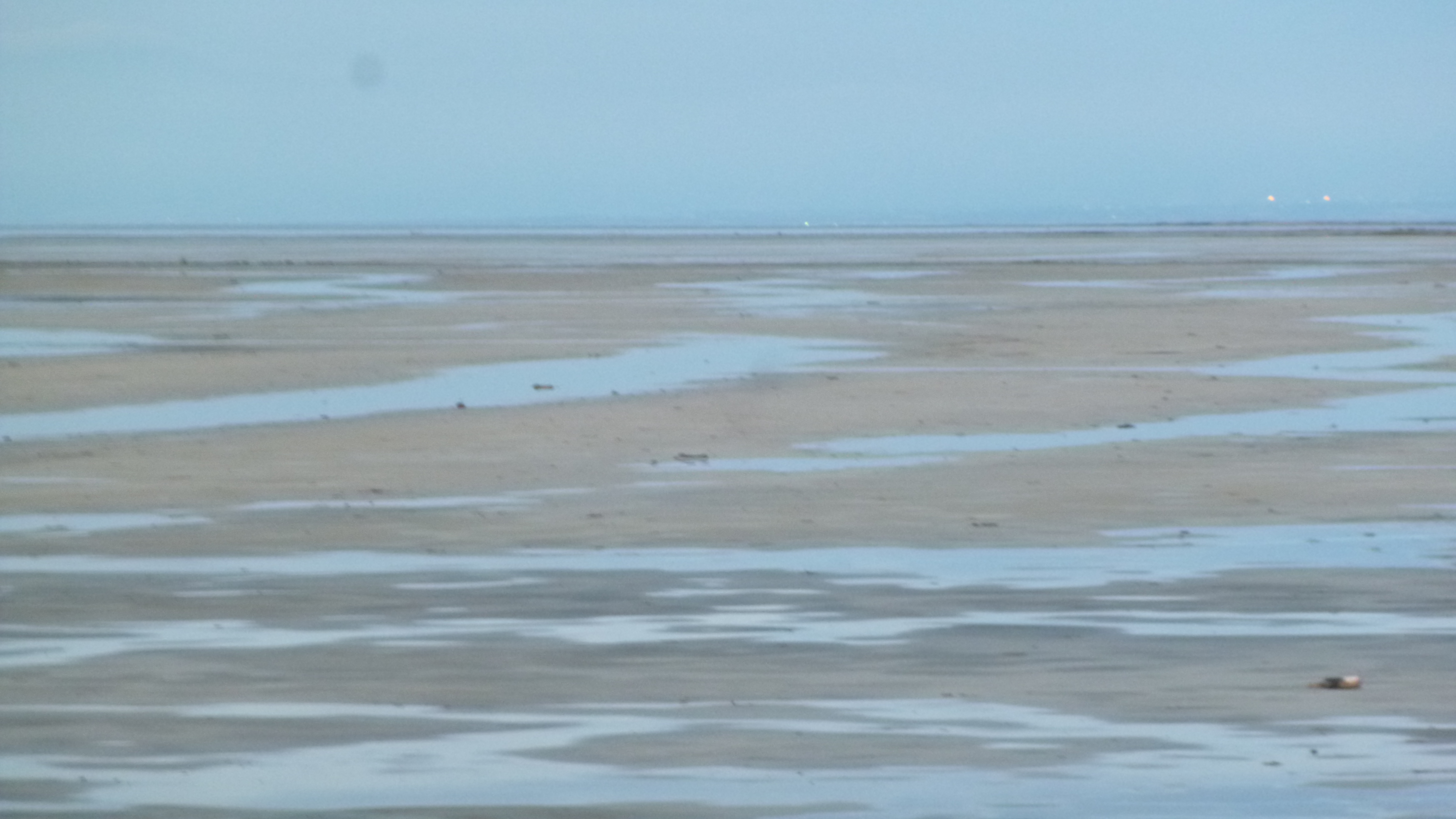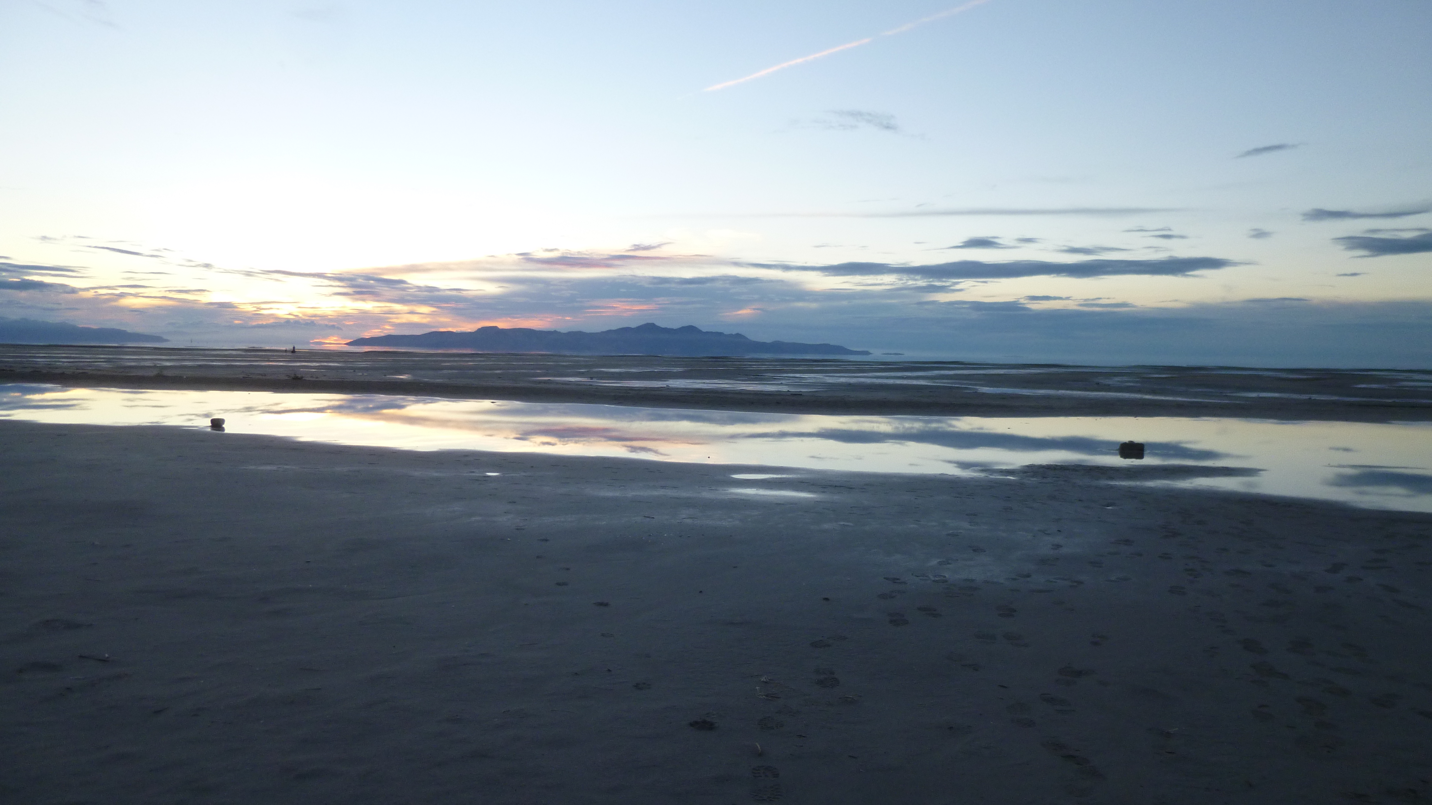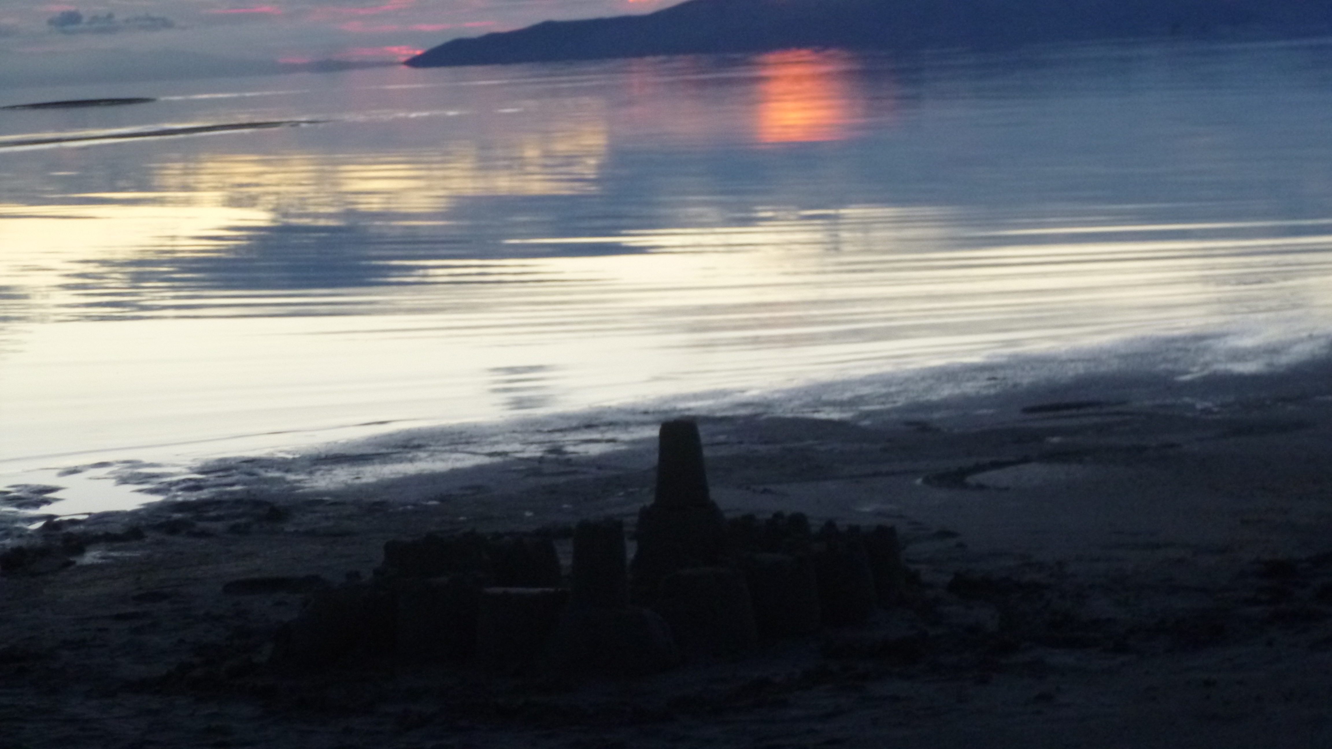 I left in time to try to get out to the Great Salt Lake – I couldn’t leave town without seeing that. The lake is huge, but Perrine gave me good directions how to get out to part of it. She cautioned me that the lake is very low, and the the water has receded way out from the normal shoreline. I got out there, and the sun had just set, but it was still light out. And it did seem kind of strange – all I could see at first was mud flats extending way out. It just looked like a dried-up lake. But I could indeed see water way out in the distance, and there were a couple people walking out on the sands, so I headed down there too. I had to walk a long ways out there, and in the fading light the whole place began to have kind of an eerie feel to it. I was walking on the sand, and there were small puddles of water in places, and dried up weeds, and even clumps of bird feathers like the birds had all died. There was a bad sulfur-like smell in the air, and these mud flats just kind of stretched out as far as I could see. There was no sign of life, and it was almost like I was the sole survivor of some catastrophic event – I think it was the clumps of bird feathers that did it. And to add to the unreal sense, the way the lighting was in the west almost made it appear like there were 2 suns setting simultaneously, which I sort of caught in my last photo that I attached. I did finally reach the edge of the water, but everything was so still and calm it was hard to see where the water ended and the sky began, especially in the evening light. It was hard to believe this was the Great Salt Lake. I hurried back in – I didn’t want to be out there in the total dark! I headed back to Midvale at the end of another full, busy day.