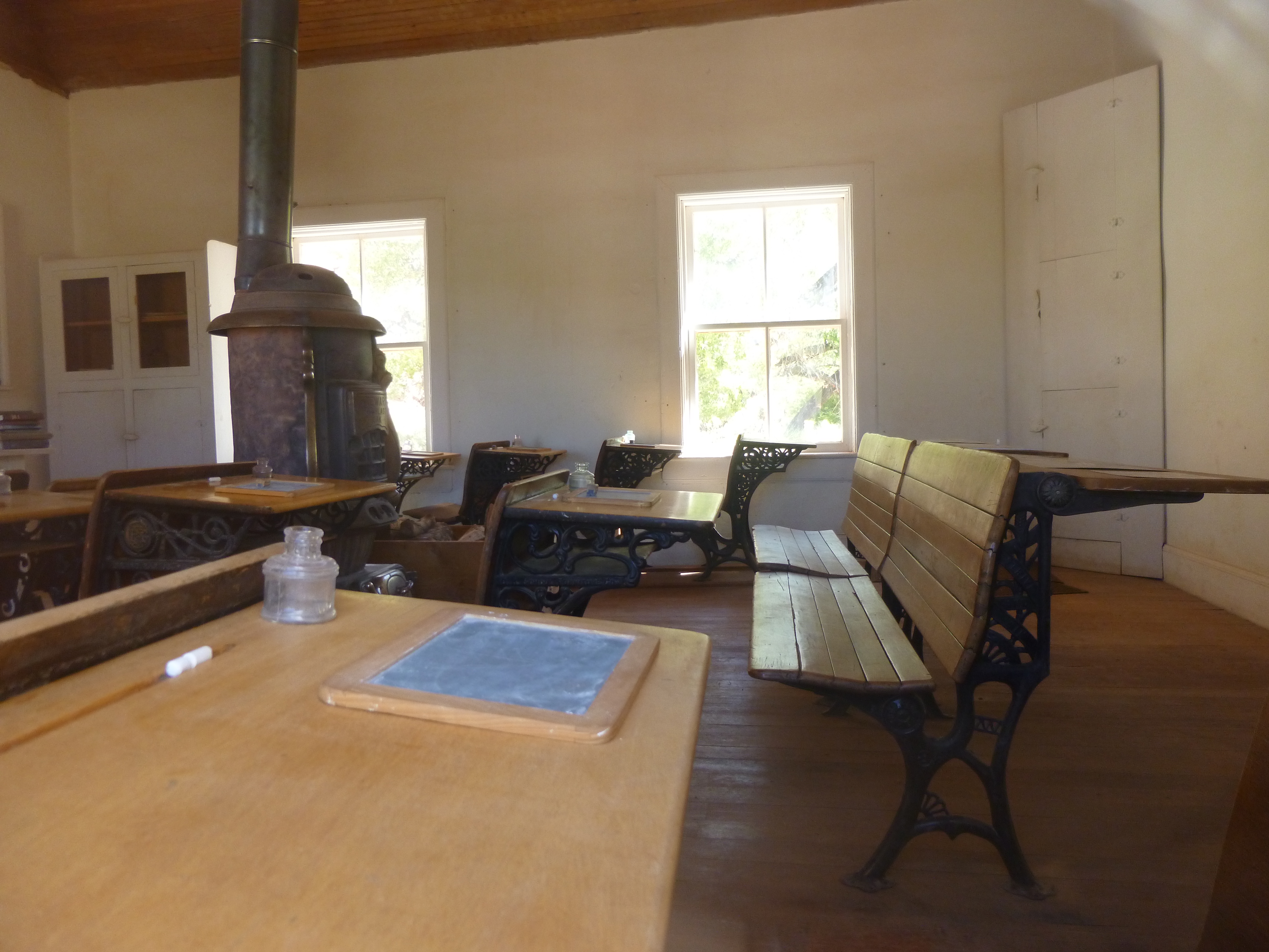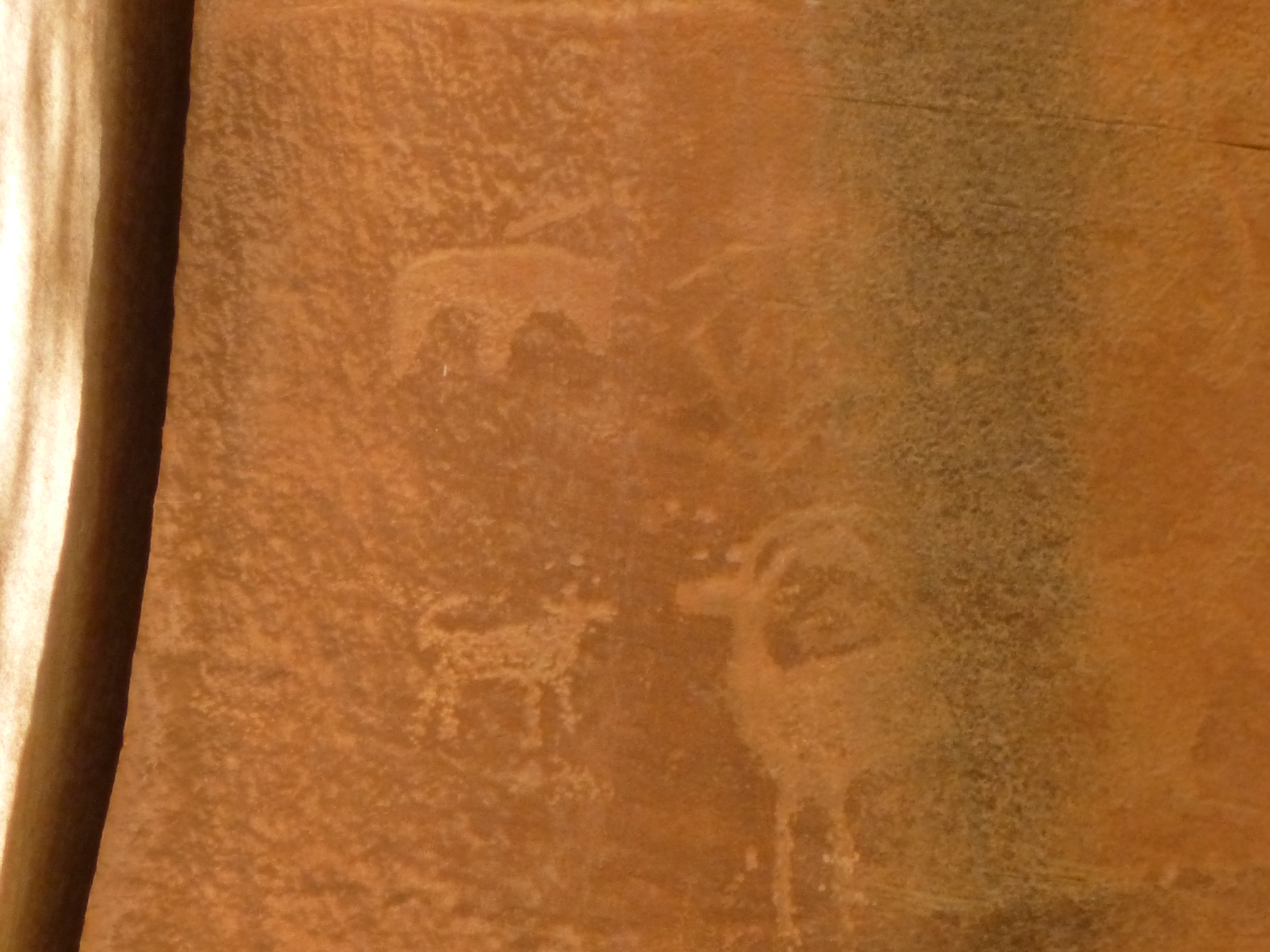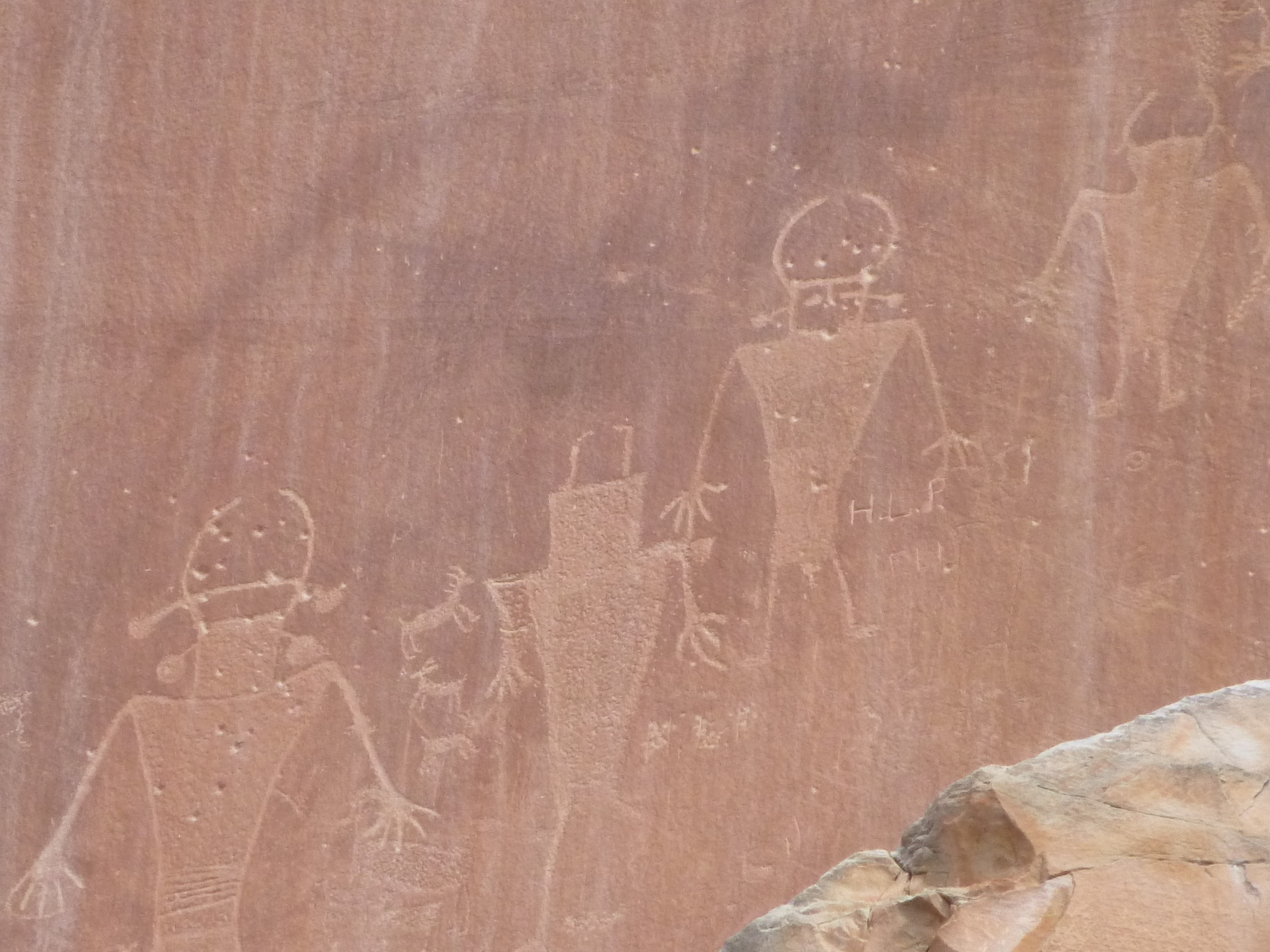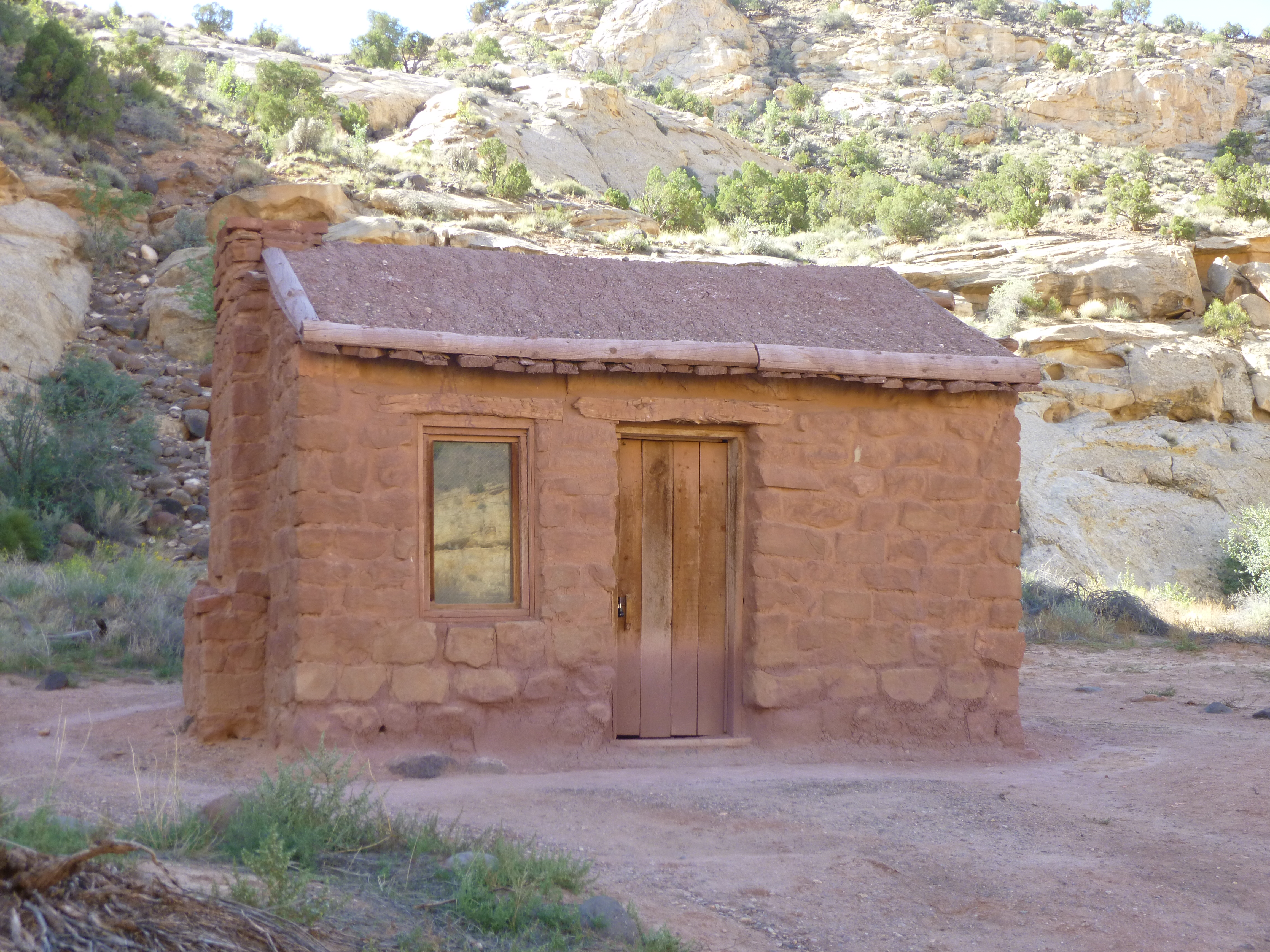 When I was finished with that walk, I drove a little farther to an area where there are some petroglyphs on the rock walls. Visitors can walk along a boardwalk along the side of the cliffs, but can’t get close enough to touch, which is the point! By now I was in a little valley that the early (mostly Mormon) settlers had turned into an orchard. The area was called Fruita, and there were lots of groves of fruit trees, many of which still produce fruit today. There was also a one room house still standing – it was home to a family of 10 (parents and youngest kids slept inside; girls slept in wagon bed outside; and boys slept in a hollowed out depression in rock wall). And there was an old one-room schoolhouse too, complete with old desks and ink wells and all.
