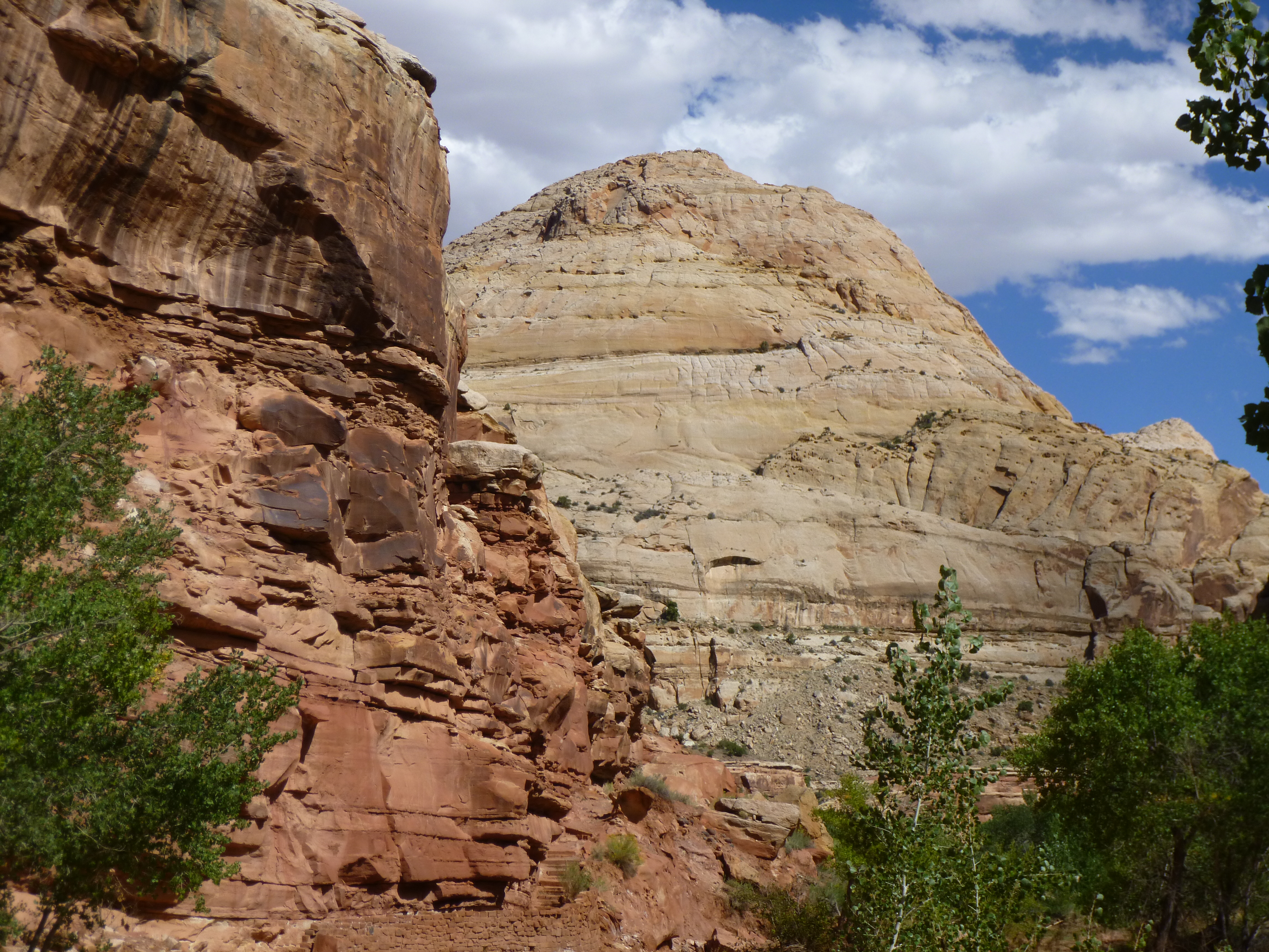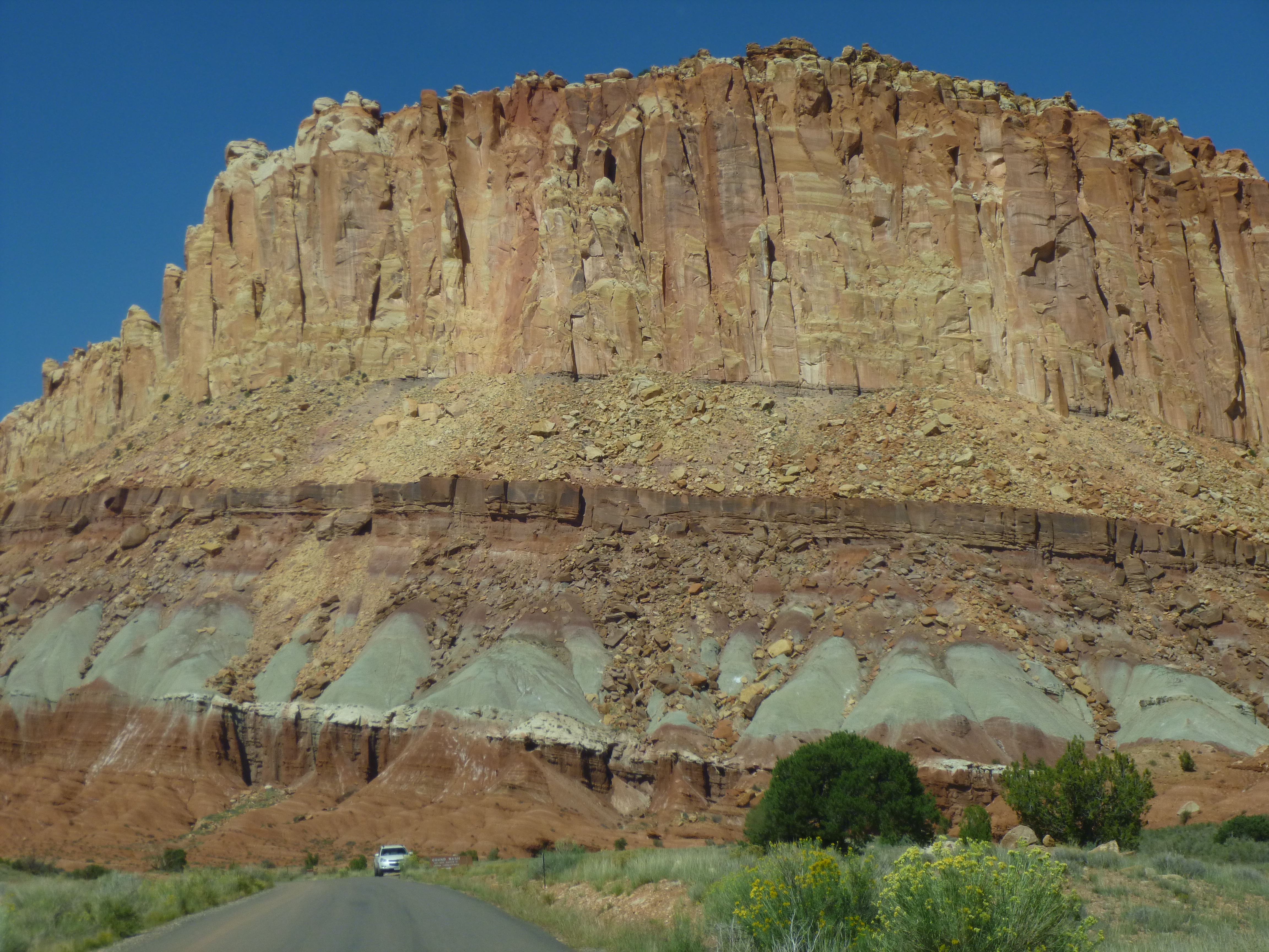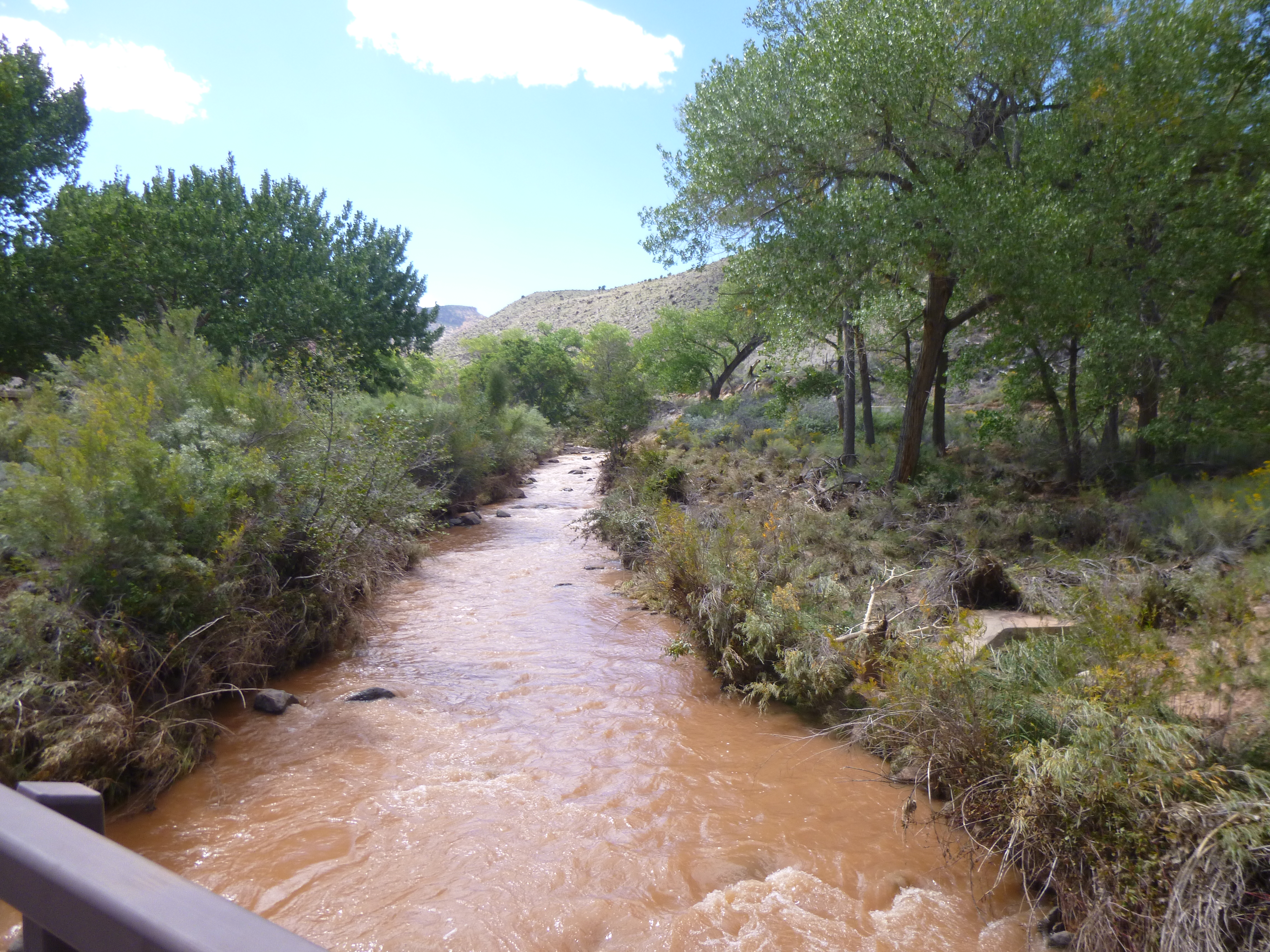 Then I stopped at the visitor center, and found out there was a river trail that dogs could go on, so Tula and I set off for a nearly 2 mile walk along the river, past still more orchards, picnic areas and the campground. Then I headed out for the scenic drive up to see the main feature of the park, called Waterpocket Fold, which is a “warp” in the earth’s crust where new and old layers of the earth are folded over each other. It’s such a big gouge in the earth that they say it’s visible from space. But sadly, about 7-8 miles into the drive, the road was closed – parts of it had washed out due to the heavy recent rains, so I was unable to get to a good vantage point to see the fold. I will have to come back!