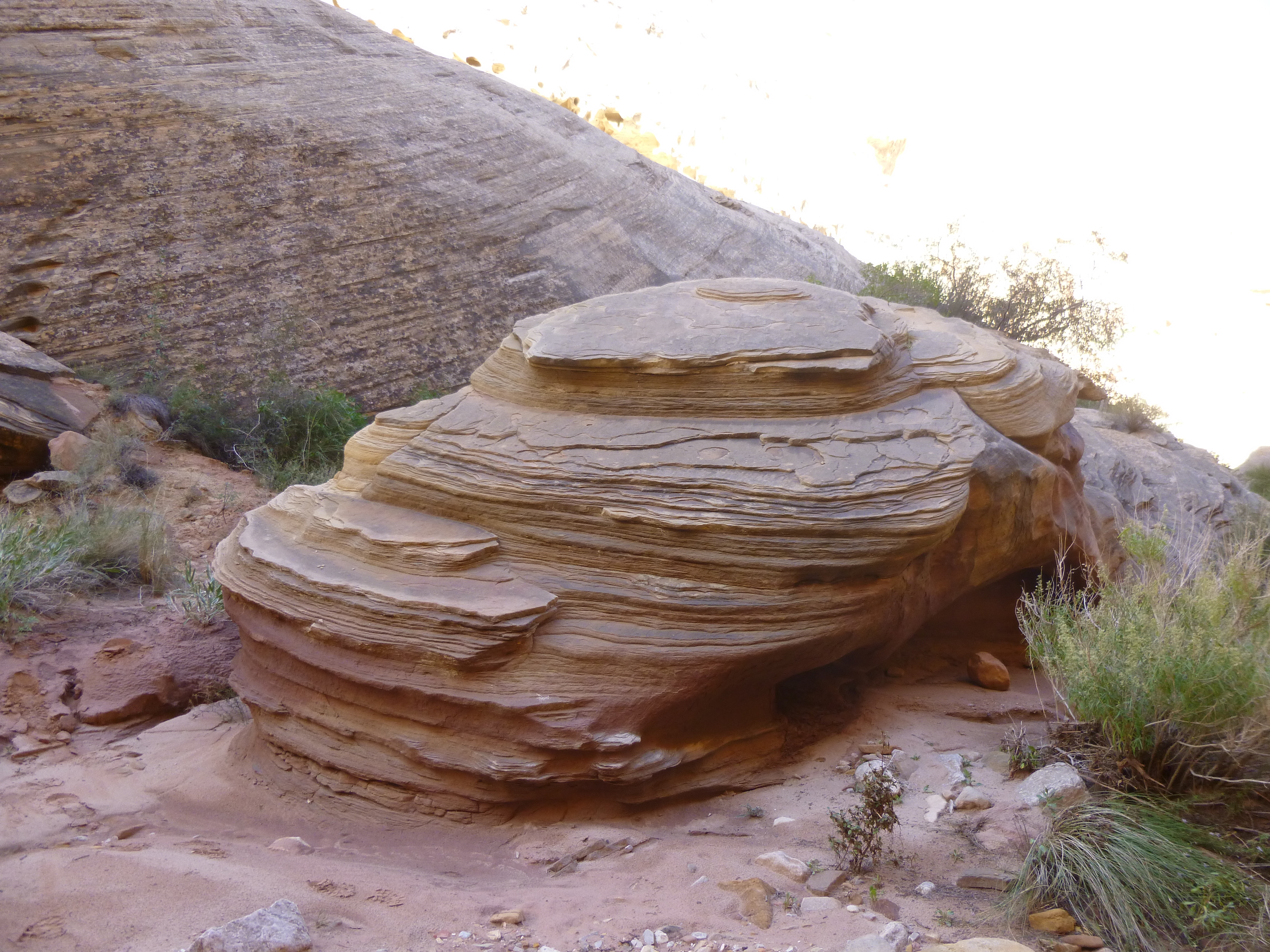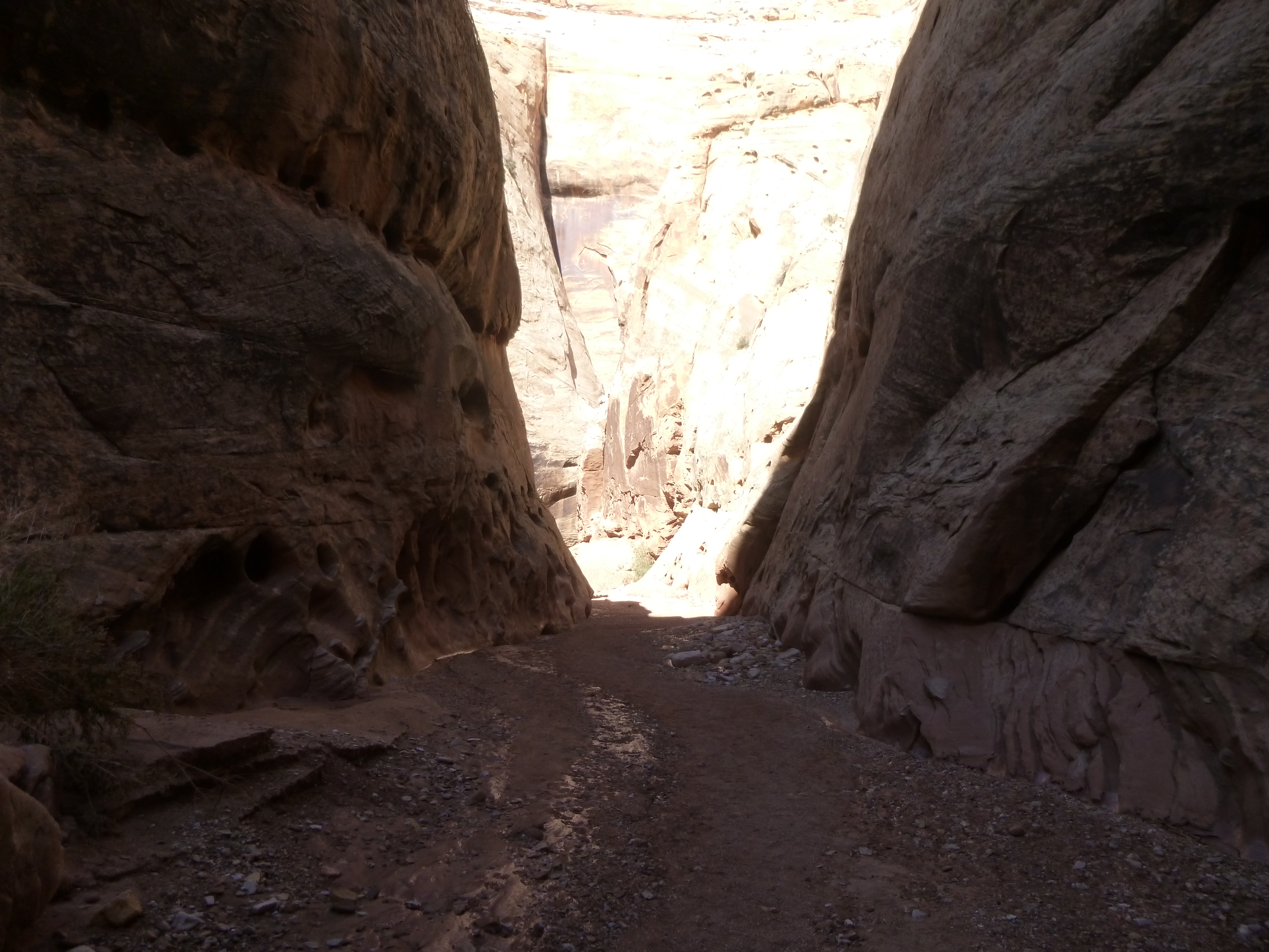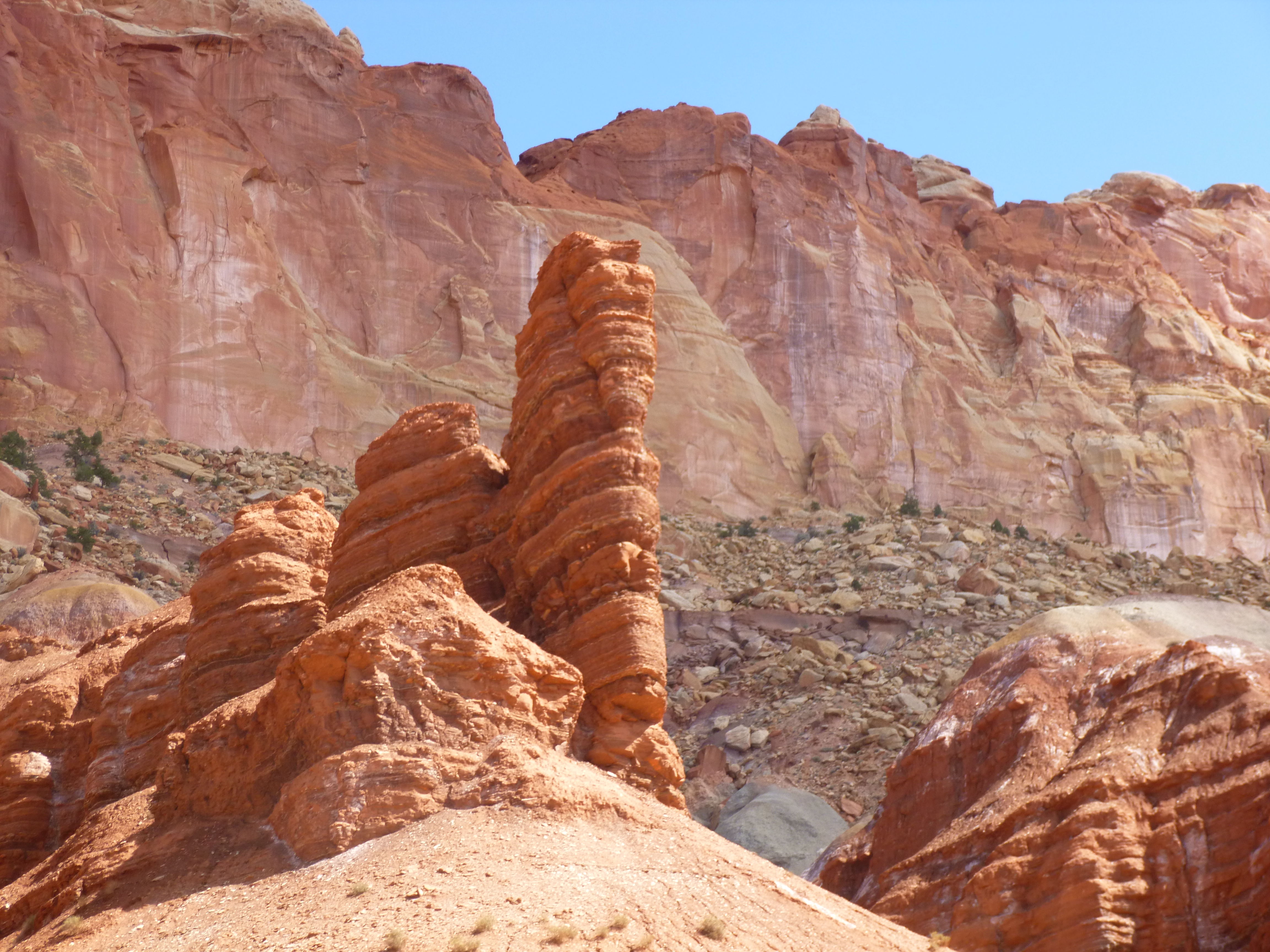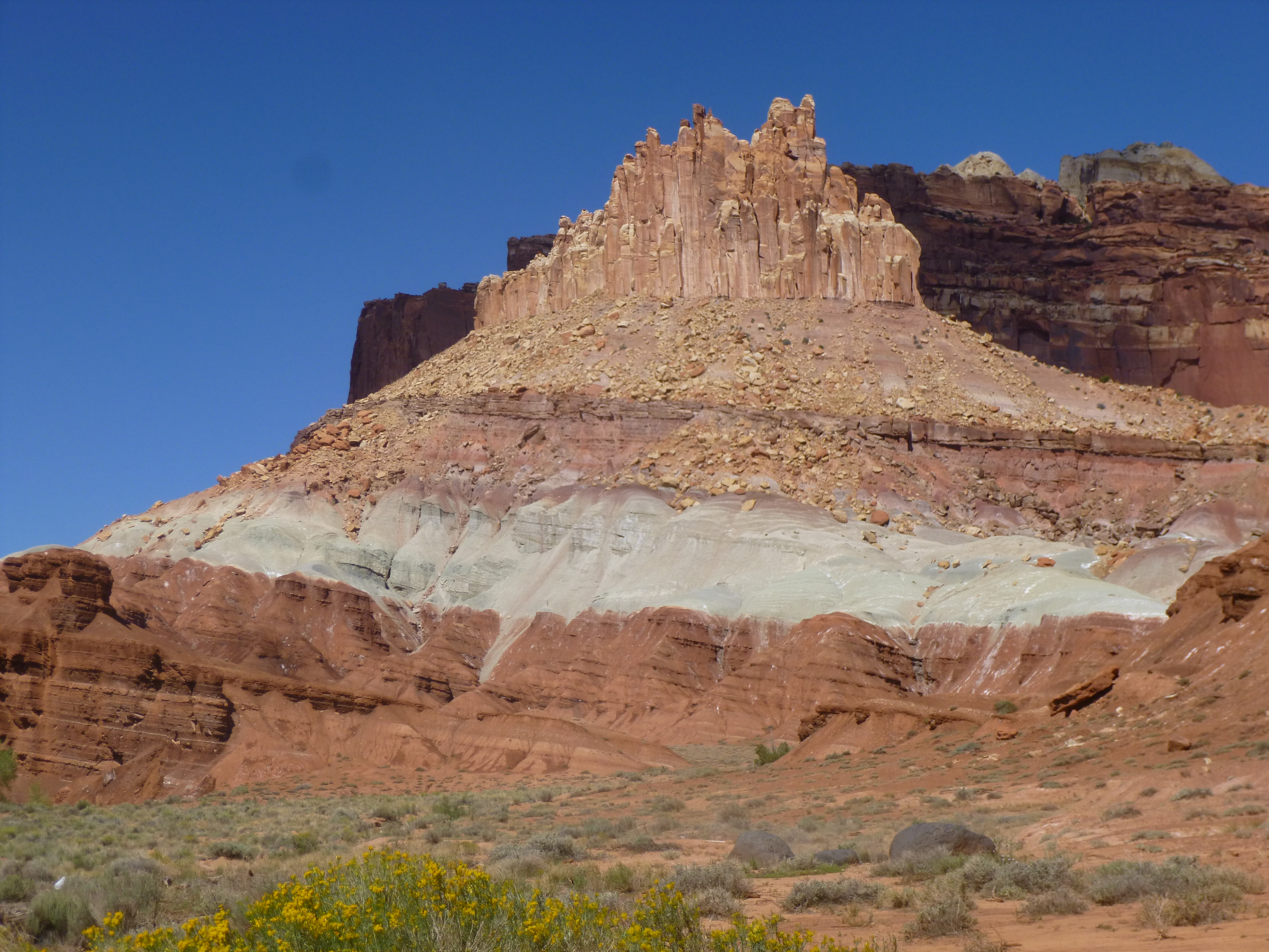 Then I stopped at the visitor center, and found out there was a river trail that dogs could go on, so Tula and I set off for a nearly 2 mile walk along the river, past still more orchards, picnic areas and the campground. Then I headed out for the scenic drive up to see the main feature of the park, called Waterpocket Fold, which is a “warp” in the earth’s crust where new and old layers of the earth are folded over each other. It’s such a big gouge in the earth that they say it’s visible from space. But sadly, about 7-8 miles into the drive, the road was closed – parts of it had washed out due to the heavy recent rains, so I was unable to get to a good vantage point to see the fold. I will have to come back!