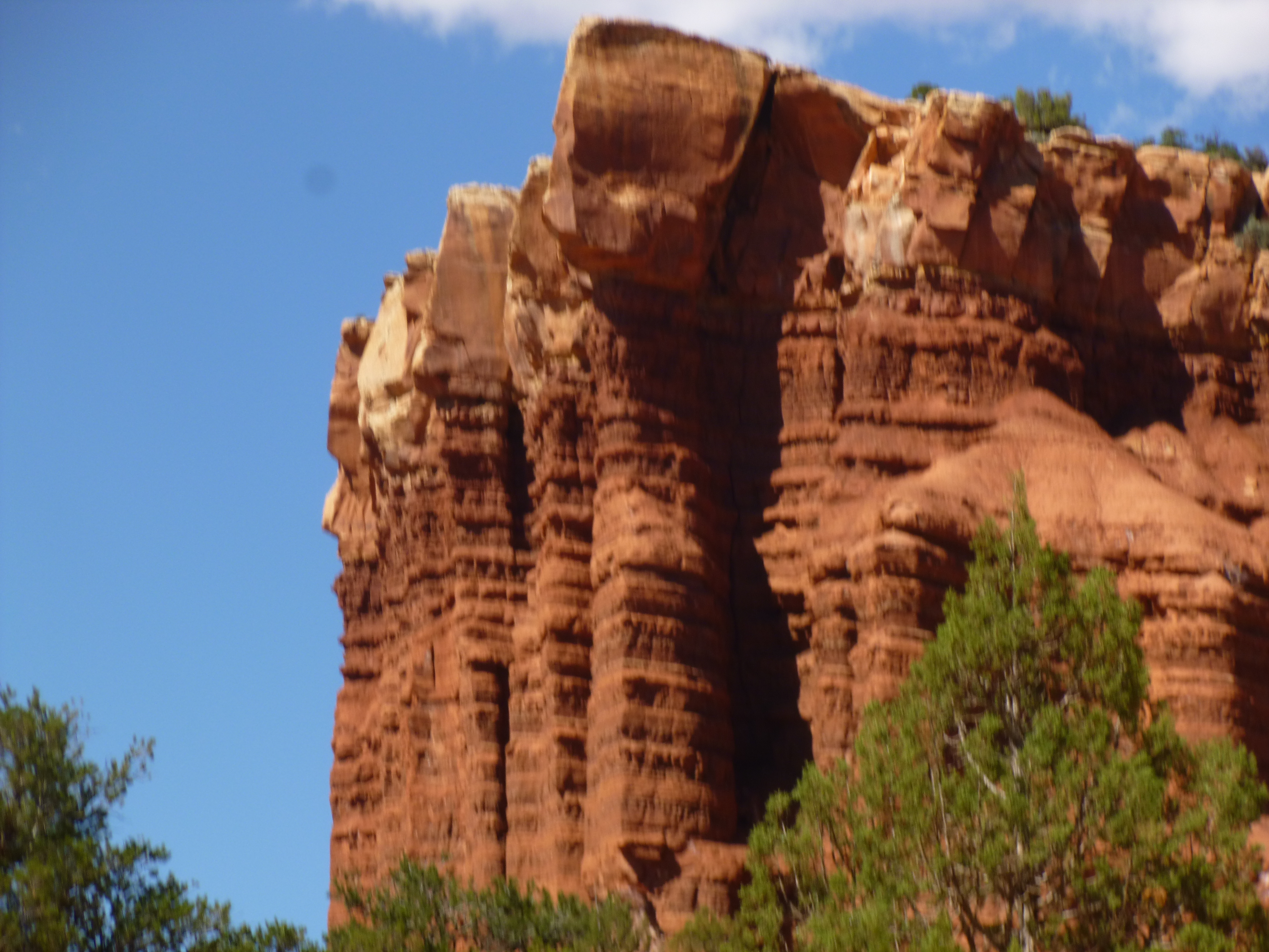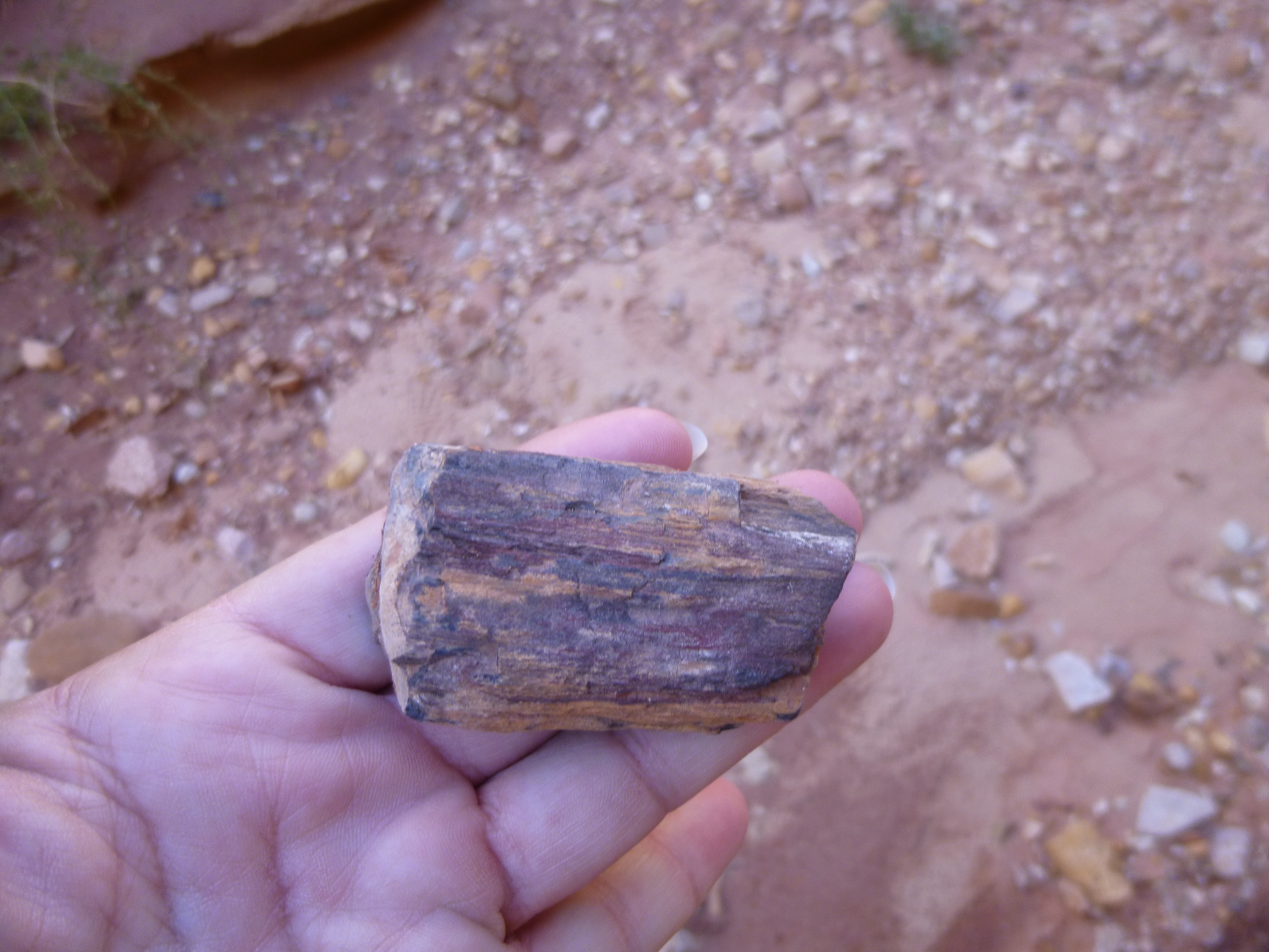 After I packed up the campsite, I started my morning with a breakfast at Duke’s Slickrock Cafe, which was the little restaurant that the campground was behind. With a name like that, I had to get a good egg and hashbrown breakfast! And then I drove the 30 miles or so to the one other national park that I wanted to visit before heading toward Salt Lake City. This one was Capitol Reef National Park – another park I’d never heard of before! Just inside the park boundaries was a hike through a gorge called The Grand Wash, and visitors were told not to begin the hike if rain was in the forecast, because this is an area where flash floods occur. But the sky was clear and blue and other hikers were out and about, so I headed into the canyon. I took a wonderful 3 1/2 mile walk alongside immense red rock walls, some with little “caves” going deep into the rock, and cracks and holes and all – Mother Nature’s work is never done! The walls got so close together that the sun was blocked out for a good bit of the walk. I ran across a couple of local ladies who were also out walking, just because they wanted to see if there was anything new and unusual in the canyon that might have surfaced after the recent heavy rains, and sure enough, they picked up (but did not keep) a piece of petrified wood. I was able to hold it and get a picture too. (And that reminds me of a news report I heard that panning for gold in Colorado is experiencing a surge with all the recent rain and flooding that has knocked loose rocks and other debris where gold can now be found.)