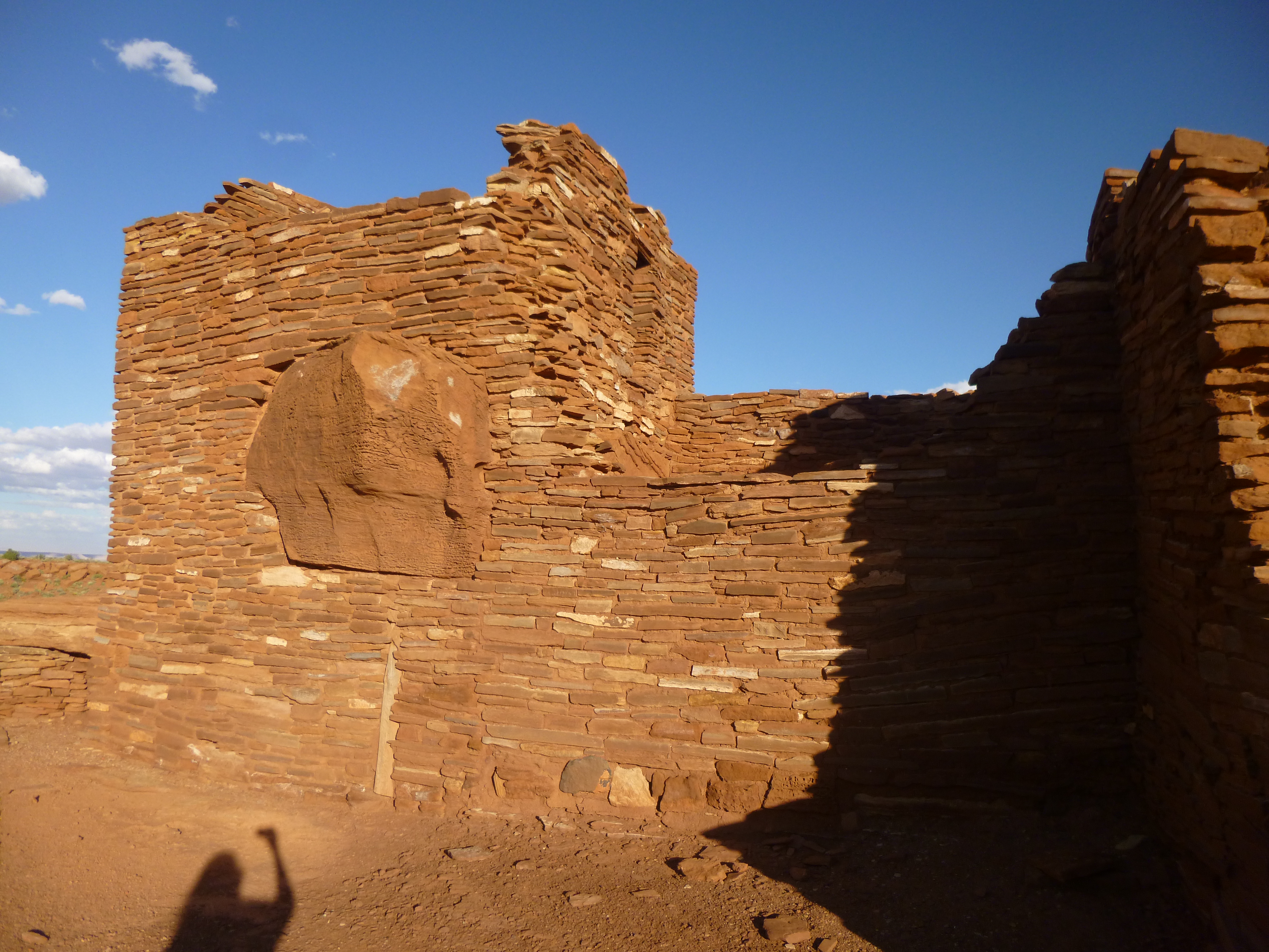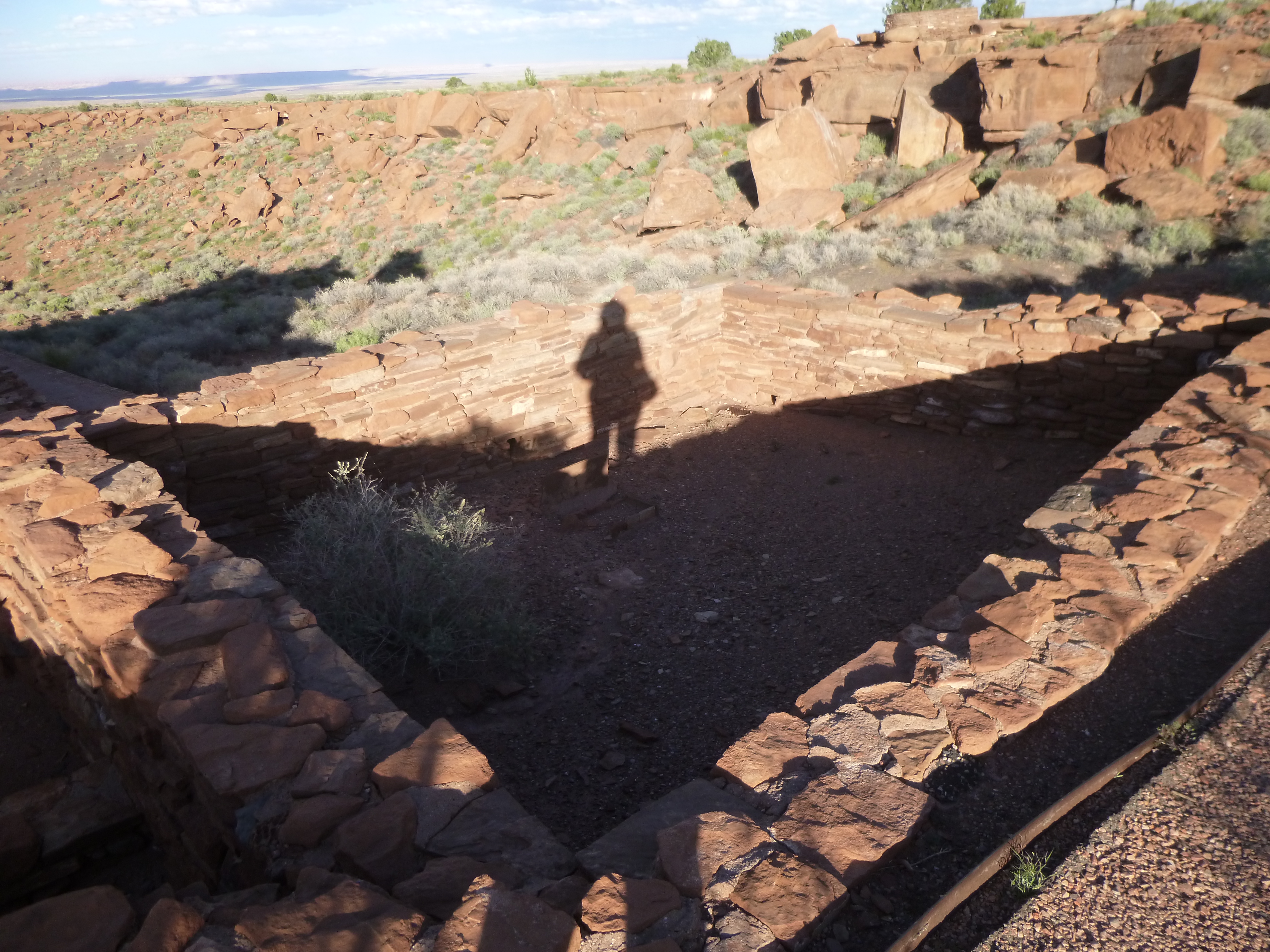 About 18 miles farther on was another national monument – the Wupatki National Monument, and this park had several old ruins from about 1000 years ago when the ancient pueblo people lived there. I walked out to the ruins in back of the visitor center, and this one had been a very large 100-room community oriented pueblo. It’s incredible to see all the old bricks, and how much of the structure is still standing. There was even an old ballcourt, which currently was flooded with water. And the most intriguing part of the site was a blowhole – a small hole in the ground that air continuously blows through. Scientists don’t really know the extent of the cavern underground that the air comes gushing out of, but the strength of the wind depends on temperatures. They’ve put a screen over the hole so people don’t step on it, but I leaned over the blowhole and was astonished how hard the wind was coming out. The Indians who lived in the area believed the Wind Spirit lived there in the ground. When I leaned over the hole, the wind was blowing hard enough to blow my hair straight out from my head, and when I took a picture of my shadow with my hair blowing out, I felt a bit like a spirit myself!
