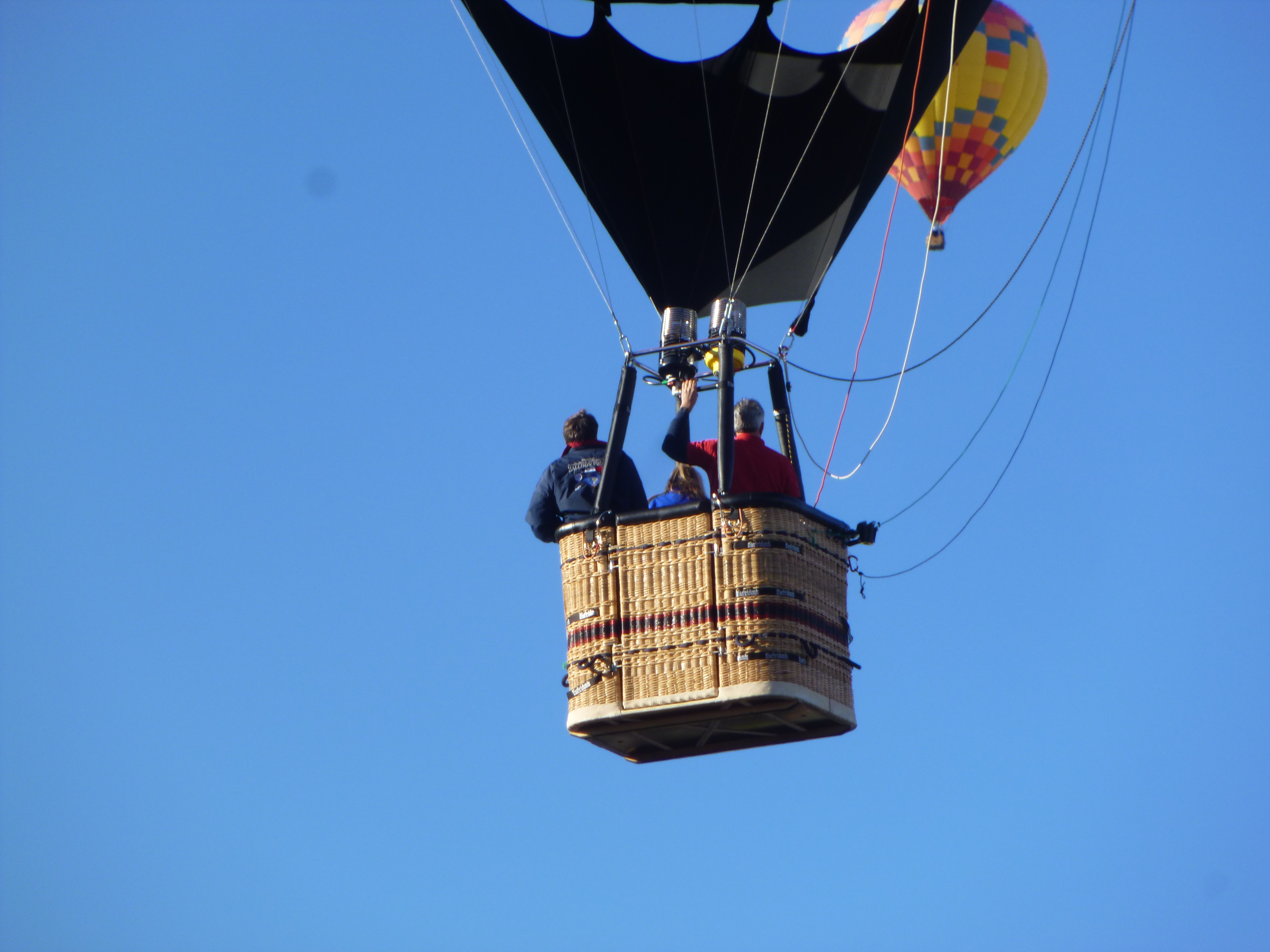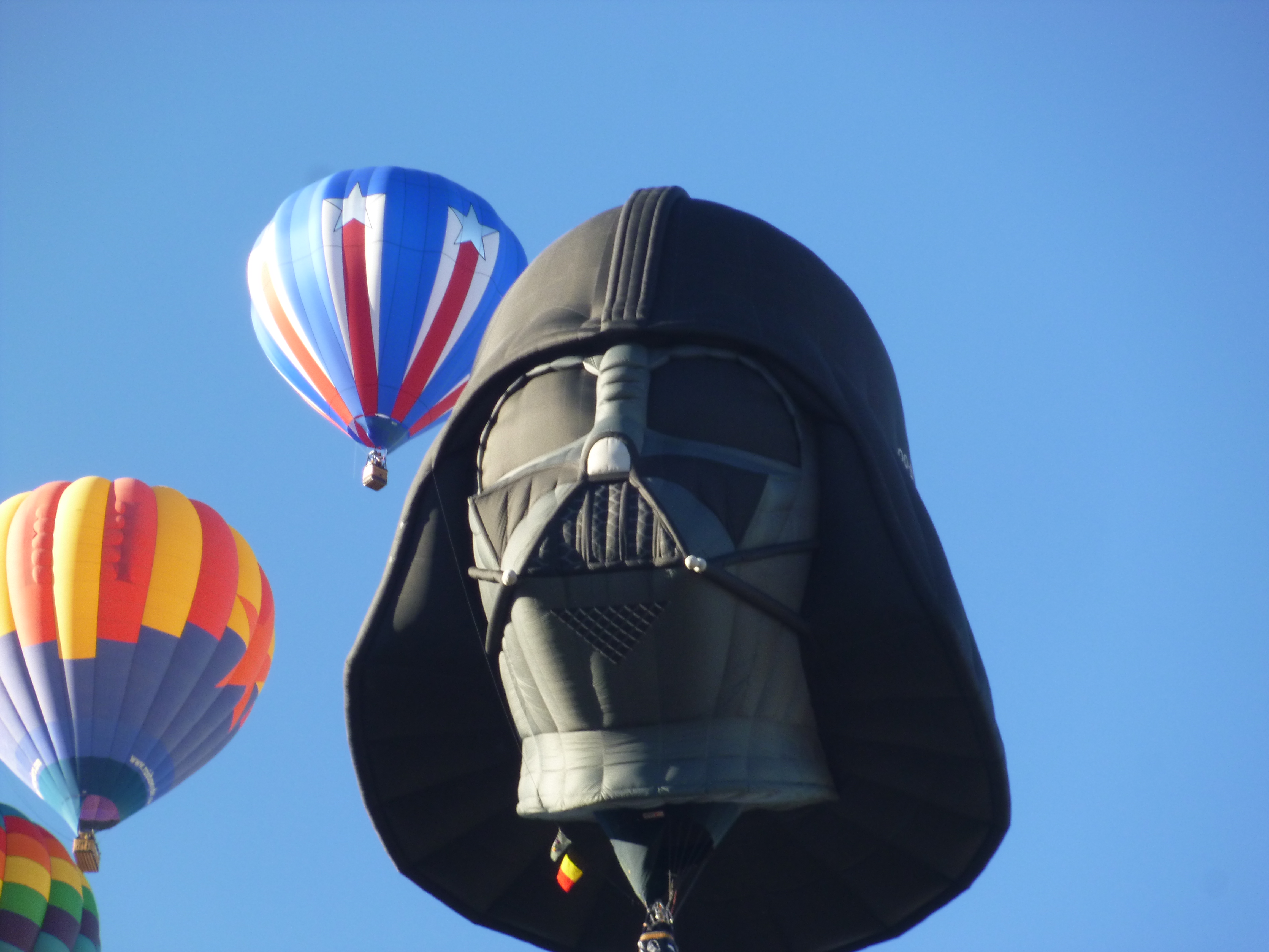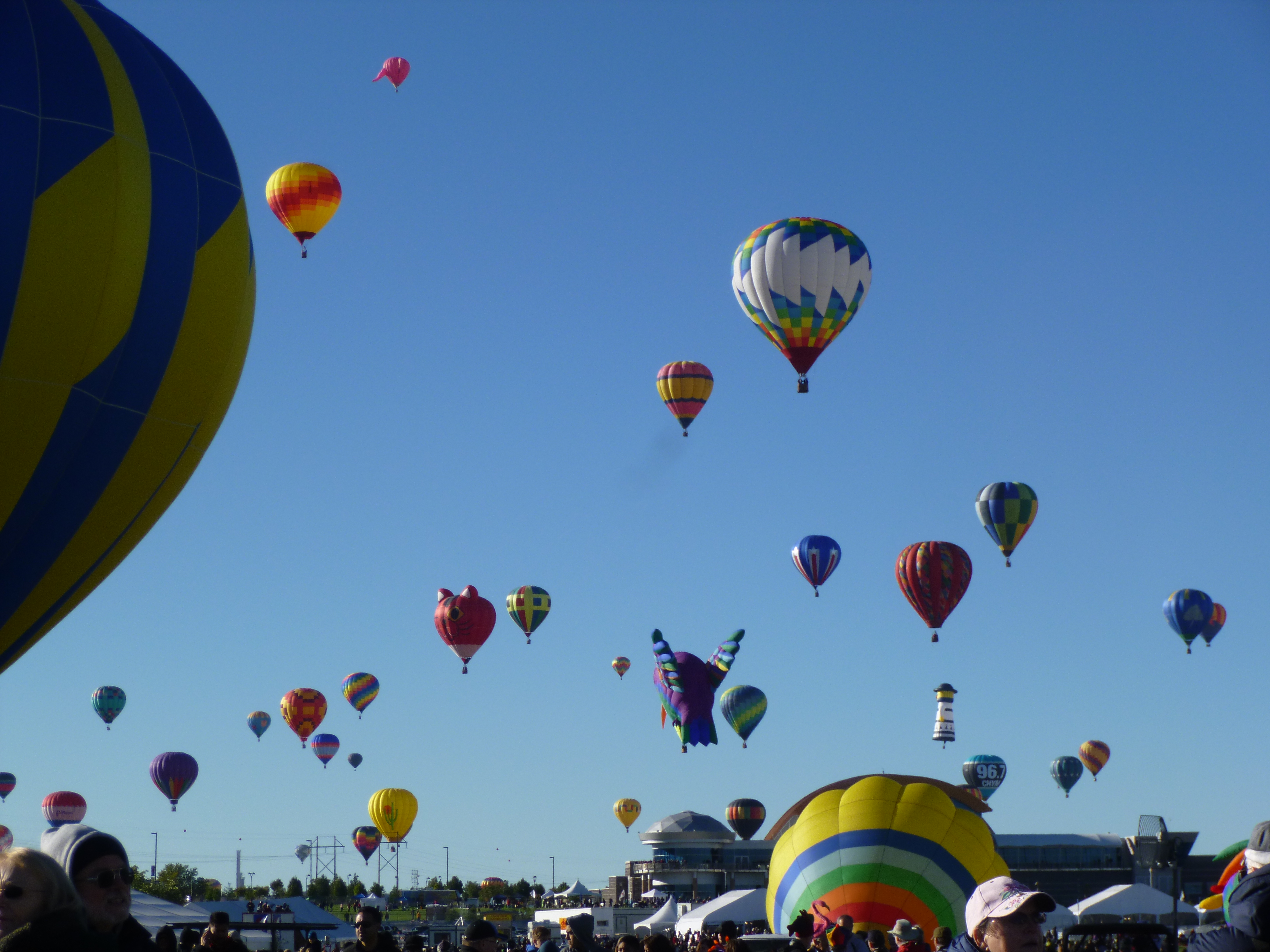 Some of the balloons were totally deflated and spread out on their sides with the gondola basket also on its side. Other balloons were in the process of being inflated and that takes several people to hold open the mouth of the balloon. When the balloons are being inflated, most groups use something like a large fan to blow in hot air, and once the balloon is mostly inflated and getting ready for take-off, they use the propane tanks in the gondola. The balloons were all tethered to the ground with ropes. And when the ropes were released, they soared off pretty quickly right overhead. The balloon field was so huge, the crowds didn’t seem bad once we were inside. It was such a colorful spectacle – and fun to watch them all get inflated and then go gliding off – all in the same direction. There were specialty shaped balloons (bees, hummingbird, clock, lighthouse, stork, stagecoach, Darth Vader etc) and from comments I heard around me, people recognized old favorites, and commented on the new balloons.