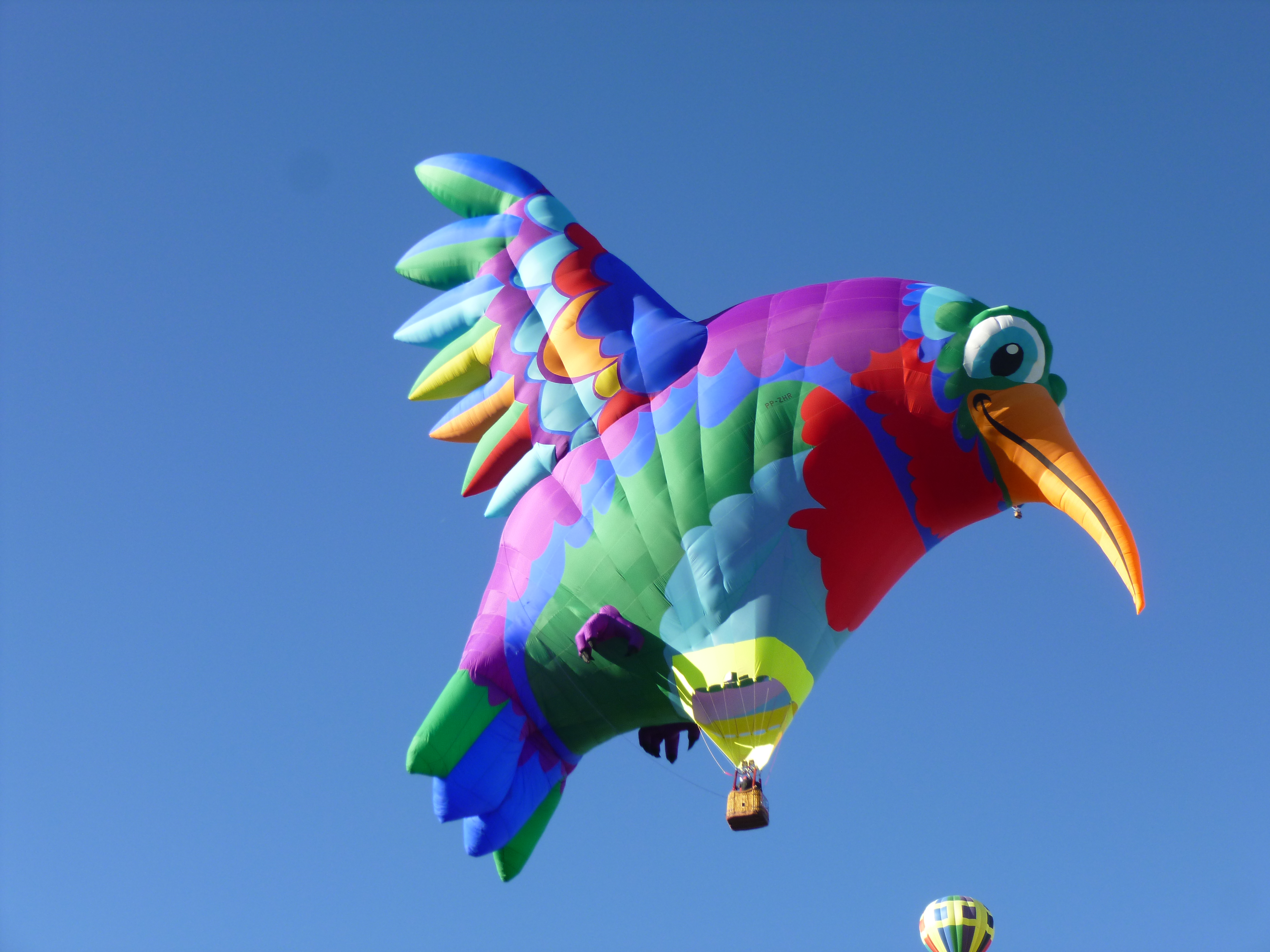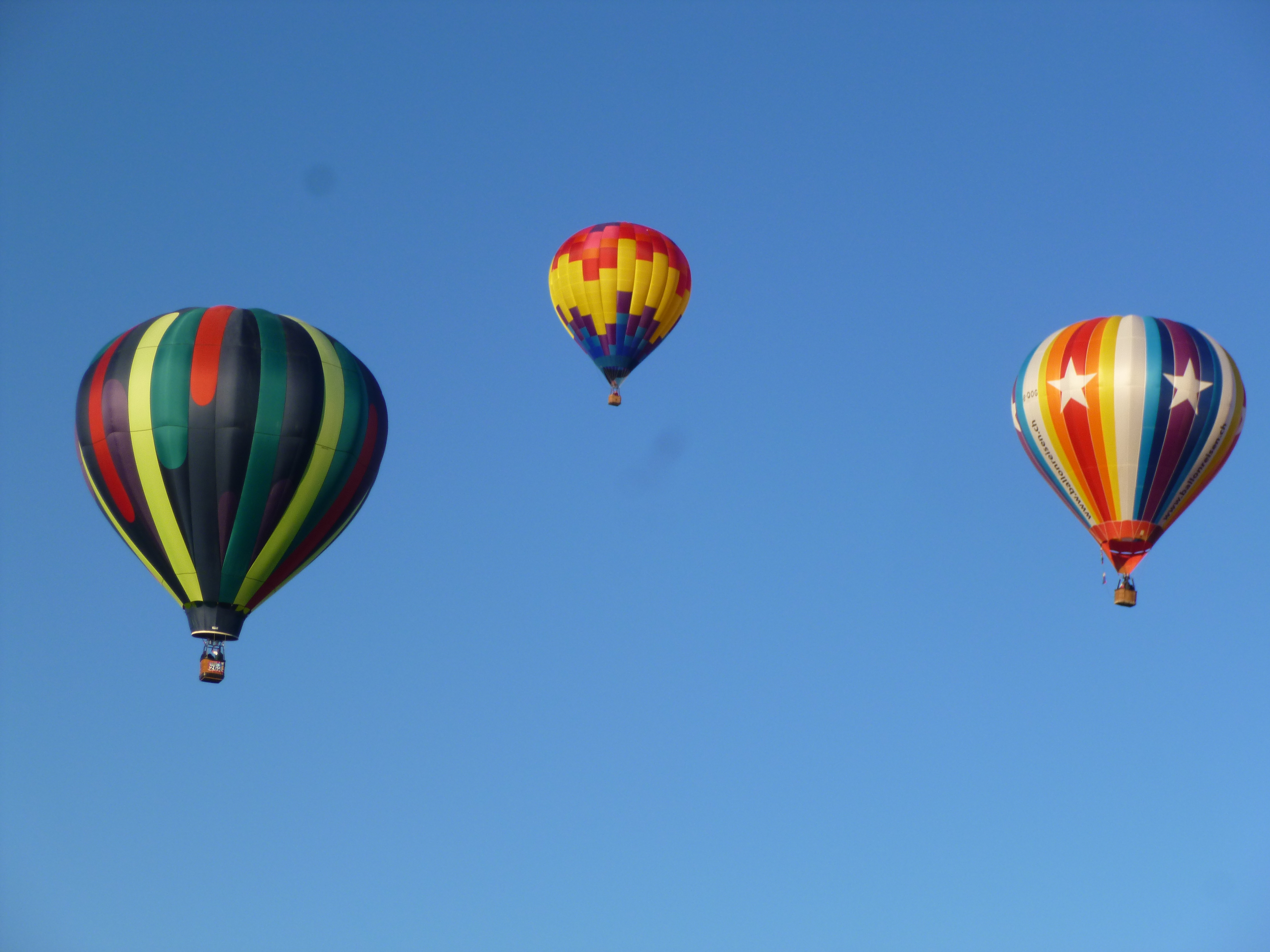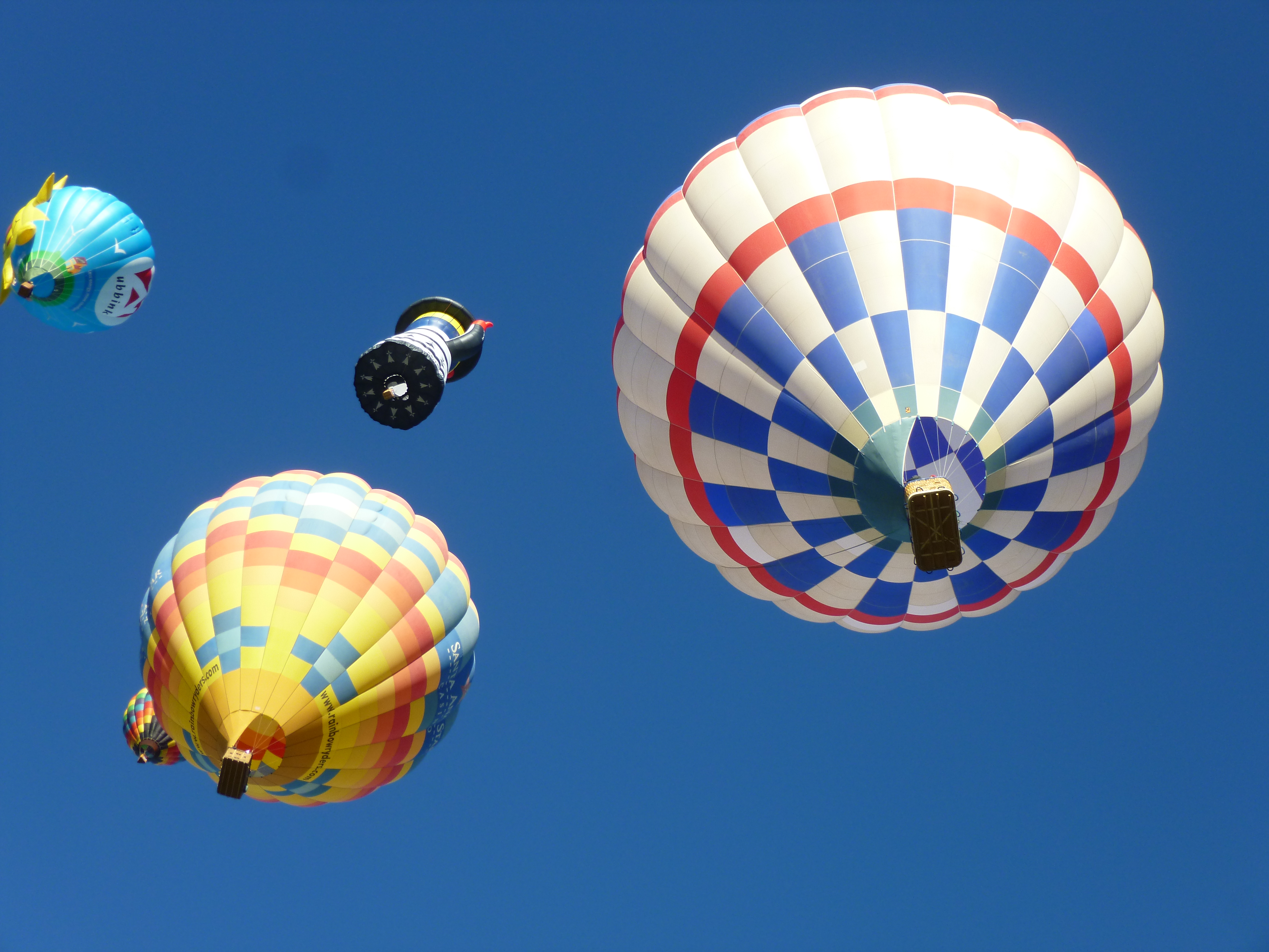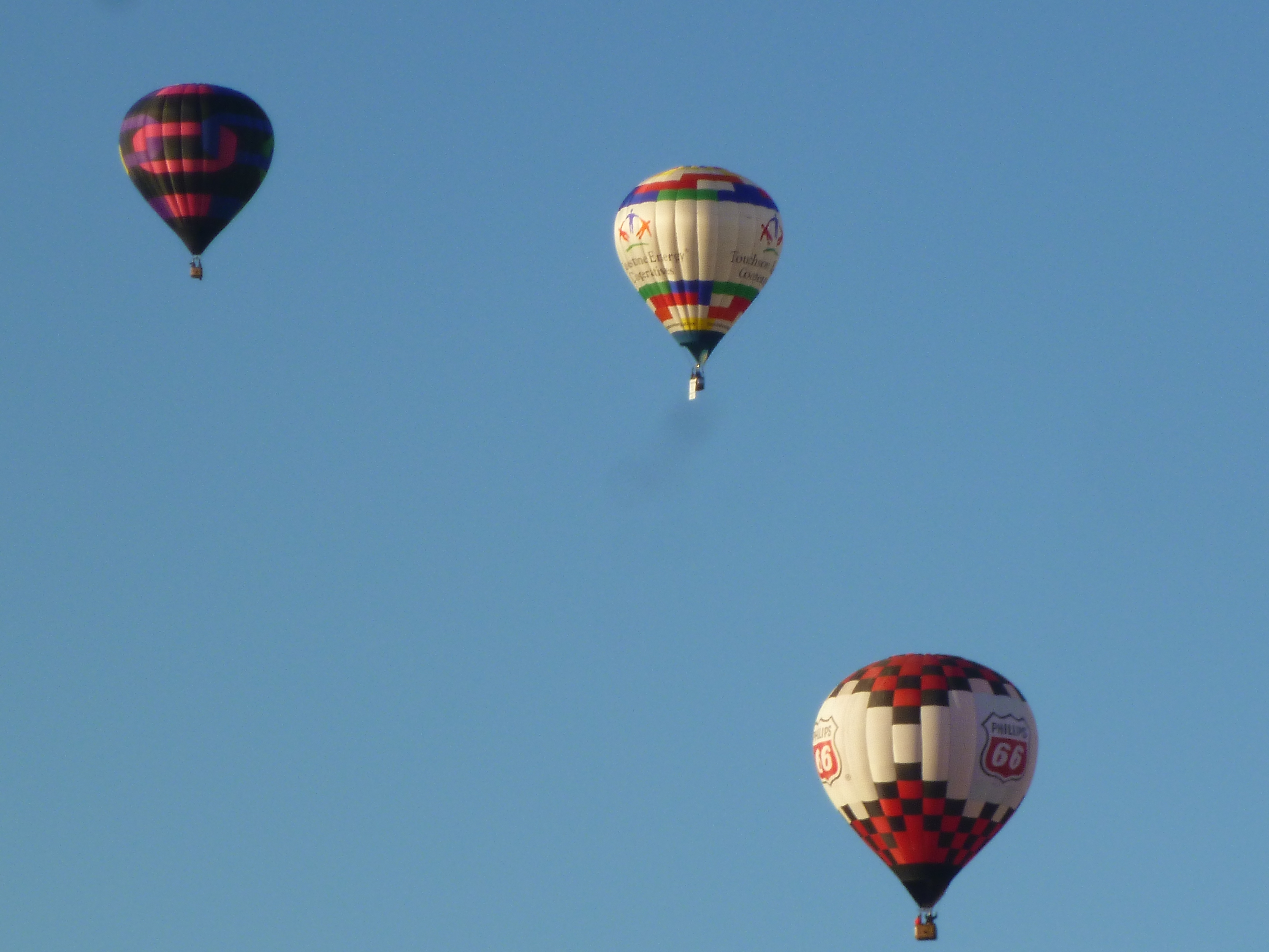 Some of the balloons were totally deflated and spread out on their sides with the gondola basket also on its side. Other balloons were in the process of being inflated and that takes several people to hold open the mouth of the balloon. When the balloons are being inflated, most groups use something like a large fan to blow in hot air, and once the balloon is mostly inflated and getting ready for take-off, they use the propane tanks in the gondola. The balloons were all tethered to the ground with ropes. And when the ropes were released, they soared off pretty quickly right overhead. The balloon field was so huge, the crowds didn’t seem bad once we were inside. It was such a colorful spectacle – and fun to watch them all get inflated and then go gliding off – all in the same direction. There were specialty shaped balloons (bees, hummingbird, clock, lighthouse, stork, stagecoach, Darth Vader etc) and from comments I heard around me, people recognized old favorites, and commented on the new balloons.