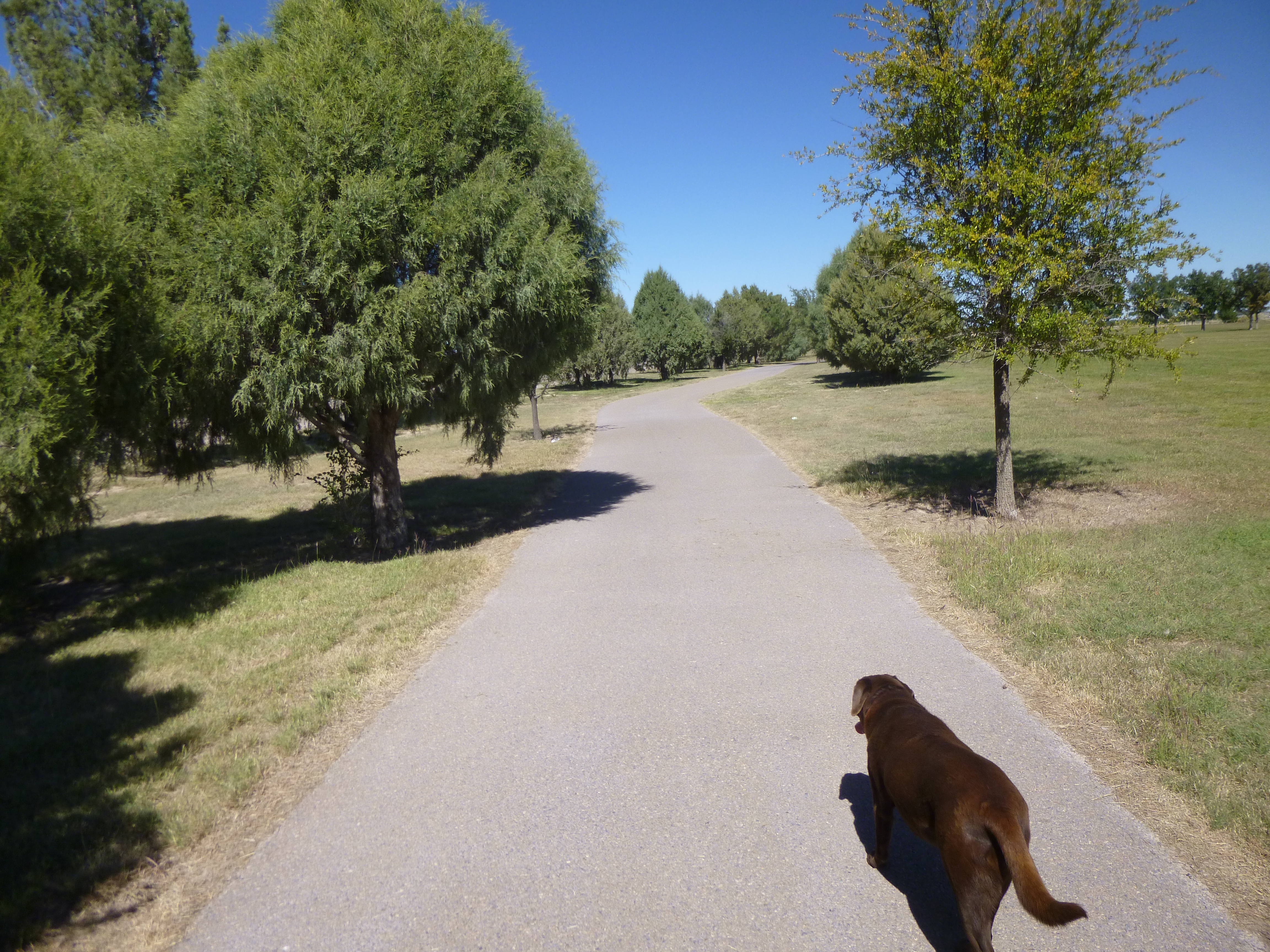 I finally left Roswell, and took a good look at the map to figure out where I wanted to enter Texas. I decided I would head for Pecos because it’s such a Texan name, so I drove south to get out of New Mexico. On the way I stopped in the town of Artesia, where I found a big park and Tula and I walked the last of the New Mexico miles. This was oil country, and the smell of oil was heavy in the air. I expect people just get used to it. There was some kind of refinery or power plant at one end of the park, and it’s amazing how many lights come on when it gets dark.