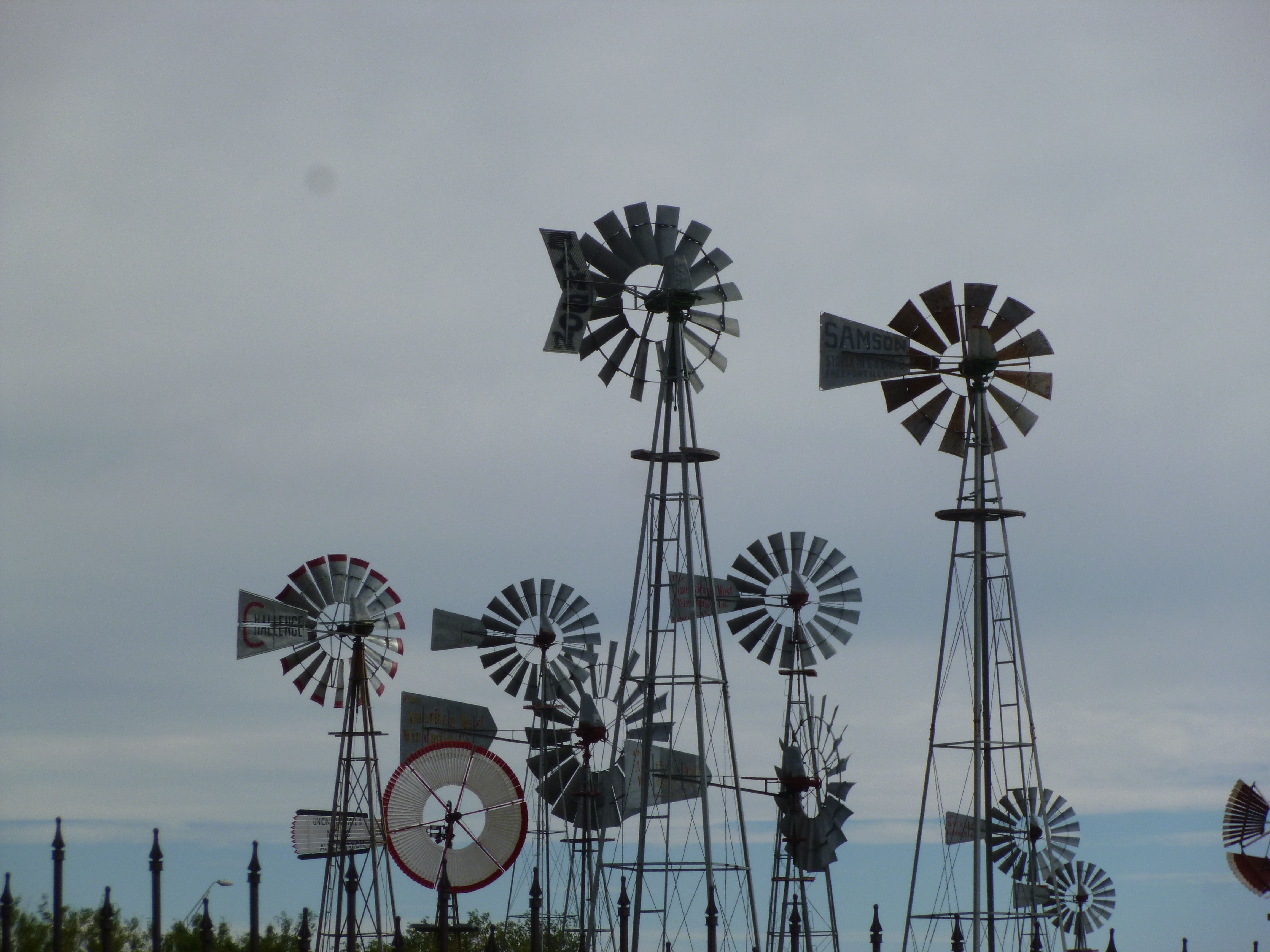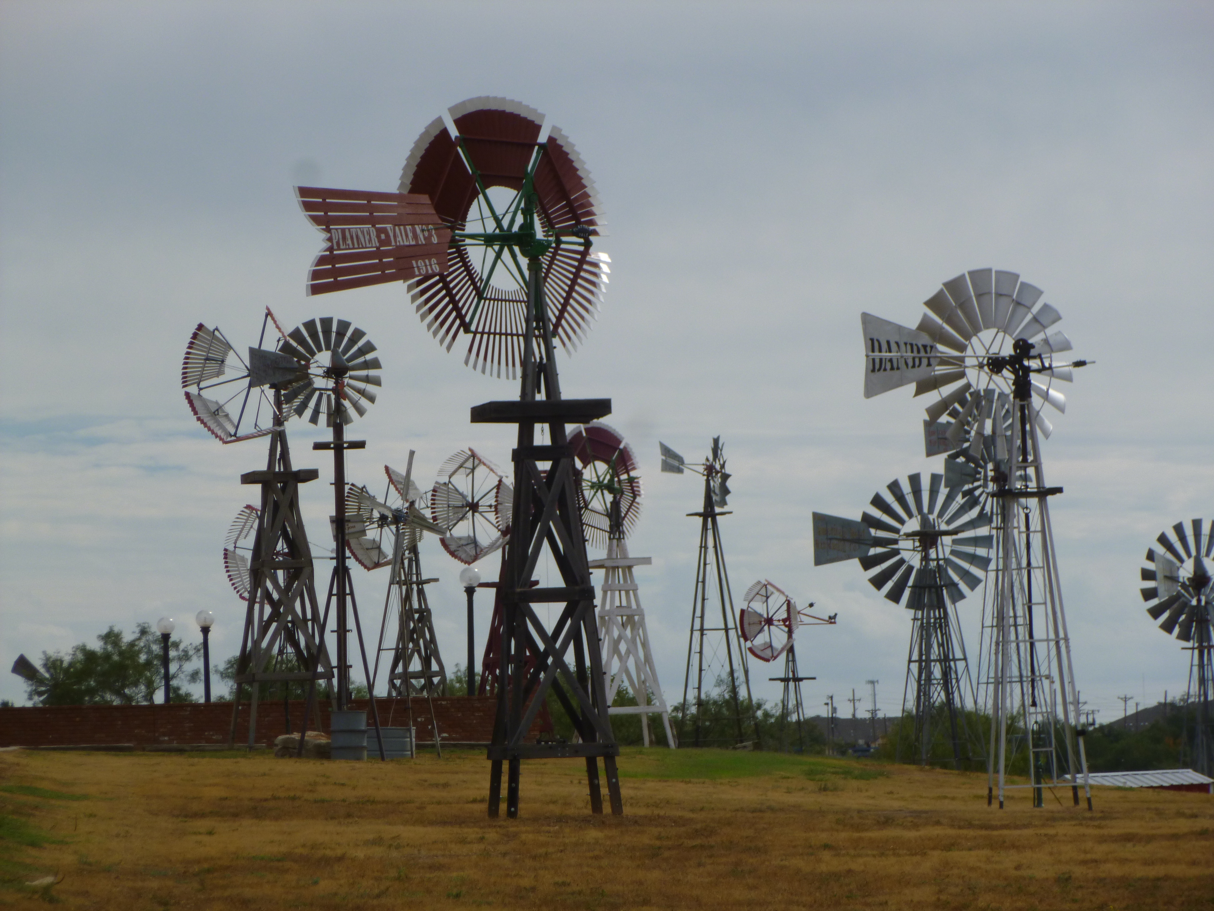 Then it was time to do some walking. Tula and I started off with a little over a mile and a half downtown, then I found the Texas Tech campus area. We walked another mile and a half by the “Cottages of Lubbock” which were blocks of cute little homes – maybe both for families and college students. Then Tula stayed in the van while I walked another 2 1/2 miles around the Texas Tech campus and some of the surrounding area. Before leaving town I wanted to visit the Wind Power Center because I like windmills, but when I got there I discovered they’re closed on Mondays. So I couldn’t go inside the museum, but I still saw dozens of different kinds of windmills on the grounds. The variety of windmills is amazing. From there I saw the Canyon Lake Bike Path which went around a lake, so Tula and I walked another 3 miles. Then I really needed to head north!