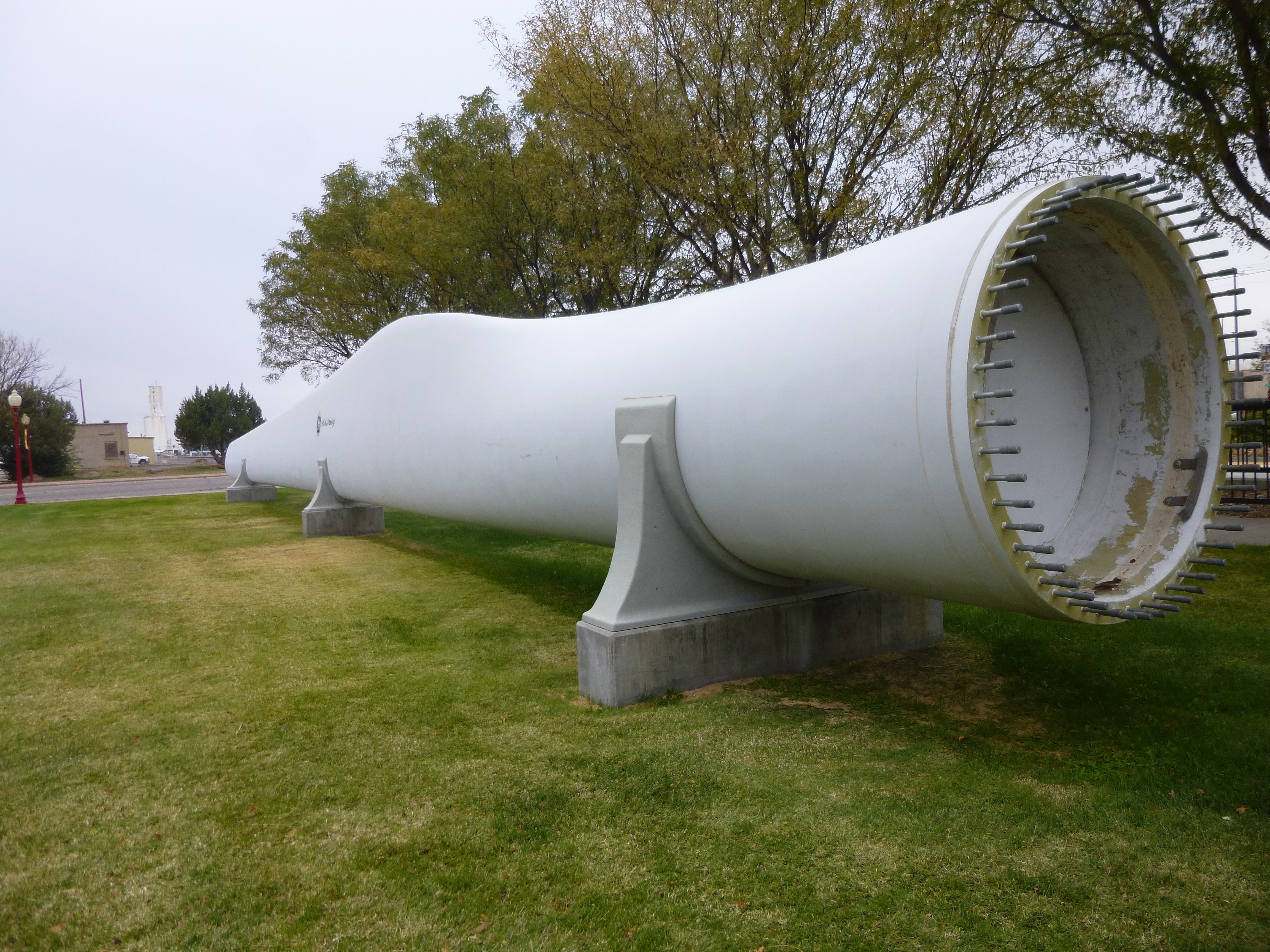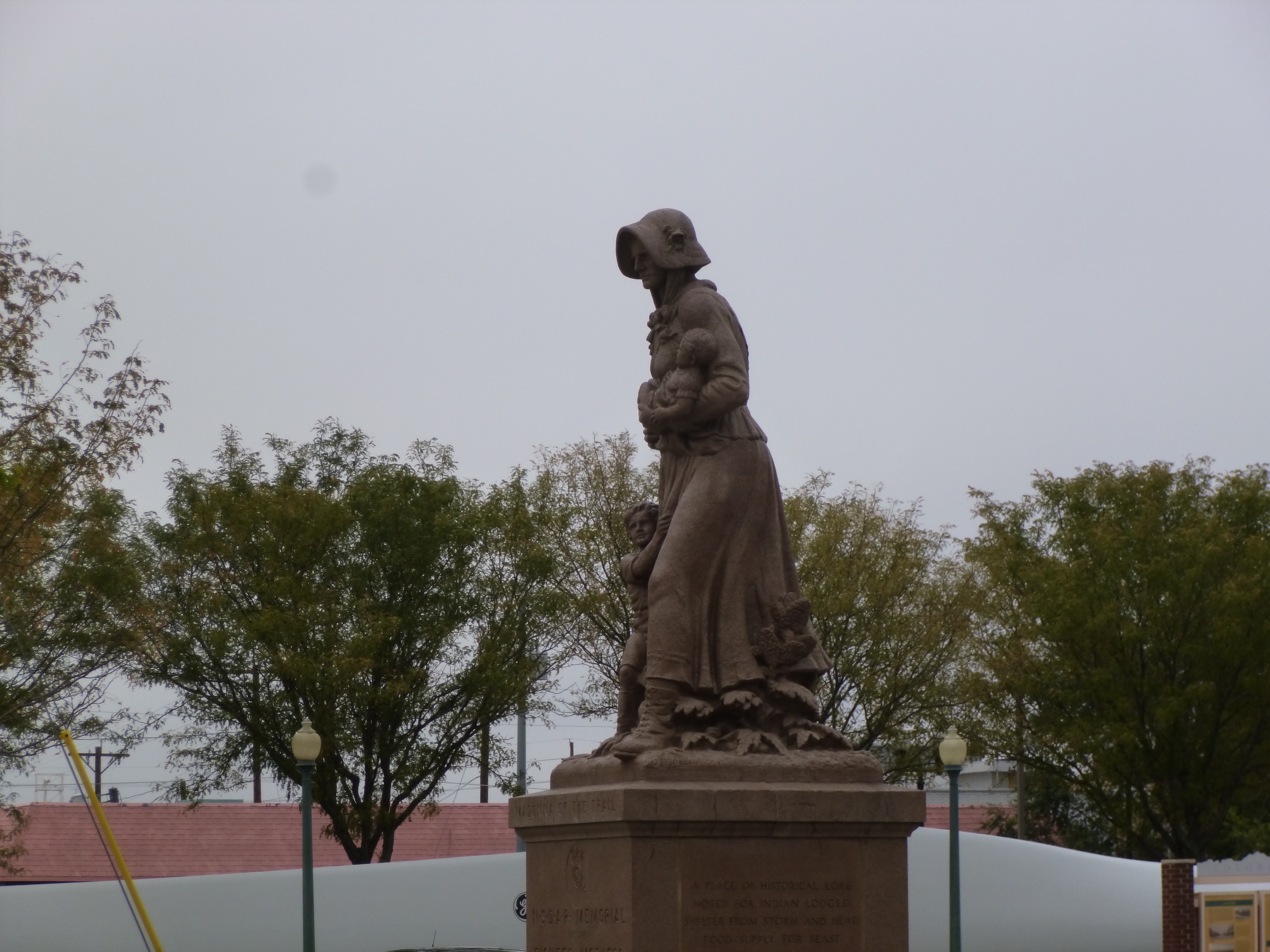 From there Tula and I walked around town for another half mile, then I went in to the visitor center to find out a little more about town. Apparently the town came into existence when someone surreptitiously moved the railroad depot from the town 3 miles away to this new location, so the railroad was built through Lamar instead of the other town, and back then, the railroad had the power to make or break a town. They also had a wind turbine blade on the ground – I can see why a truck can only haul one at a time! I also learned about something I’d never heard of until now. There was a statue in town called “Madonna of the Trail”, and it’s one of 12 Madonna monuments in the country (in 12 different states) that mark the National Old Trails Road.They were dedicated to the spirit of the pioneer women and were commissioned by the Daughters of the American Revolution. This particular statue represents the women on the old Santa Fe Trail. The other 11 Madonnas of the Trail are in the states running east to west from Maryland to California. I’ve already been in all 11 of the other states (most recently Albuquerque, New Mexico). All 12 statues are the same – the pioneer woman faces west with a rifle on one arm, an infant in the other, and a toddler grabbing at her skirt. This is just one more piece of history on the old National Road that I first learned about in Maryland – a road approved by Thomas Jefferson even before there were cars. So many old roads…this journey’s gonna need a sequel!