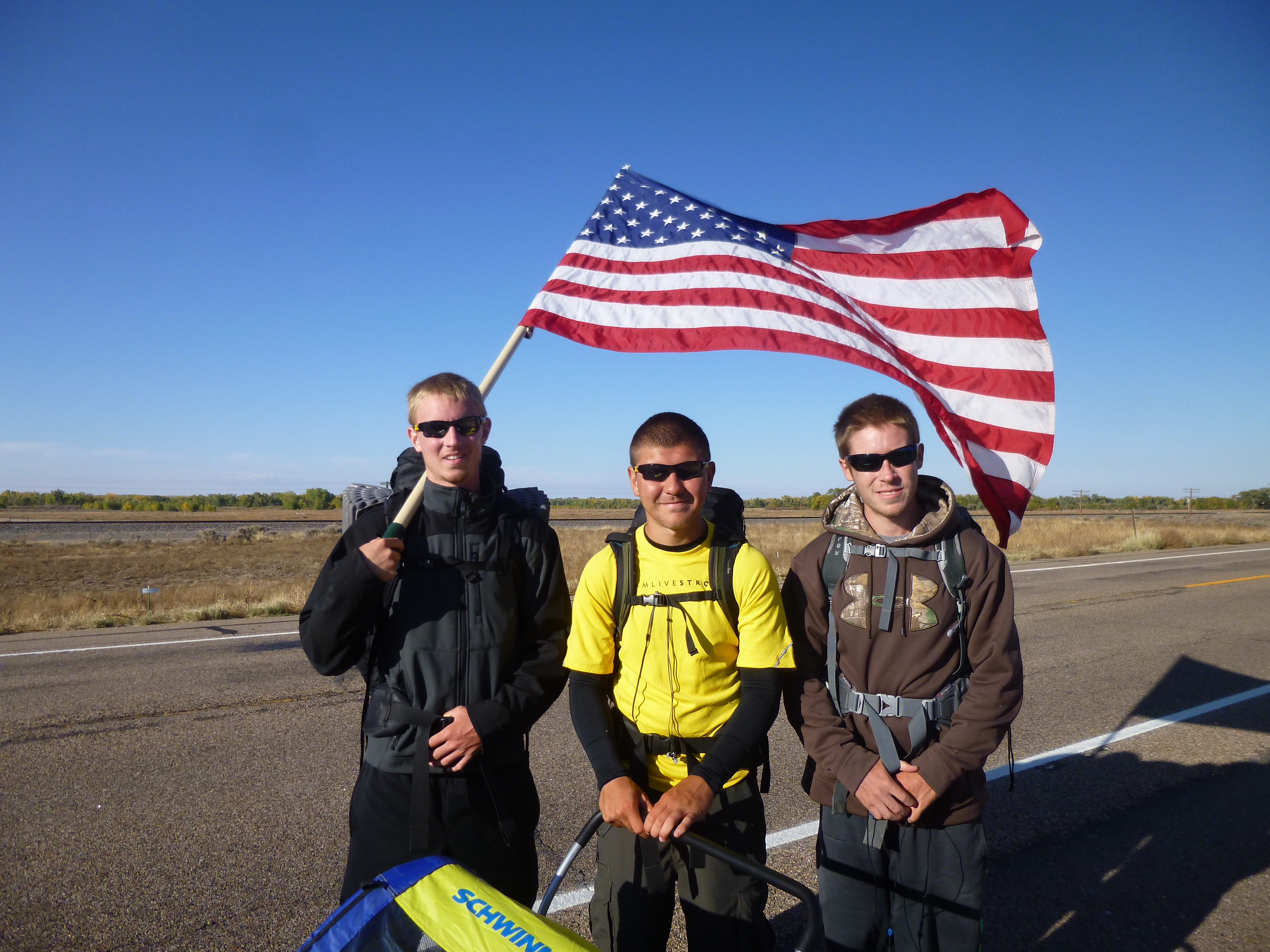 After soaking up some of that history, Tula and I headed for a big park on the south end of town, and walked a mile and a half before leaving town. The stone fences and other stone structures have been here since the 1930s – there was also an outdoor fireplace that the Boy Scouts built with the motto “Always Be Prepared” on a plaque. I started heading west along the old Santa Fe trail, and the next town I came to was Las Animas, and we walked nearly 3 1/2 miles in that town. Then we continued west toward La Junta. The road was following the railroad tracks, and there were still telephone poles (or maybe old telegraph poles?) using the old glass insulators. I’ve always like those, and to see so many still in use was pretty interesting. As I was getting close to La Junta, I passed 3 guys walking along the road with backpacks, and one of them was carrying a very large American flag. That caught my attention – with the backpacks and a stroller-sized cart with more gear, they looked like they were on a journey of their own. I decided to turn around and see if there were any logos or any signs of what they might be doing. But I didn’t see anything. I had to pass them again as I headed into La Junta, and my curiosity got the best of me. So I turned around again, and pulled off the side of the road, and started walking toward them (and I’m not the first person who had done that!) It turns out they were 3 19-year-olds – Mike, George and Drew – who were walking across the country to raise awareness,support and money for Livestrong, an organization that helps fight cancer. They had started their journey in Connecticut on April 21 and had been on the road for 6 months. They said they averaged 17-20 miles a day, and from Colorado they would walk across Arizona and finish up in Huntington Beach, California. Two of them had enlisted with the marines and would be shipping out when their journey was over. Of course I had to support their Walk Across America! I was going to give them a check for Livestrong, but they said making a donation online would be better so they didn’t have to forward a check. They had a card with all the necessary information on it. So I promised to do that, and drove into La Junta. But when I got there, I realized I also wanted to support them – in the form of a cash donation for food or a motel stay in bad weather, or whatever would personally help the 3 of them. So I retraced my steps (worried I might not find them again!), and found them, and they were very appreciative of the money. They were very polite and personable young men – it’s quite an undertaking, and they could be a good example for their peers. So it turned out to be a double donation day – one to their cause (Livestrong) and one to support their day-to-day needs. They did say people had been good about helping them out with food and occasional places to stay. I’m guessing the big flag draws a lot of attention! I found it kind of ironic that my Expedition 56 and their Walk Across America crossed paths near La Junta, which is Spanish for “the junction” – it was like the junction of 2 American journeys!