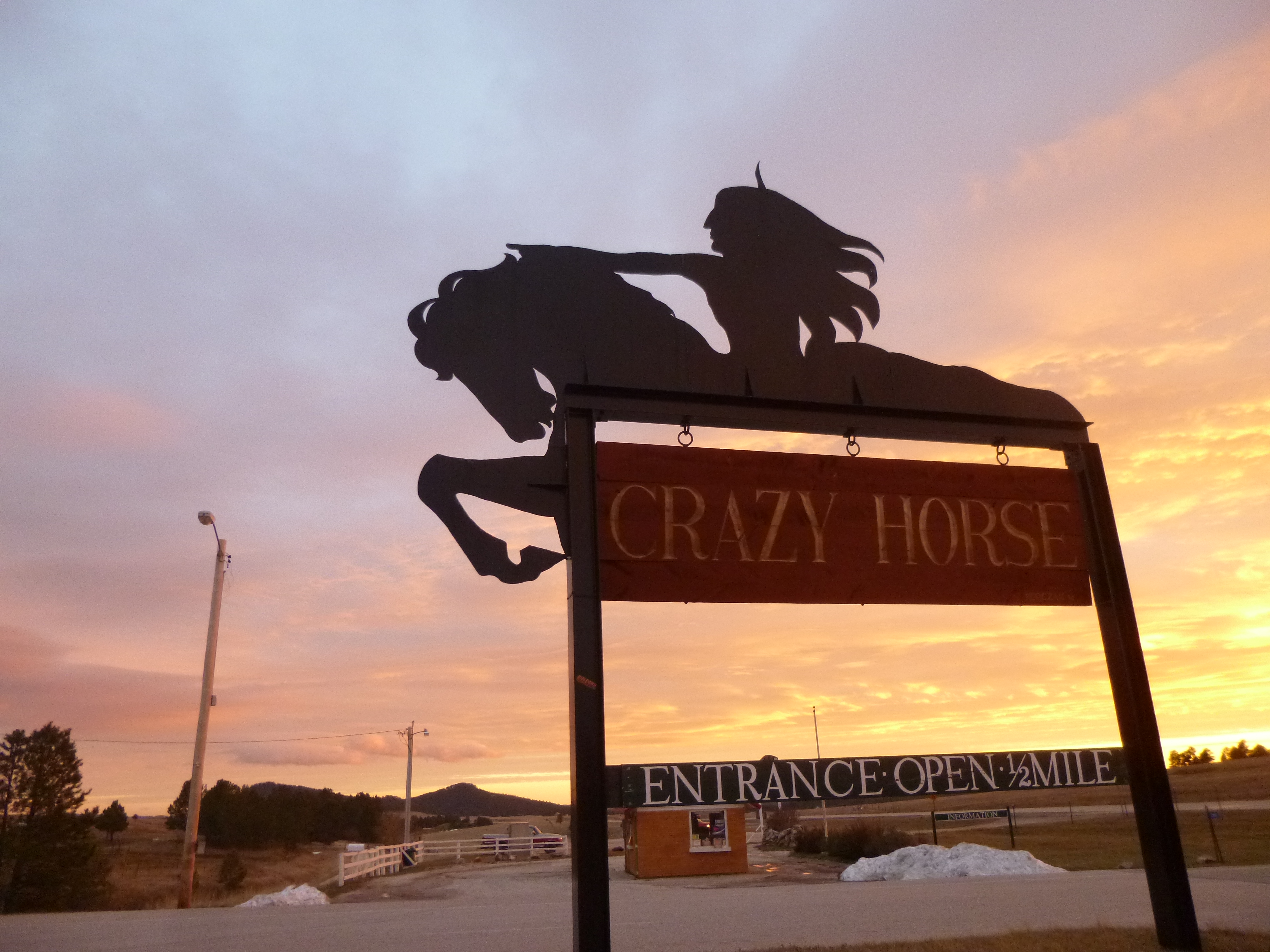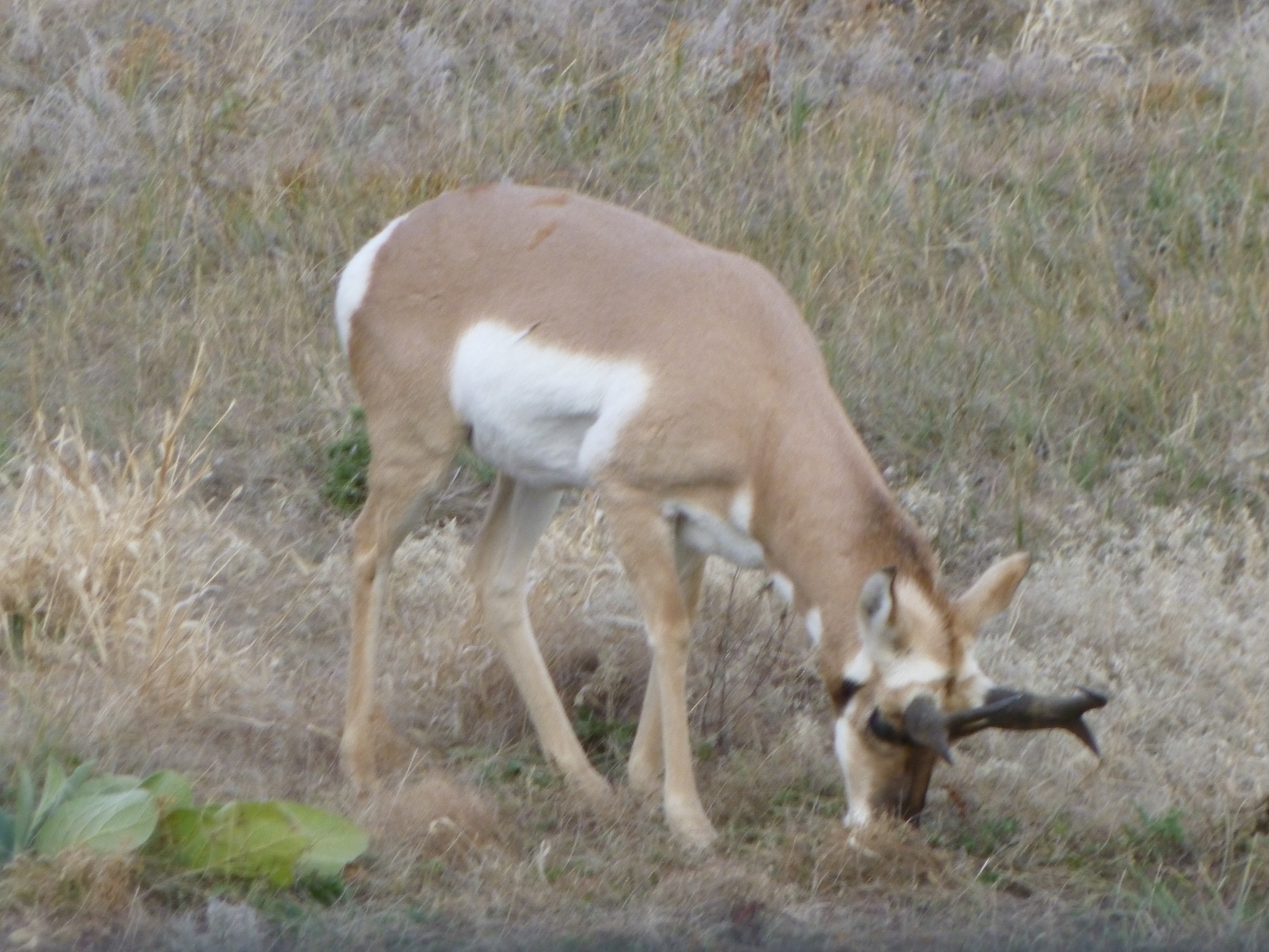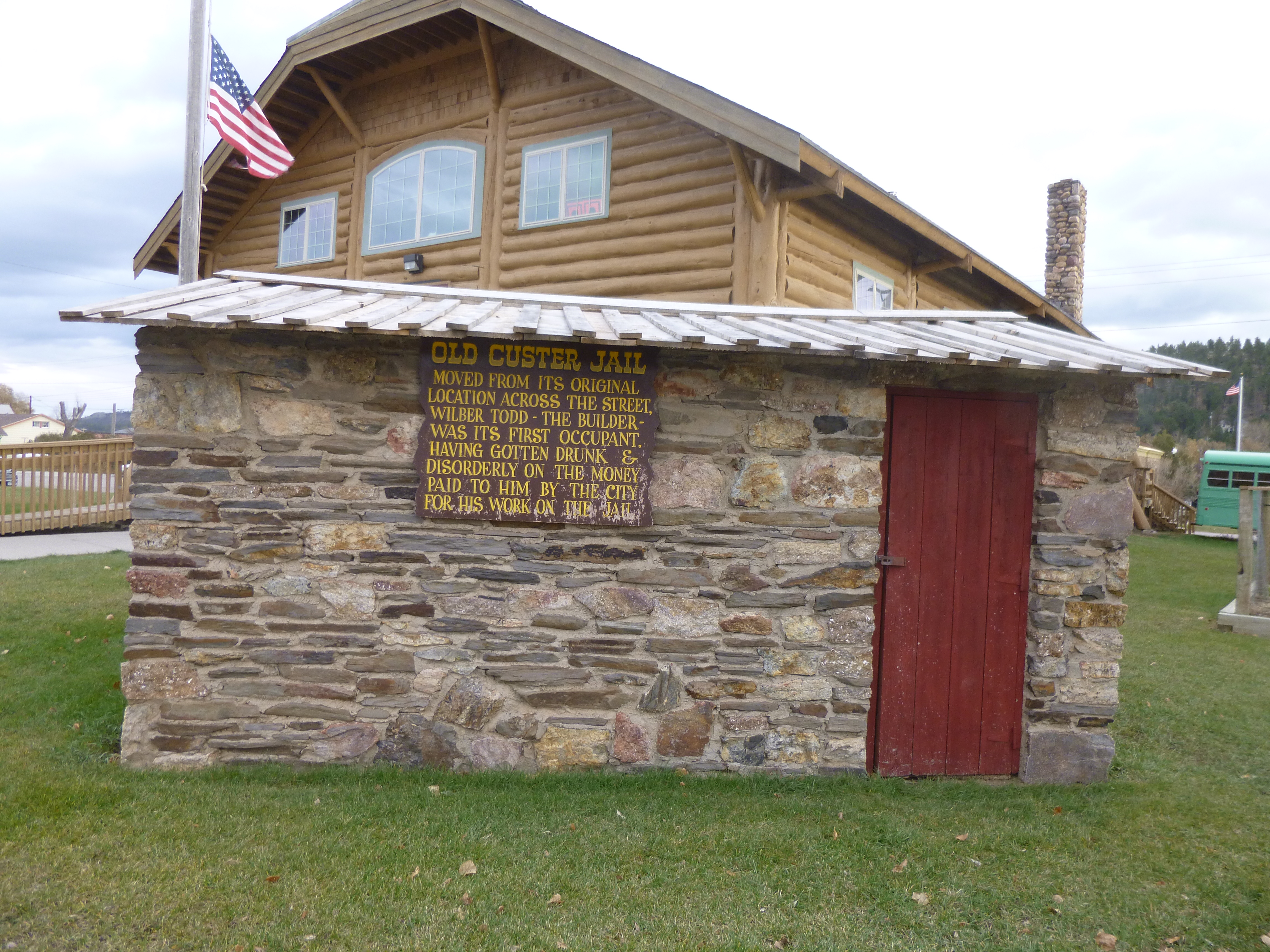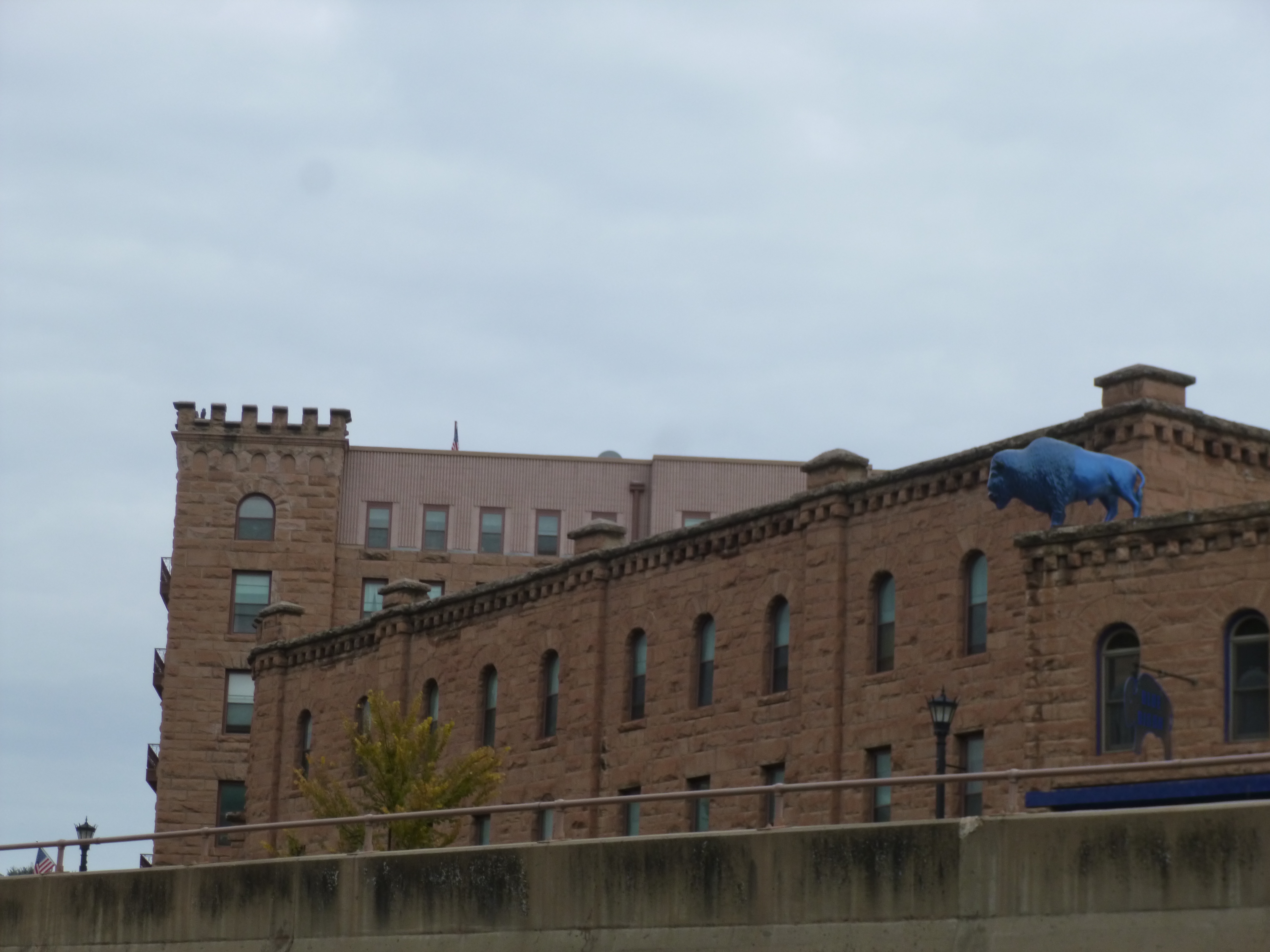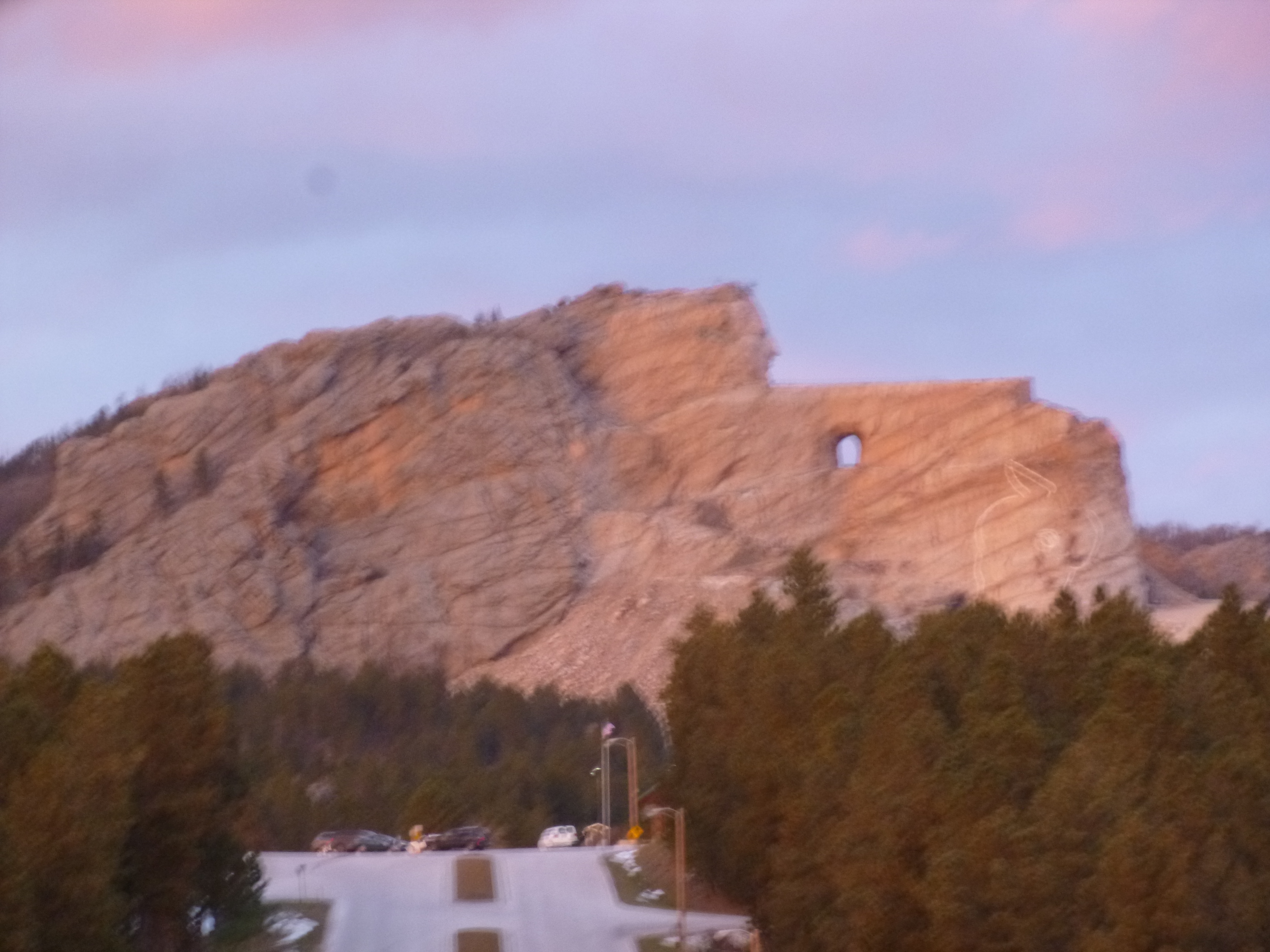 From there I drove through part of Custer State Park and saw some antelope. When I got to town, Tula and I got out for a short walk through the middle of town. Custer was another old mining town and is now kind of a tourist town, and since the summer season is over, things were pretty quiet. I passed the original old jail (although it had been moved) and there was a sign on it saying the builder of the jail was its first occupant – he became drunk and disorderly on the money he got to build the jail! On the way to Hill City I drove past the Crazy Horse memorial, and my photo is a little blurry but I added it anyway. In Hill City Tula and I walked another mile and a half in the fading daylight. It was another old mining town, and the old shops were all connected with wooden sidewalks. Altogether I walked 10 1/2 miles today, which helped make up a bit for my shortfall yesterday. I drove into Rapid City and called it a day.