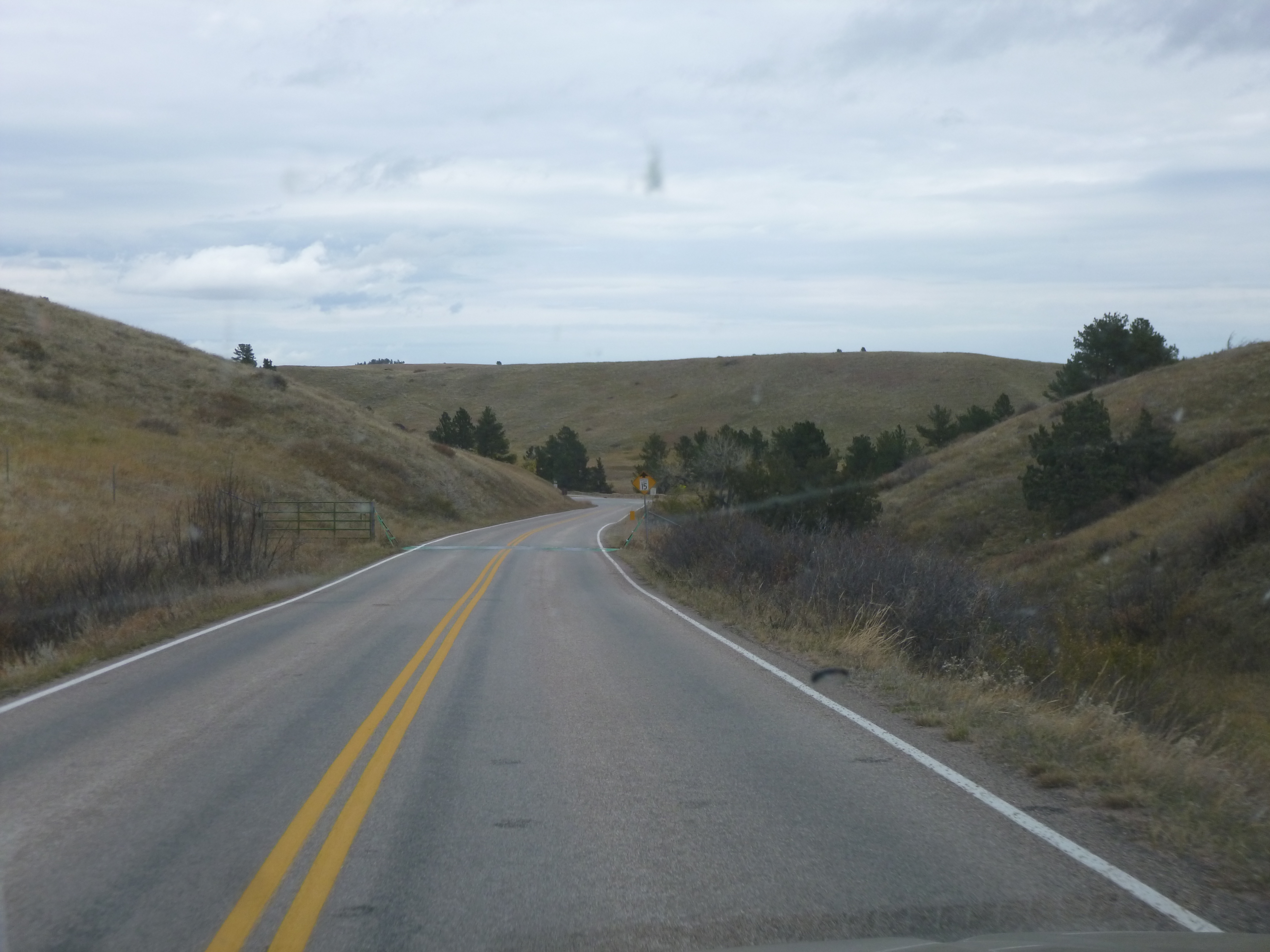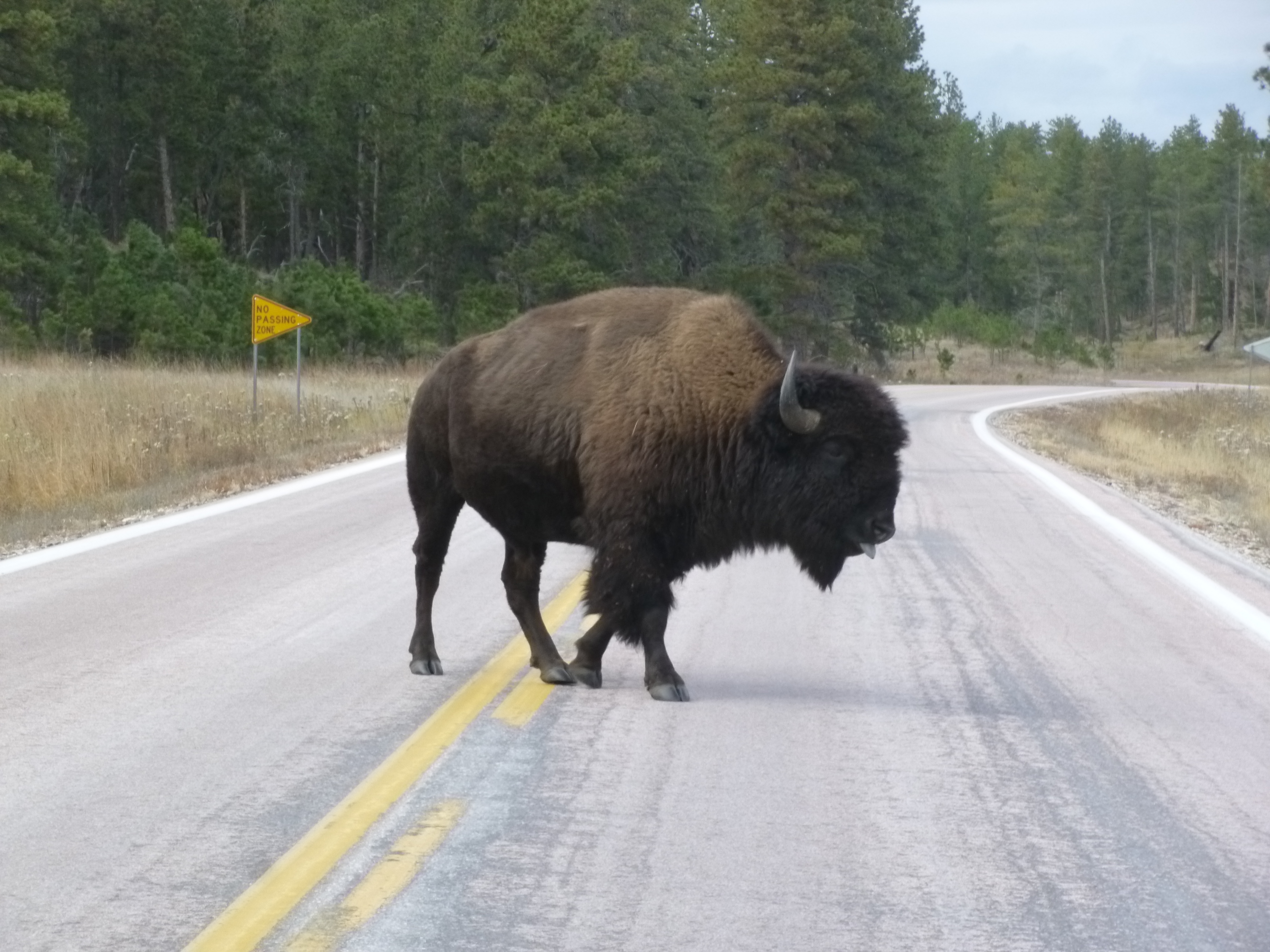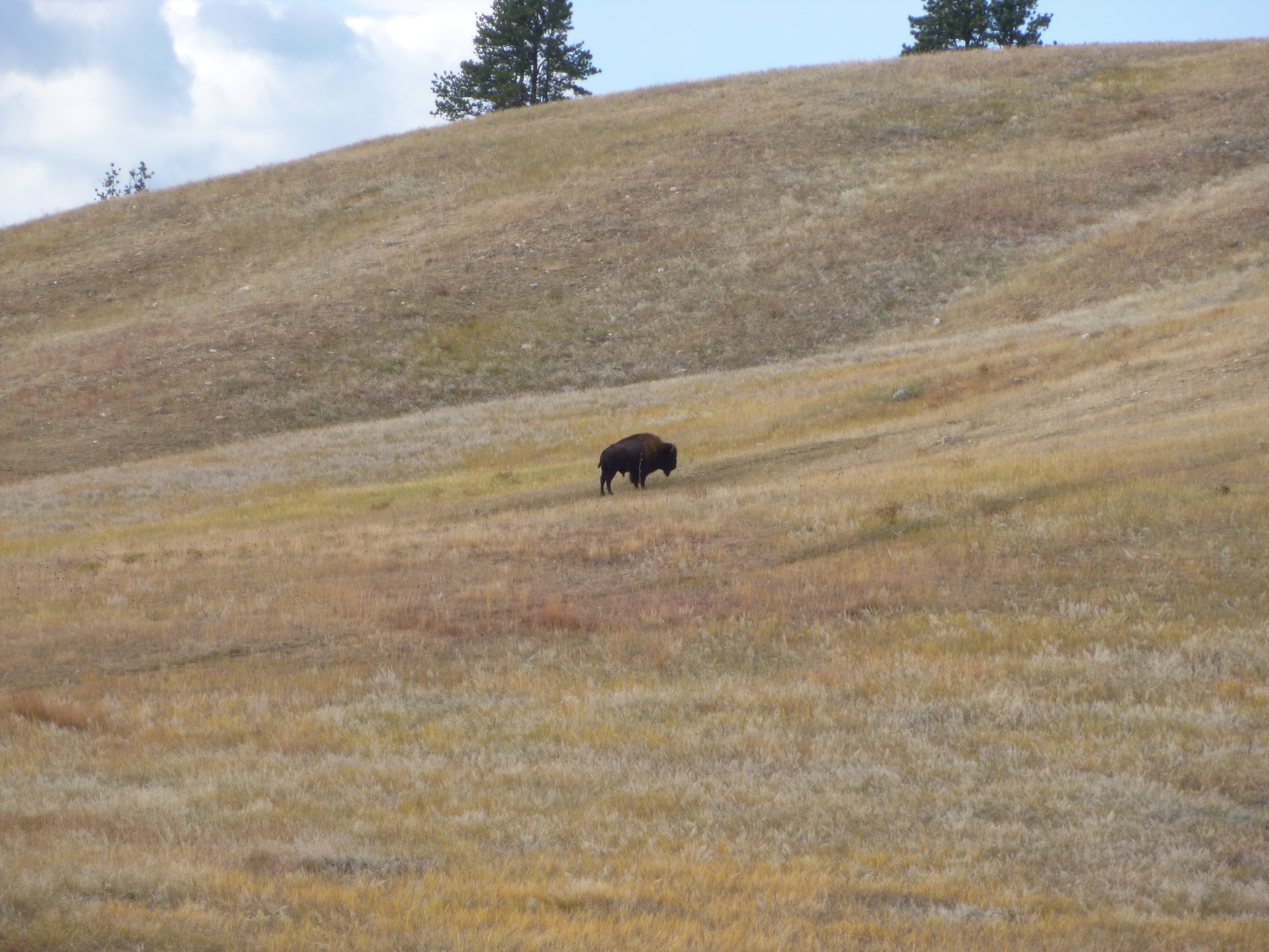 After I left the sanctuary, I started to head north toward Custer. The road I was on went right through Wind Cave National Park and I decided to stop and do some walking on the Wind Cave Canyon Trail. It had been a while since I’d been able to stop at a national park! I covered over 3 1/2 miles on the trail – and I’m sure parts of the Wind Cave were under my feet. I saw a lone buffalo right at the end of my walk on the next hill over – I always like seeing them. I saw more buffalo as I continued through the national park, including one who decided to cross the road right in front of me.