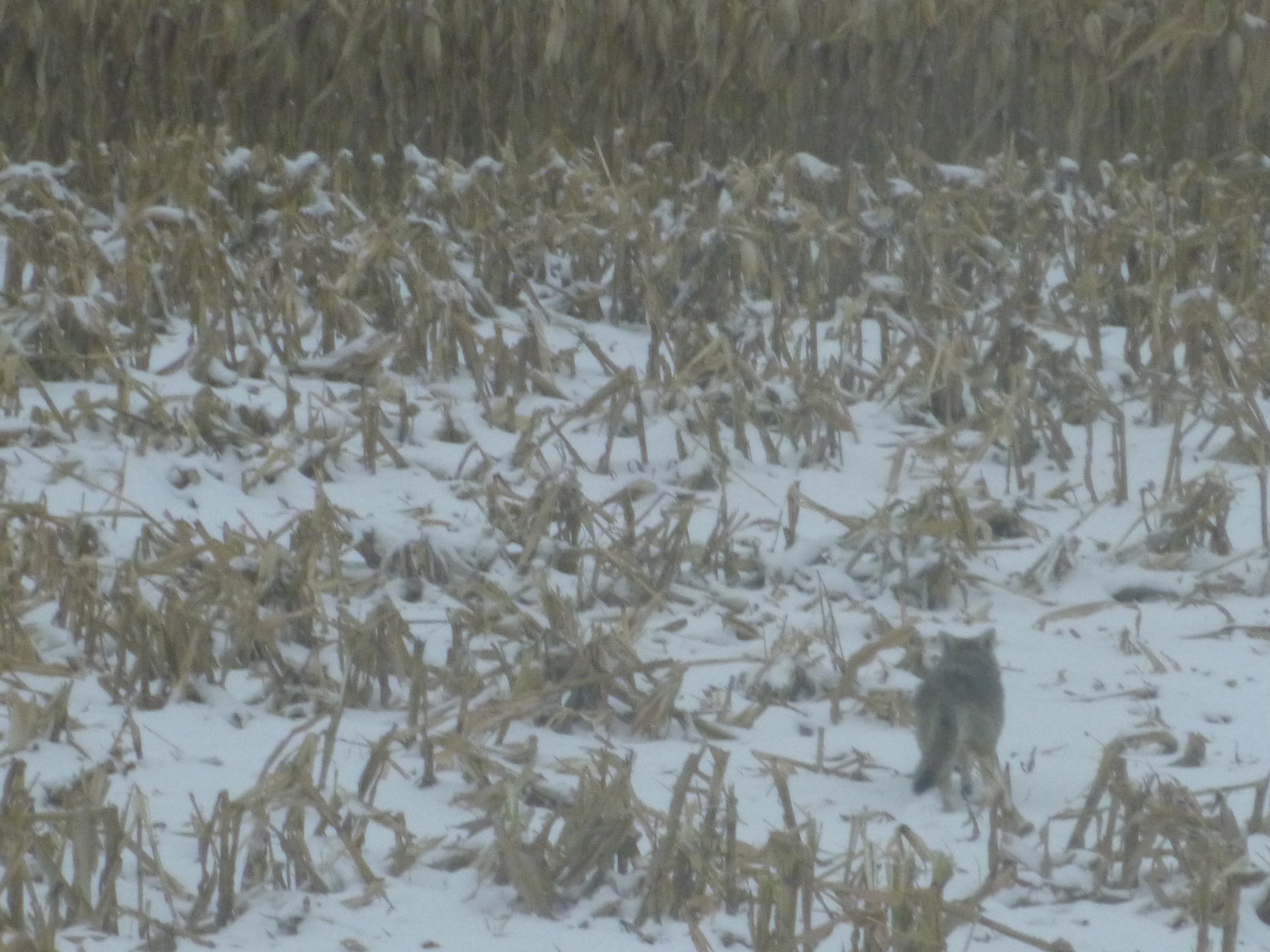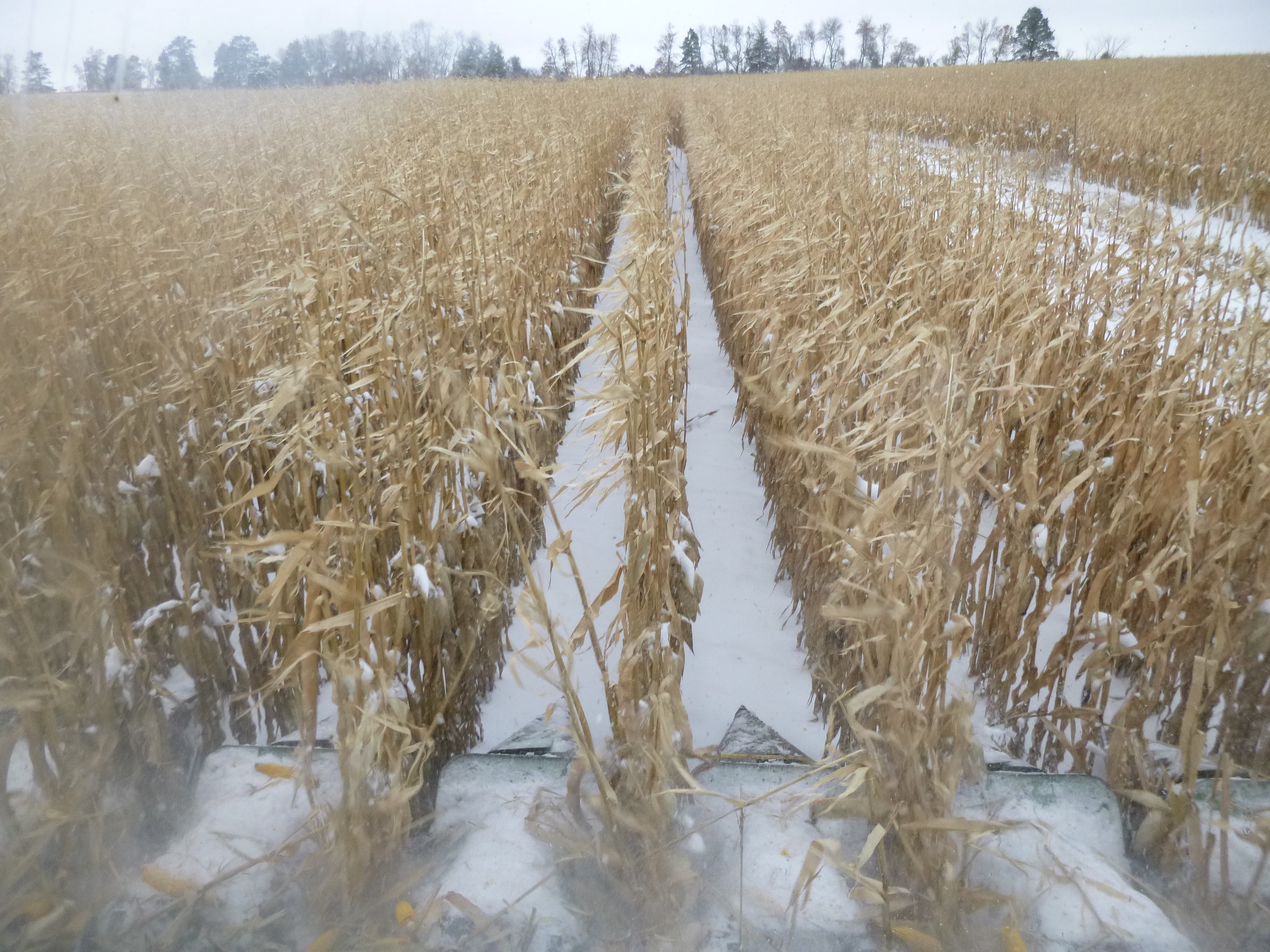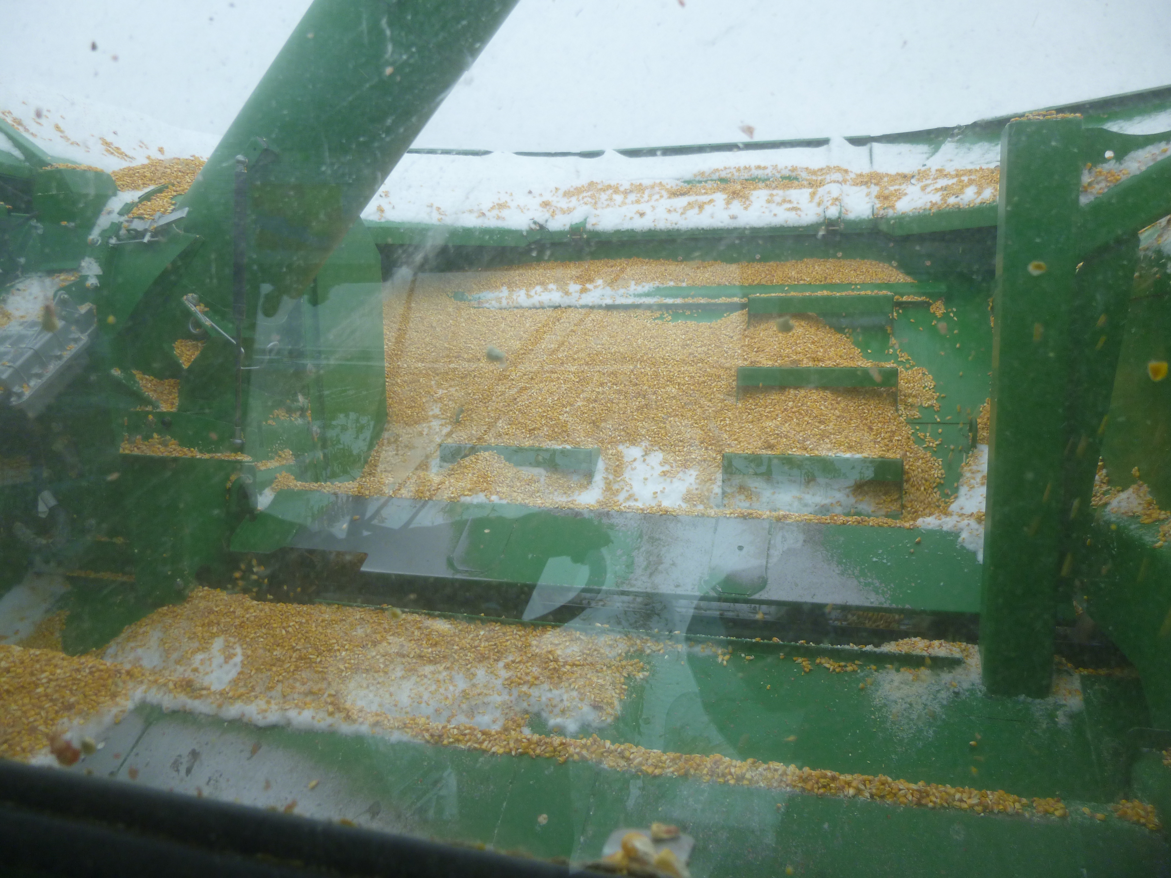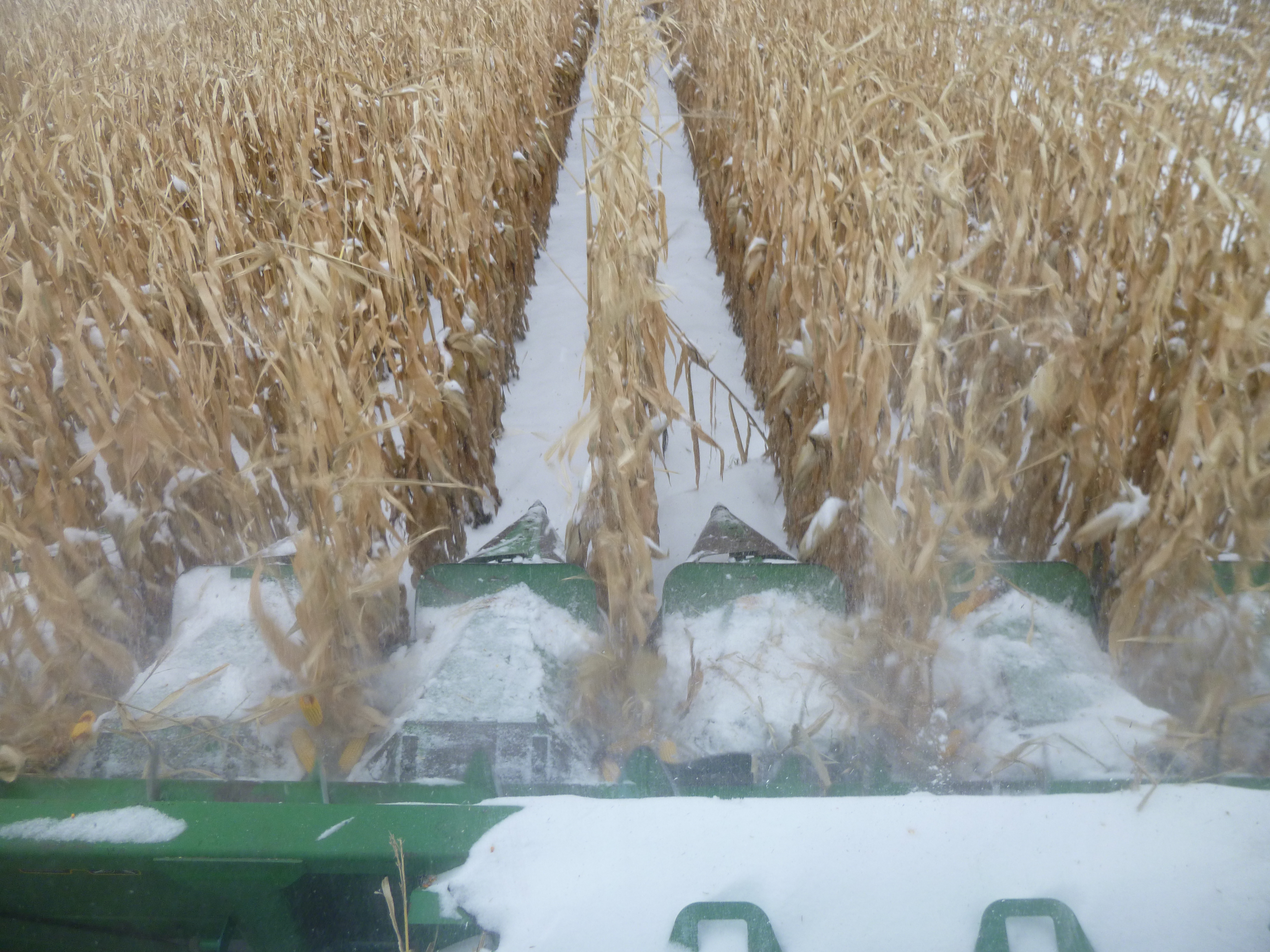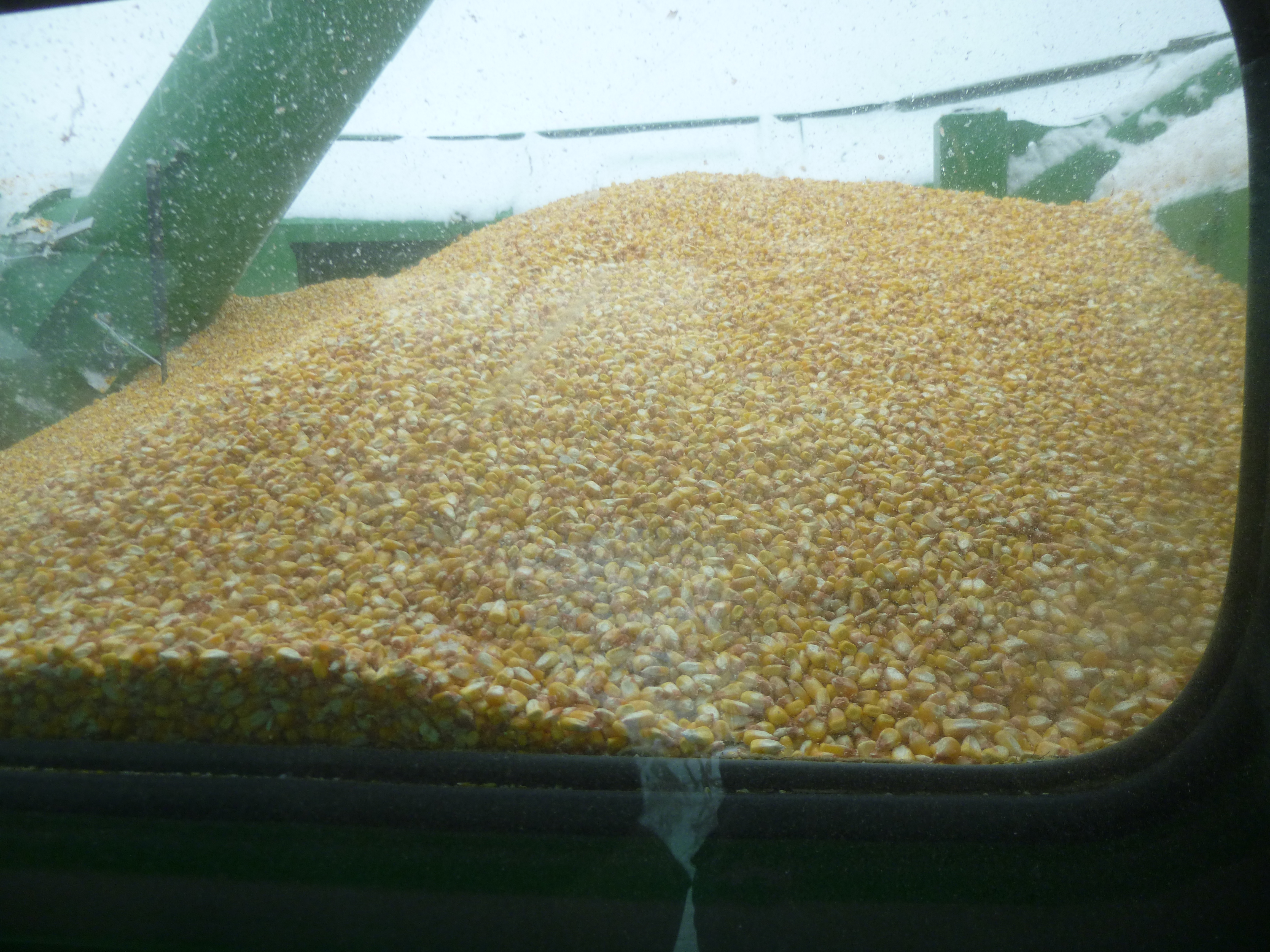 I slept like a log in my great-grandma’s brass bed (and felt like a lazy bum when I got up at 7:45; life on the farm begins earlier than that!) I woke up to a snowy, icy morning but they were going to go out in the fields anyway, so I asked if I could ride along in the combine for a little while as they were harvesting the corn. So after a good breakfast, I climbed in the semi-truck that is used to haul the corn or grain from the fields to the farm, and we headed out to the field where the combine was. I’ve never been in a combine except for sitting in a display model back in Iowa. As we headed out, we could see a coyote in the cornfield. Gary started the combine up, and I was astonished at how fast the corn was harvested. The combine (which has different attachments depending on what crop is being harvested) just ate up about 8 rows of corn at a time – stripped the ears of corn off the stalk; pulled the husks off; and got the kernels off the cob – in 15 minutes the entire back of the combine was full of shelled corn. Amazing. Then the corn was transferred to a waiting grain truck by an auger, and the grain truck holds 2 loads from the combine. The grain truck in turn unloads into the semi – and when the semi is full, the corn or grain is taken back to the farm where it’s dried (if necessary) and stored in grain bins until it goes to market. I was thrilled to be able to ride in the combine (an unexpectedly smooth ride) on land that’s been farmed by relatives since the early 1900s. I also had a chance to ride in the grain truck, and it can hold tons of corn. I think my great-grandpa wouldn’t believe his eyes to see how fast the corn is harvested – he used horses back in the day!