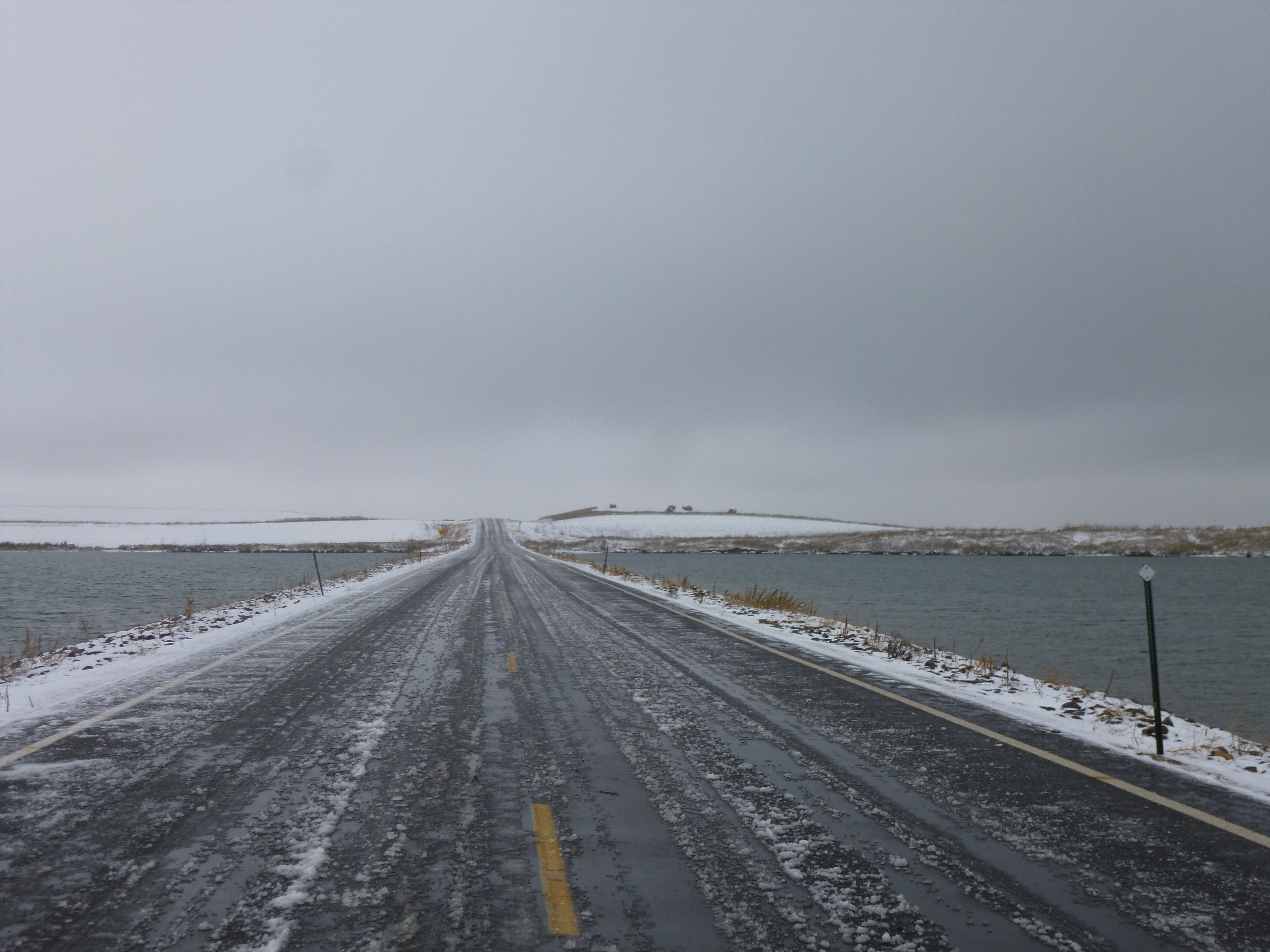 It was time to leave my new-found extended family, and Trudy made me a care package, and Tula and I set off through the snowy, icy streets. It was quite a mess out! I stopped at the Lily cemetery to pay my respects to the great-grandparents and great-aunts and uncles. I hope I will be back again someday! The first town I came to was Webster, and I stopped at the local newspaper office for an interview. Both Trudy and Carol had thought the paper would be interested in my story, and a reporter asked if I could stop by. I met Amanda and she was a very pleasant young lady with a lot of questions, and it was nice to sit in the warm office and talk. But then I had to finish up with my walking – today was technically my first North Dakota day, but I still had 5 miles of walking to finish off in South Dakota before crossing into North Dakota. I walked a little over a mile in the slush in Webster, then drove on to the town of Groton where I got another couple miles of walking in. It was still cold and snowy up there, and I was beginning to think my weather luck had worn off! Tula likes the snow and had been pouncing around in it and scooping up mouthfuls – she’s always eaten snow. She’s been skittering around in it like a puppy! I stayed cozy warm in a jacket that Gary and Trudy gave me – I lost my favorite fleece jacket somewhere in northern Arizona and was going to have to get another jacket, and then they gave me one that no one wore.