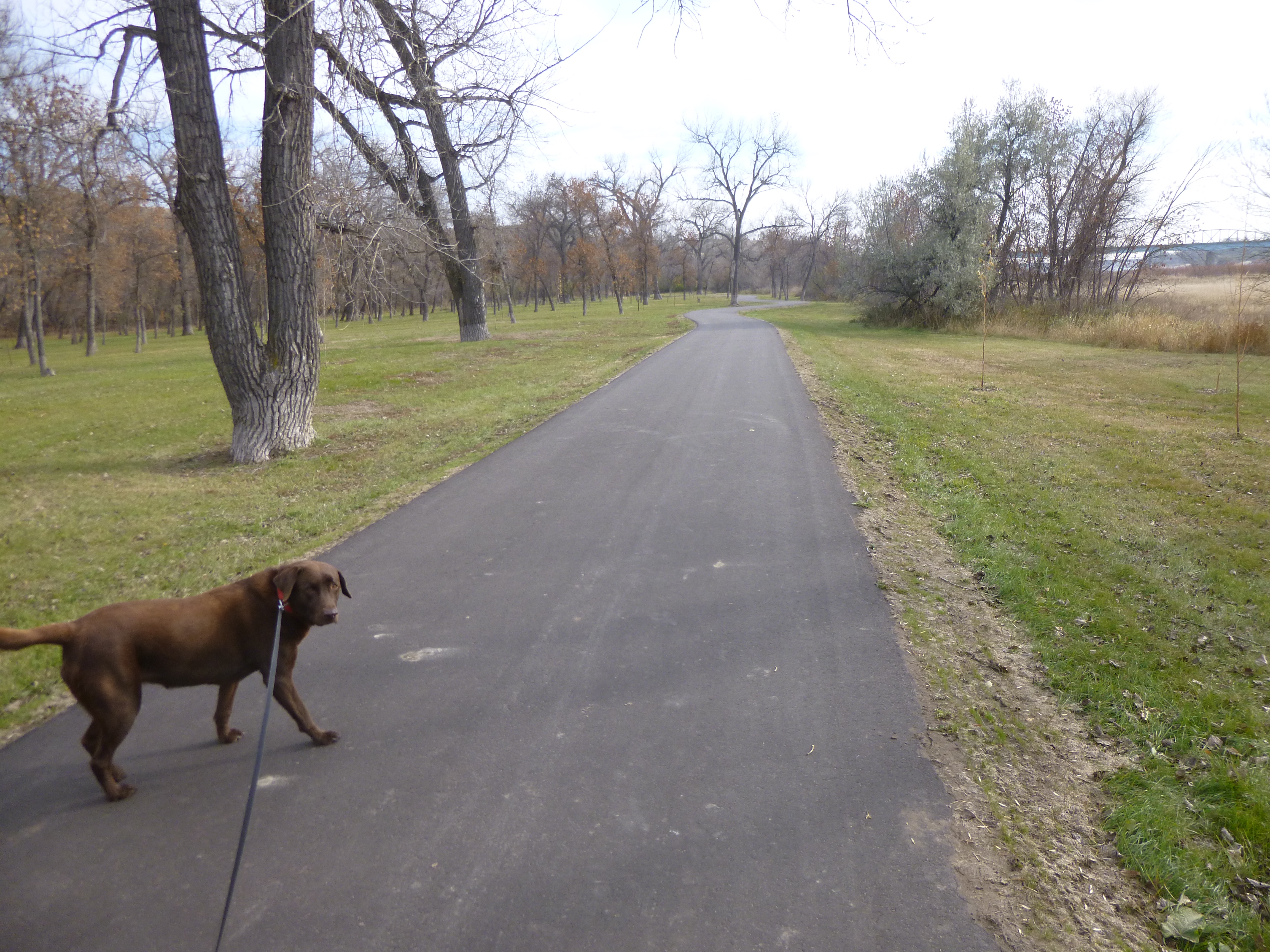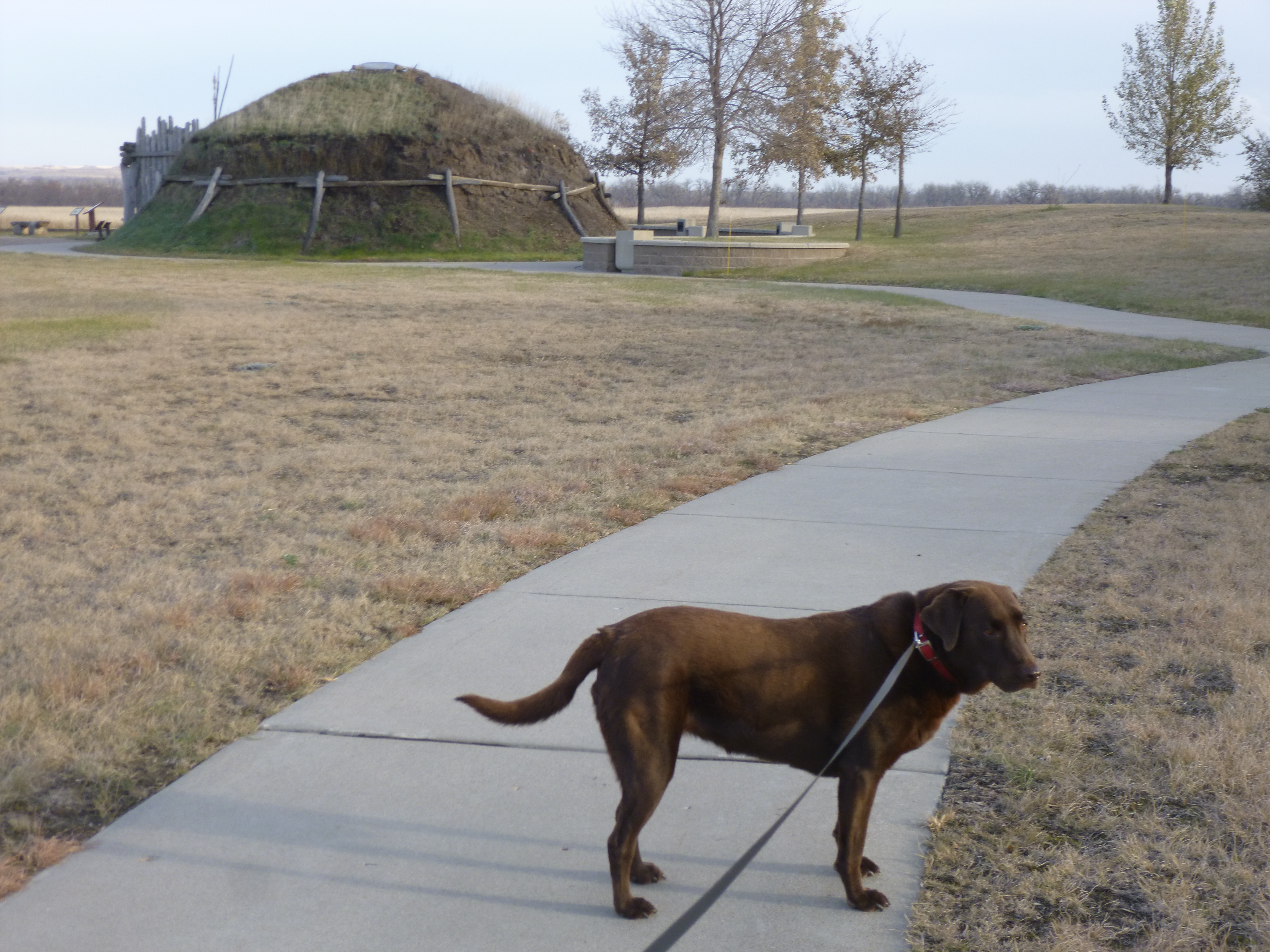 With my donations done, I was going to concentrate on my walking for the rest of the day. I started off with a mile and a half in one of the historic residential districts, and then headed for an arboretum for some more walking. From there I went back to the Missouri River and covered another mile and a half walking along the river. Then I drove north for a while, up to the Knife River Indian Villages National Historic Site. I went into the visitor center, then Tula and I walked on the trails past the old village areas. The Knife River Indians lived in round sod houses – many of them all clustered together with hardly any space between. When the villages were abandoned, the round sod houses eventually collapsed into the ground, leaving many visible mounds on the ground. It is not known why the houses were built in big groups so close together – except maybe for defense purposes. We scared up at least 10 pheasants on our walk, plus I had seen a couple back at the arboretum. They seem to be all over!