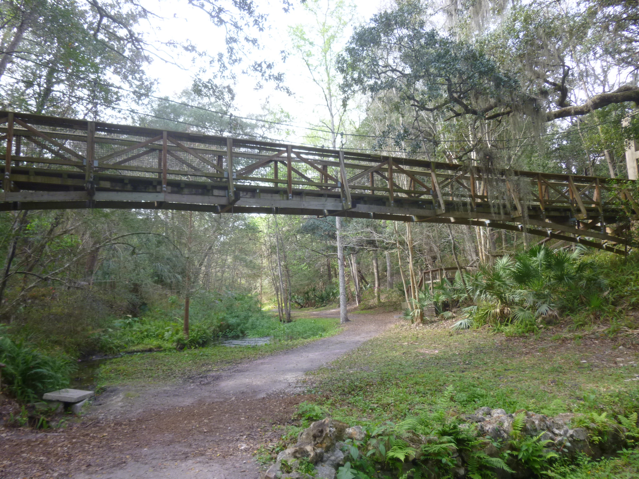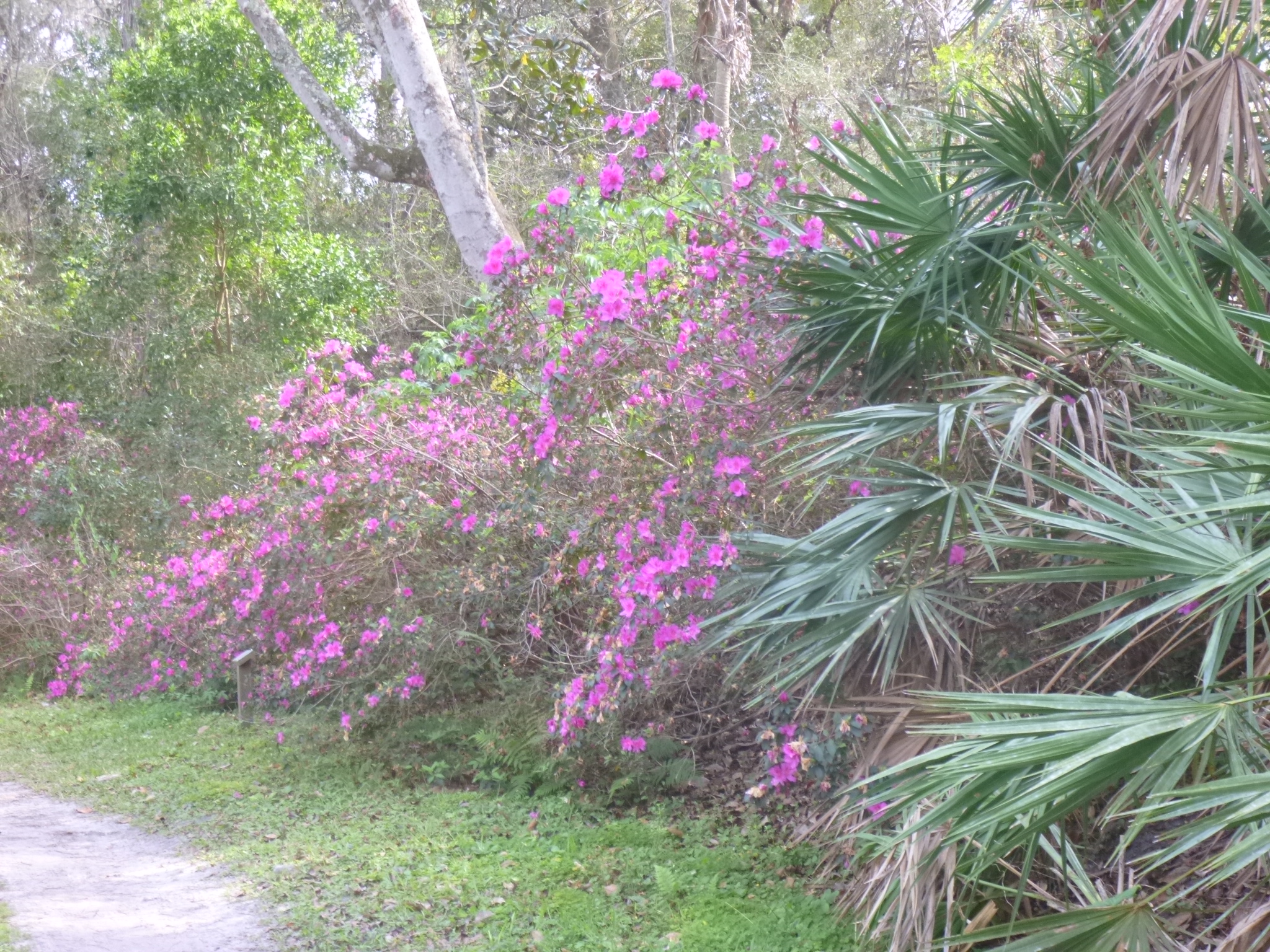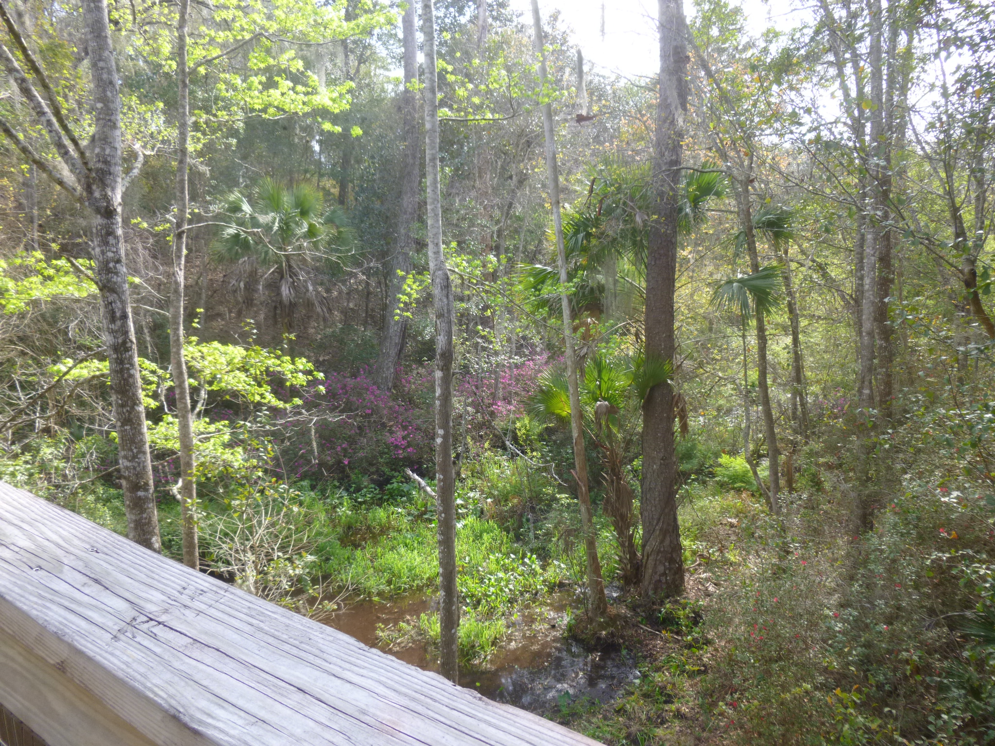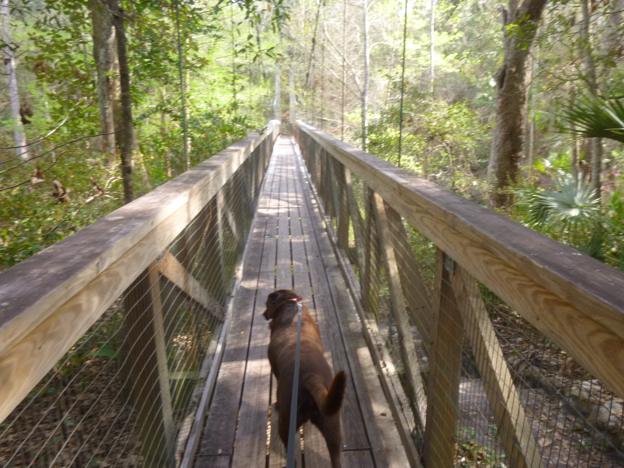 Then I drove out to Ravine Garden State Park, and Tula and I walked nearly 3 1/2 more miles there. They’re getting ready for their Azalea Festival in 10 days or so, and lots of azalea flowers were in bloom, so it made for a pretty walk. There was a scenic drive around the whole park which Tula and I walked, and we went down into the ravine on the trails too. We crossed part of a swinging bridge over the ravine, but Tula was a little hesitant of the unsteady footing!
