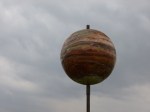 Somehow that had taken a good chunk of the morning, and I was eager to get out walking because the skies were looking pretty gray again. My plan was to drive straight north along US 1, stopping to look at the largest scale model of the solar system too (thank you to Joe K for telling me about this!). The scale was 1 mile = 1 astronomical unit (which a brochure reminded me was 93 million miles which is the distance between the sun and the earth.) So in this case, the earth and sun were 1 mile apart, and Pluto and the sun were 40 miles apart. This really all helped to put the solar system in perspective in understandable terms. I started at the Pluto end and worked my way north. The Univ. of Maine students who made this also kept the size of the planets in scale, and Pluto was just a tiny little 1 inch ball, and the sun is so big by comparison that only a portion of its curve takes up the whole first floor in the science building at the university. Along the way on our trip through the solar system, Tula and I got out to walk a mile in a tiny little town, and then I found part of the rail trail that I knew was there somewhere, and we walked 4 miles – 2 miles straight out into the Maine wilderness, and 2 miles back. I was in good moose territory – passing by some marshy areas, but didn’t see any. This part of Maine is also potato country and on the drive north I passed countless potato fields, and there were stands alongside the road selling 50# of potatoes for $10.