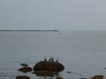 Despite the continuing gray skies, the rain held off more or less, and Chris and I spent a few hours walking all around Hammonasett Beach State Park which is right on the Atlantic Ocean. We walked from one end of the park to the other and covered 4 miles, although some of it was a slow go because we walked along the beach all the way out to the point, stopping to look at seashells, crab shells, and an ugly robin fish just laying on the beach (it looked like it had little legs and a fisherman told me a seagull would come eat it). We climbed on some rocks and thoroughly enjoyed our time together. The gray skies kind of blended into the gray sea and it was still really pretty out. This part of the ocean is actually part of Long Island Sound, not that we could see any land or anything. Rick had just dropped us off earlier and we called him when we were back to the entrance, and he’d been driving around some of the other small towns in the area, and had found a fun place for some lunch. It was a dilapidated old lobster shack right on the beach which had been there for 130 years – they just patch things up after bad storms and continue on with business! The only things on the menu were lobster rolls or hotdogs, and the lobster rolls were awesome. Good rolls were toasted on a BBQ grill, and then overstuffed with a lot of lobster meat, and seasoned only with butter and fresh lemon. Mmmm!! (Again, it was a treat from my sister – she’s spoiling me!) The picnic tables were set up on a “floor” of shells and stones, and I imagine they’re usually just outside, but since the day was a bit chilly and damp, they had lowered some clear plastic tent-like walls and turned on some heat to keep us all comfortable. A great find! We walked into the other shack where the lobster boats drop off their catch and looked at some pretty big lobsters.